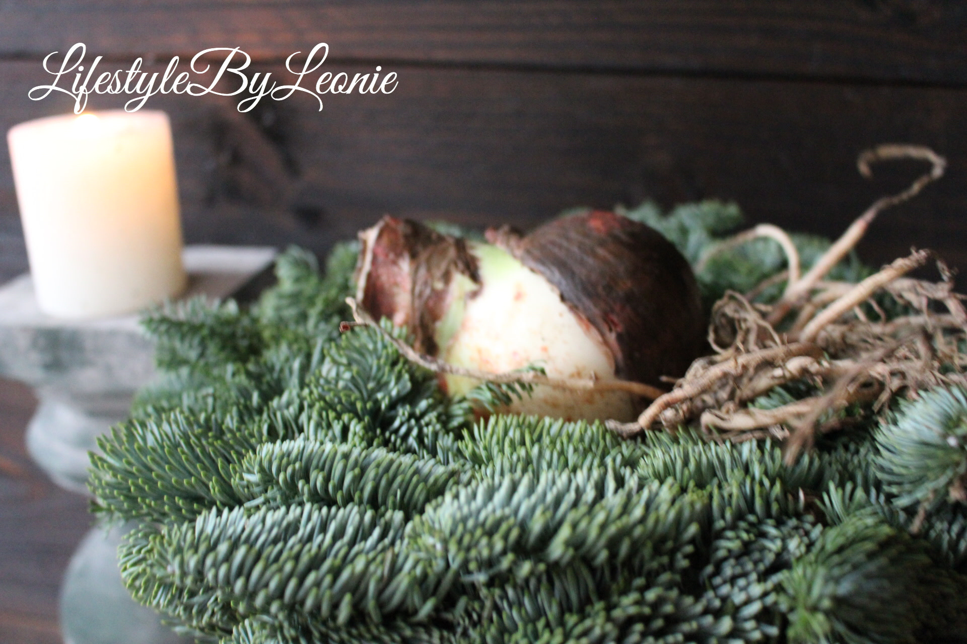 Mooie dikke amaryllis bol waar een witte bloem uit komt.