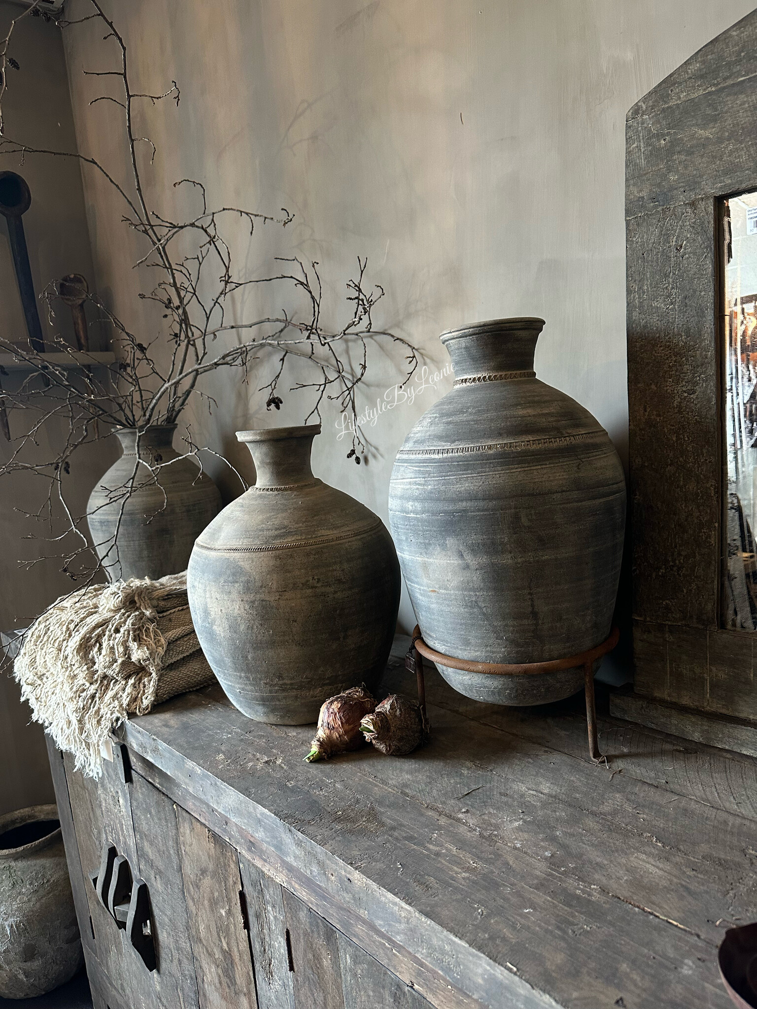 Prachtige oud ogende kruik van Aura Peeperkorn. De kruik staat op een metalen ring en is een echte eyecatcher in uw woning.