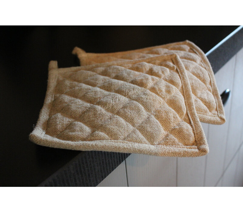 Mooie Aura Peeperkorn pannenlap van de wel bekende linnen stof. Past natuurlijk perfect in de landelijke / sobere keuken.