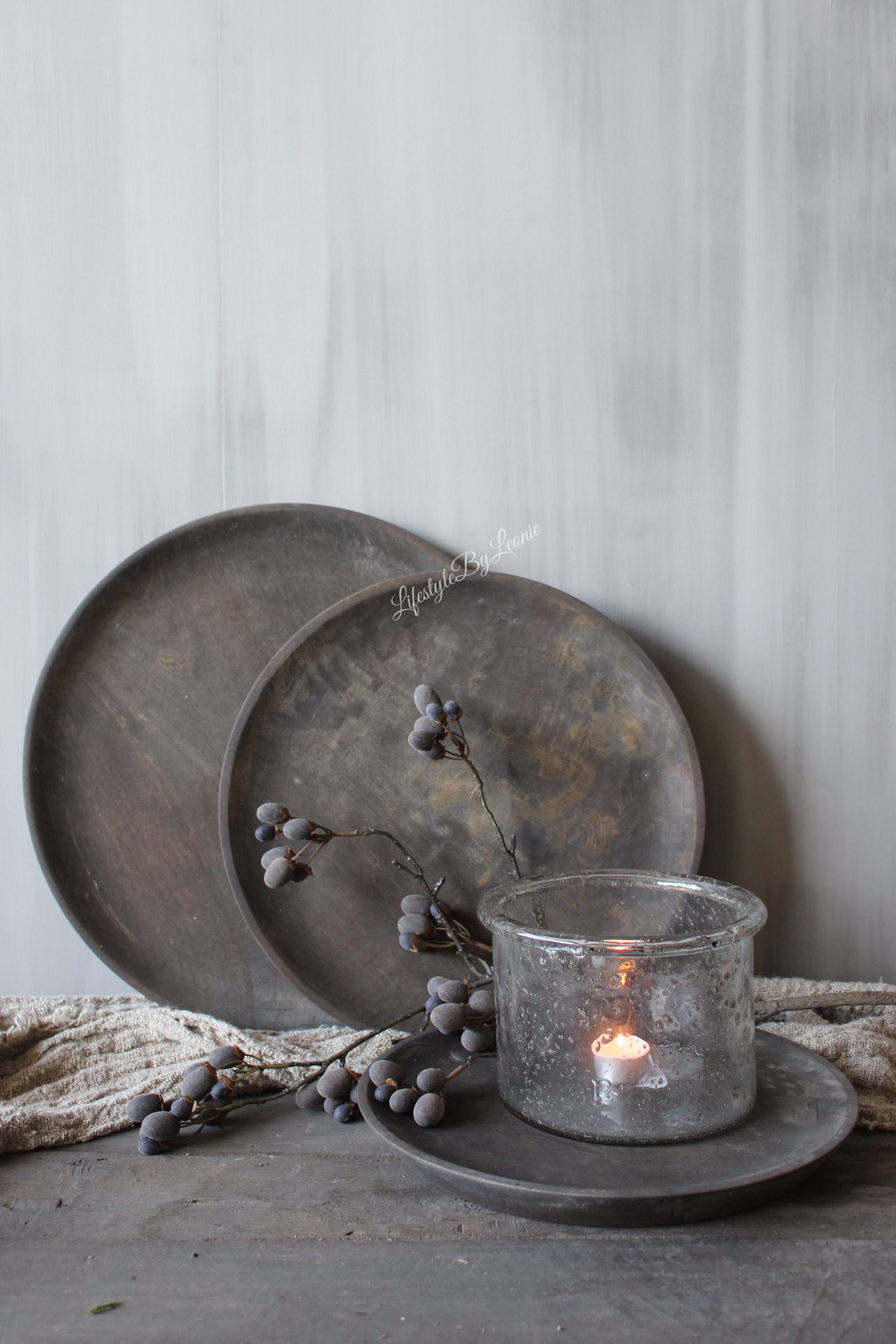 Mooi houten bord van Aura Peeperkorn in een grijze kleur. Het bord heeft een doorsnede van 35 cm.