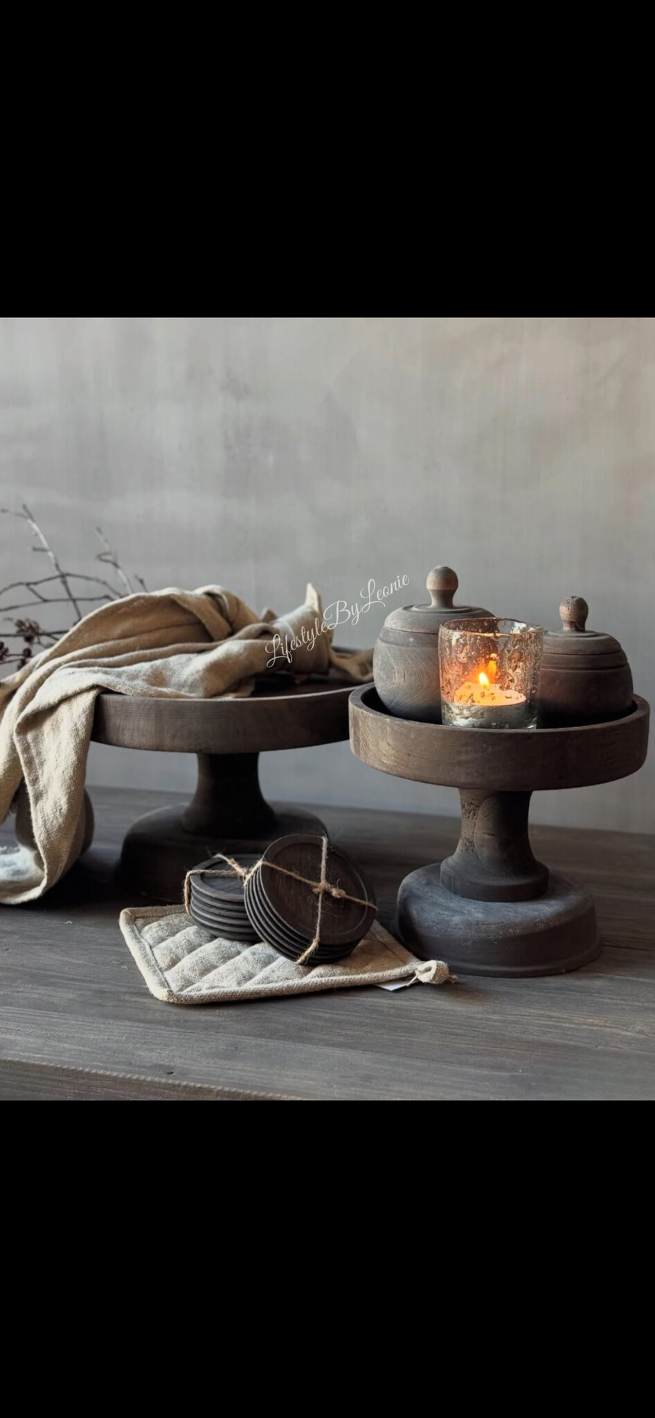 Mooie massief houten plateau op voet van Aura Peeperkorn. Leuk met decoratie, met een aantal windlichten of juist met een glazen stolp.