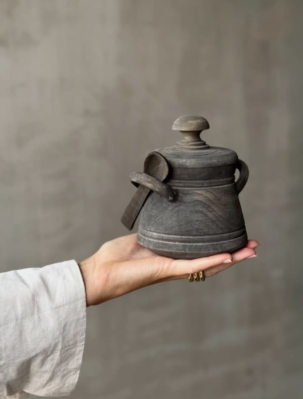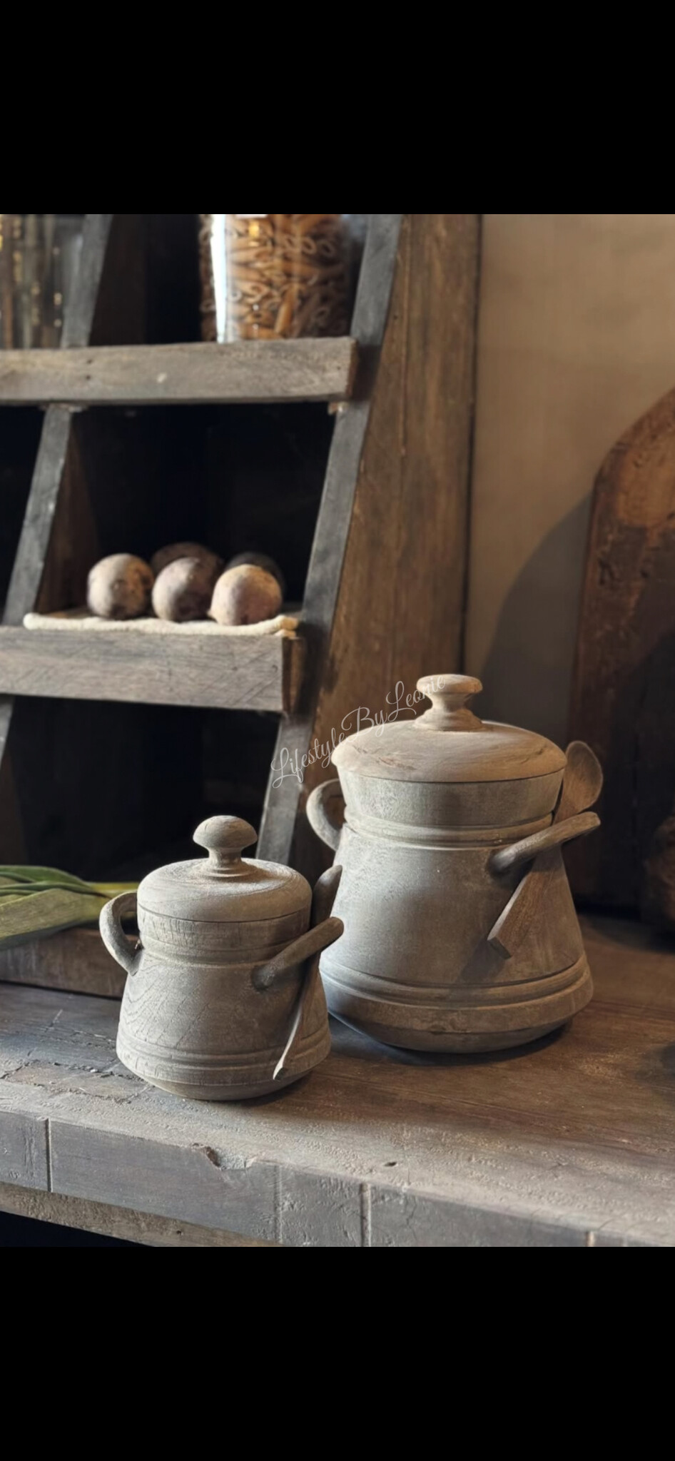 Superleuk houten suikerpotje van Aura Peeperkorn. Een sfeervolle accessoire voor een landelijke keuken. Het potje heeft een deksel en een klein lepeltje, dat precies in één van de oortjes past. Voor suiker of kleine lekkernijen of gewoon als decoratie.