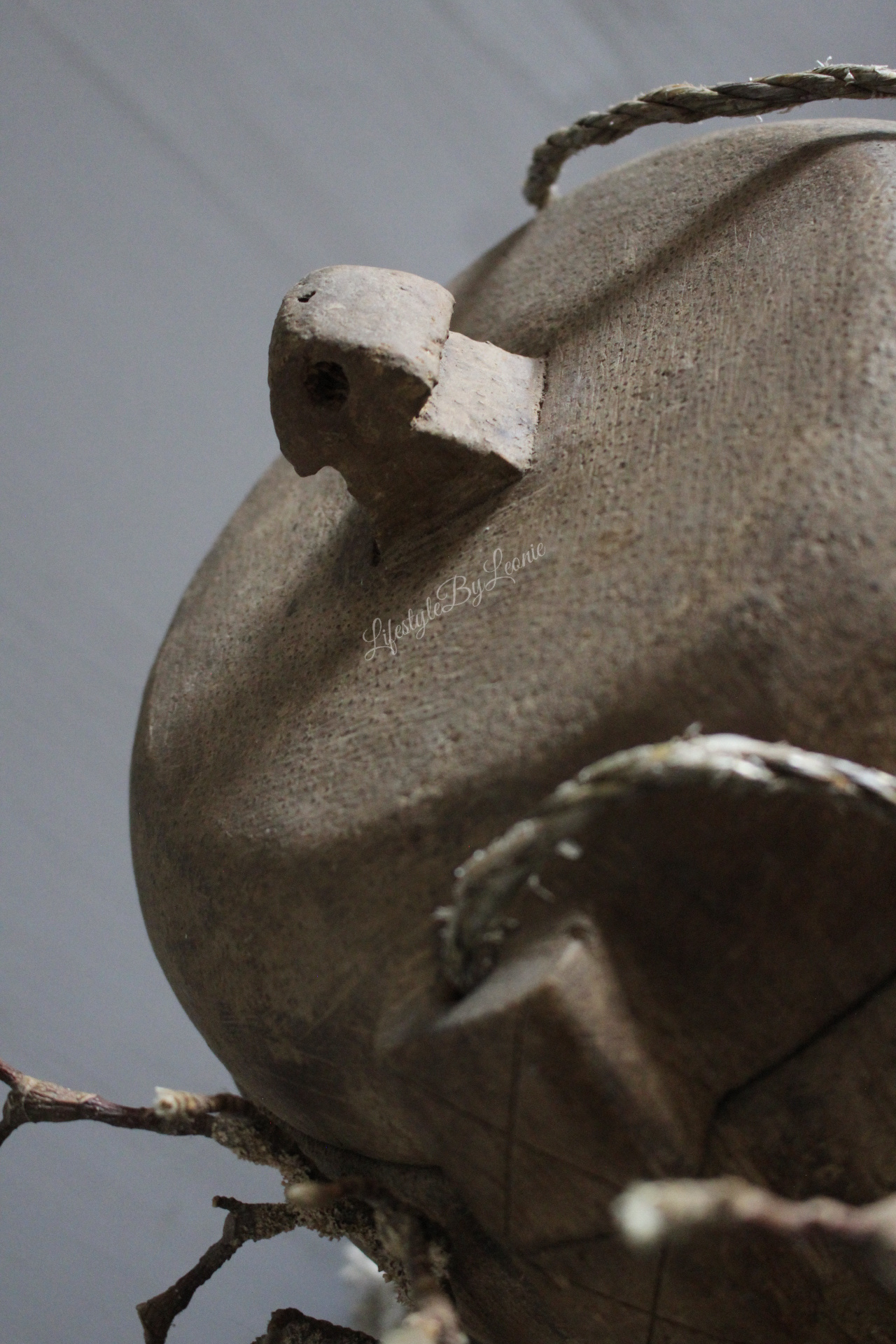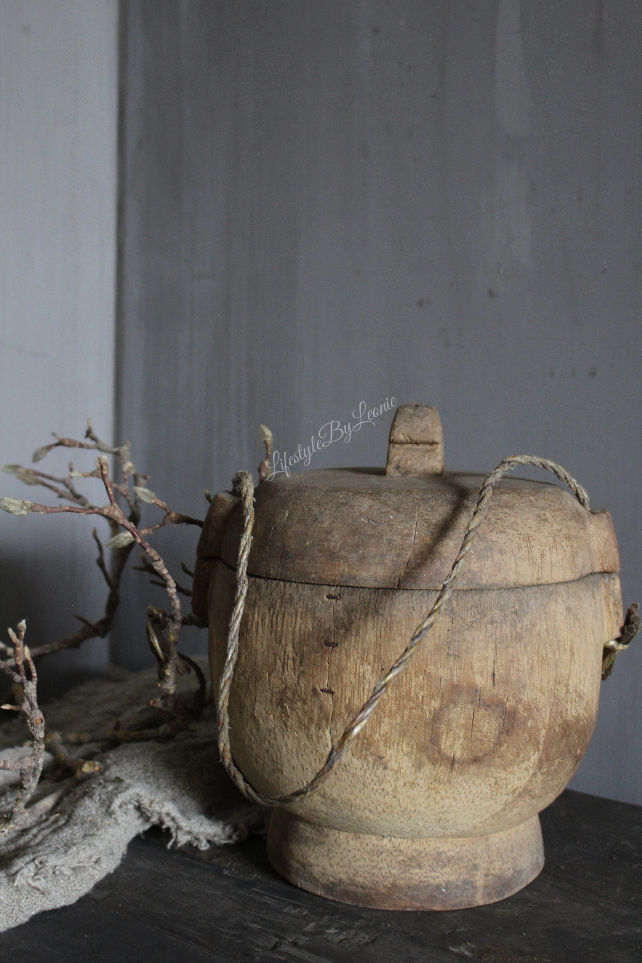 Mooie authentieke oude houten pot met deksel van LUKSA. Elk item is uniek, oud en gebruikt, geen enkele is gelijk.