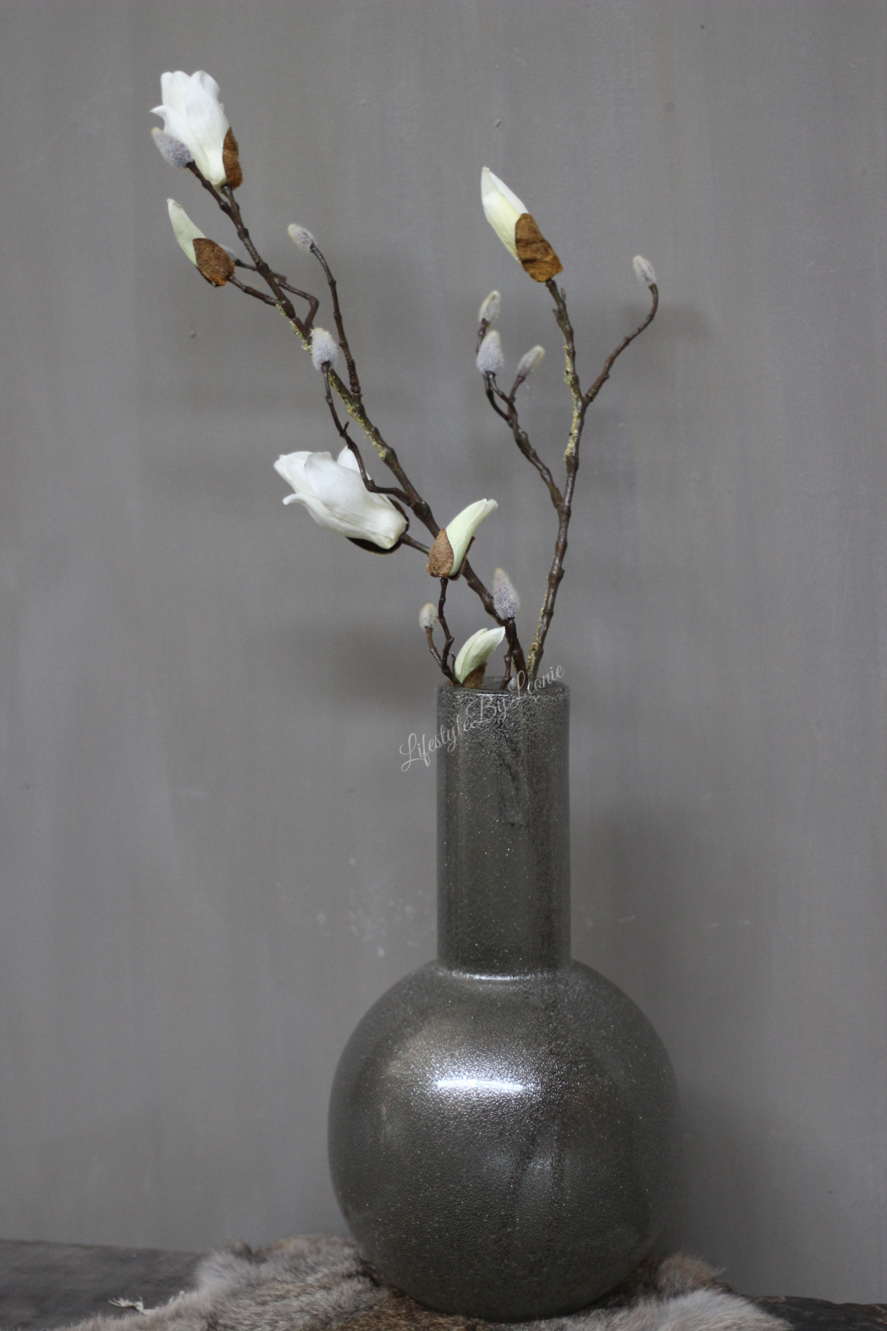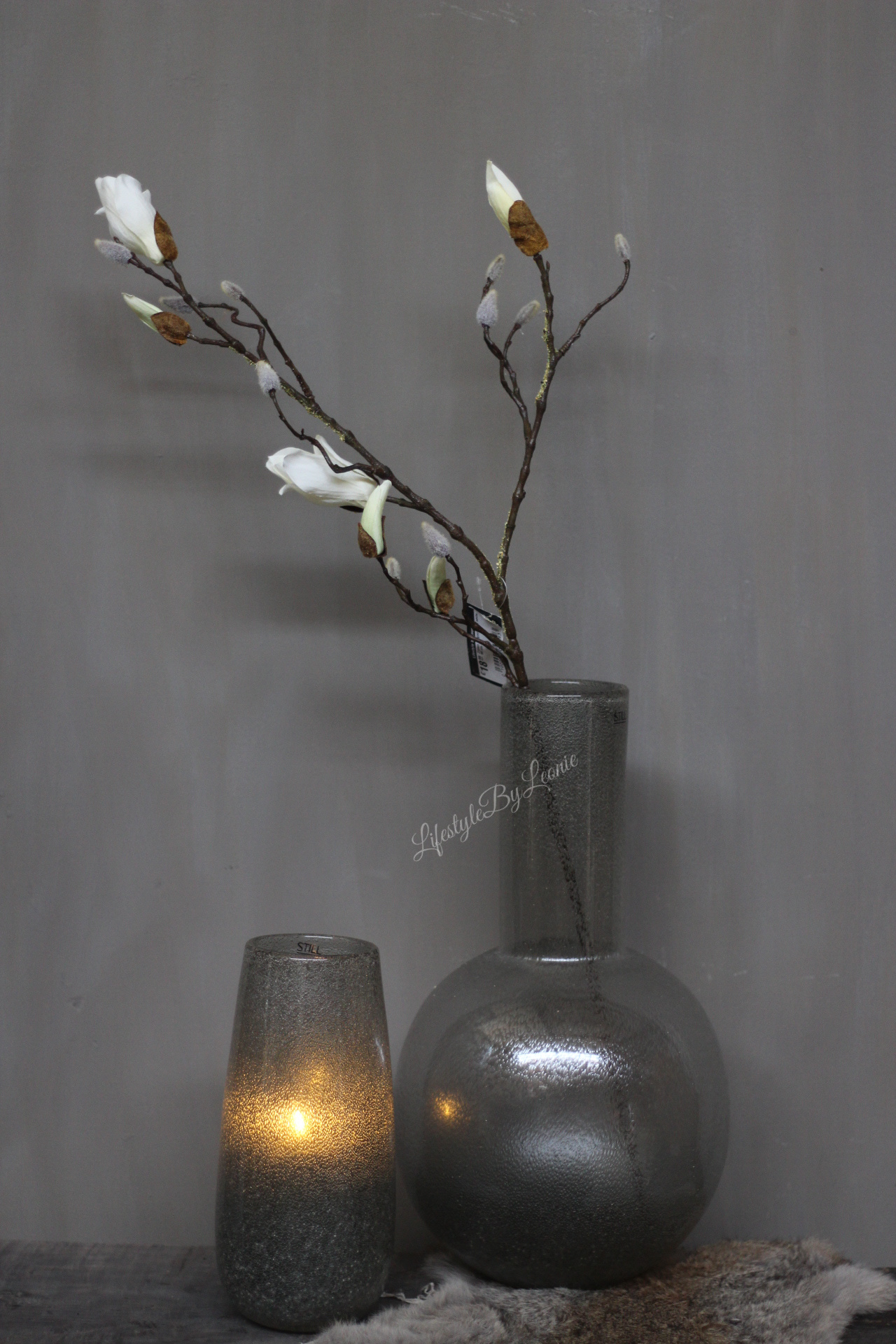 Mooie chique en toch stoere hoge vaas. De vaas is 43 cm hoog en is gemaakt van grijs glas met kleine bubbeltjes.