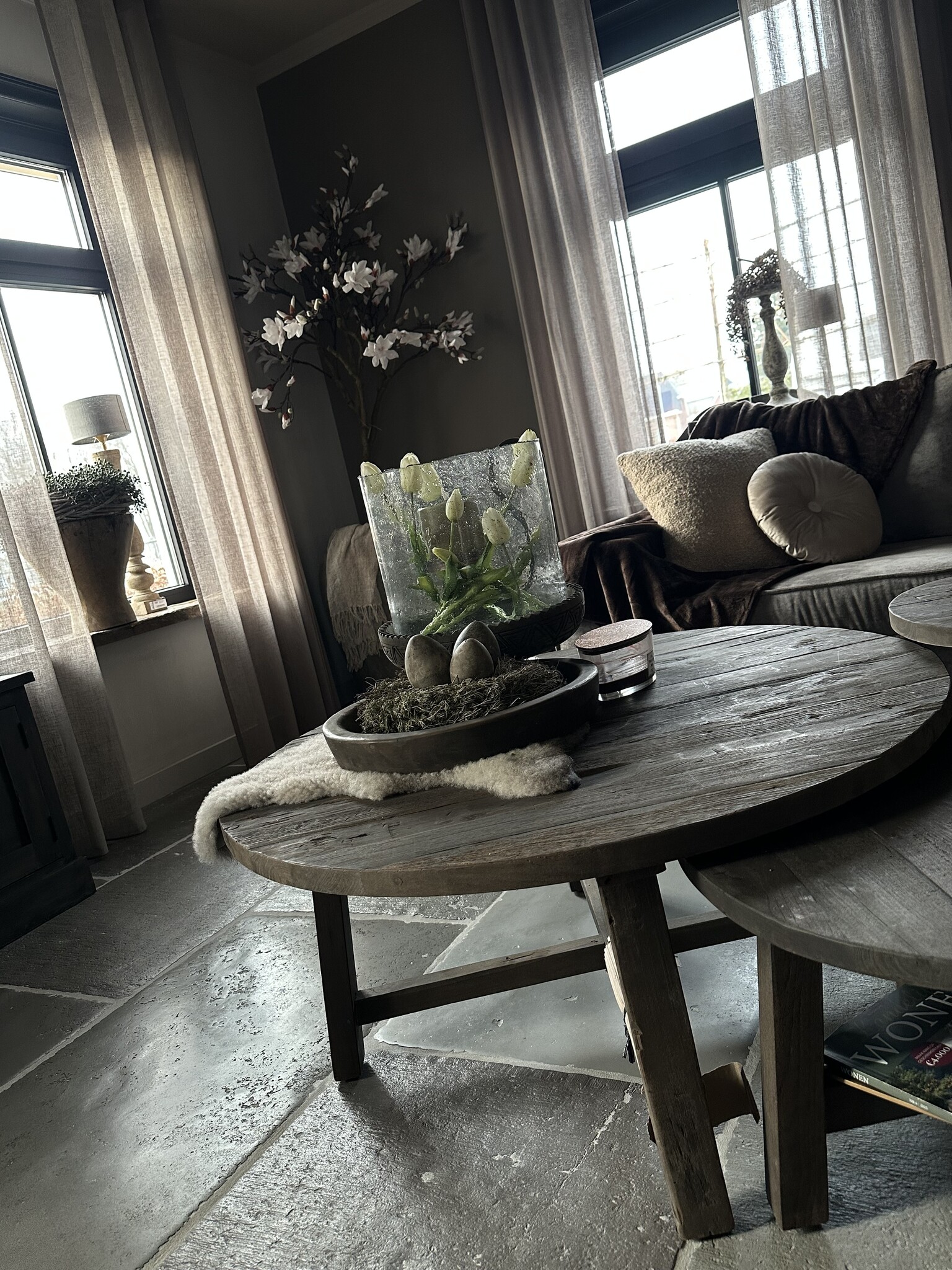 Unieke zware houten vijzel bak van Luksa. Elke vijzel is uniek. Deze vijzel is uit één stuk hout gesneden en staat erg leuk met een nobilis boompje, krans, dadeltak of een groot windlicht.