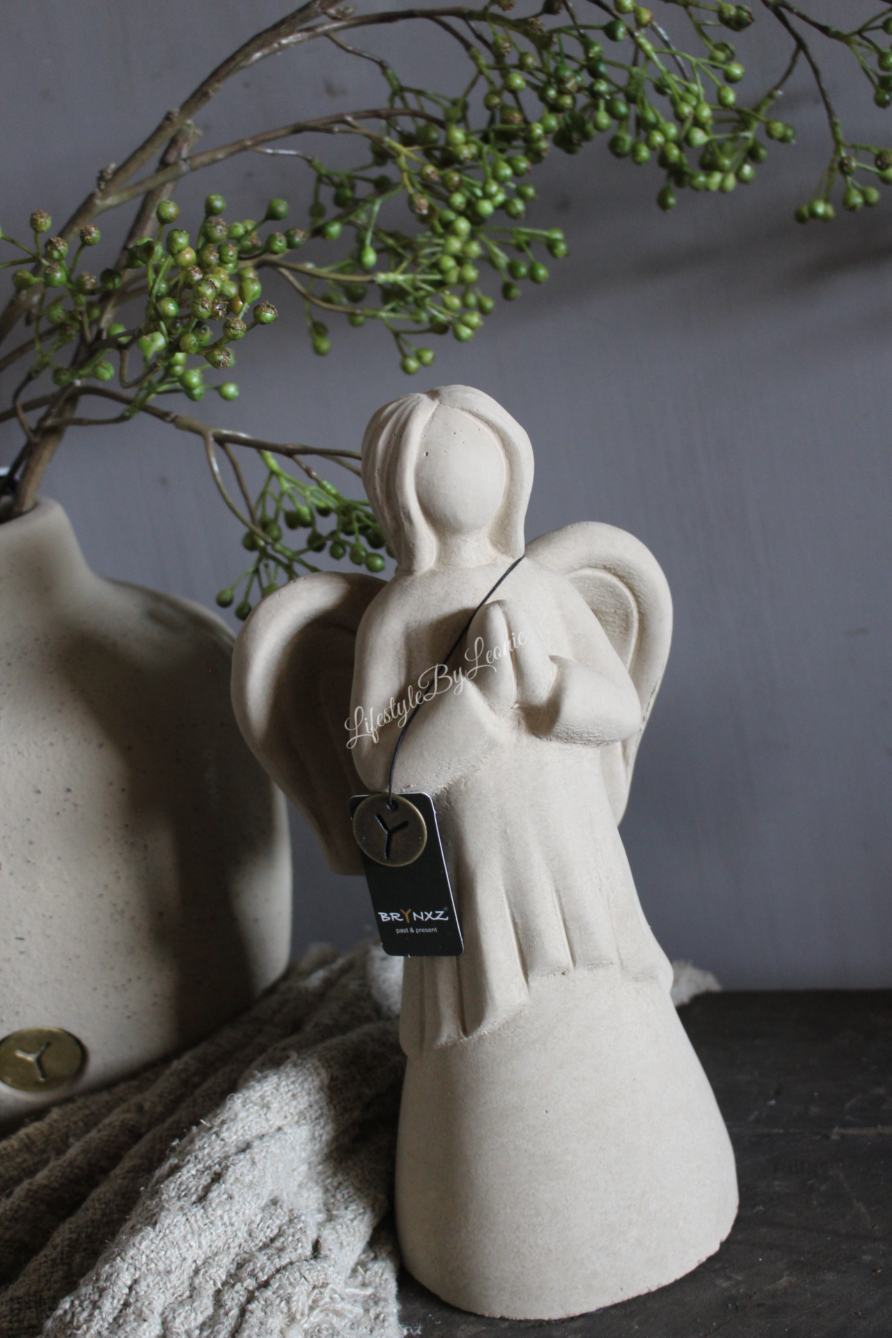 Mooie sierlijke stenen engel van Brynxz in de kleur taupe. De engel is 23 cm hoog.
