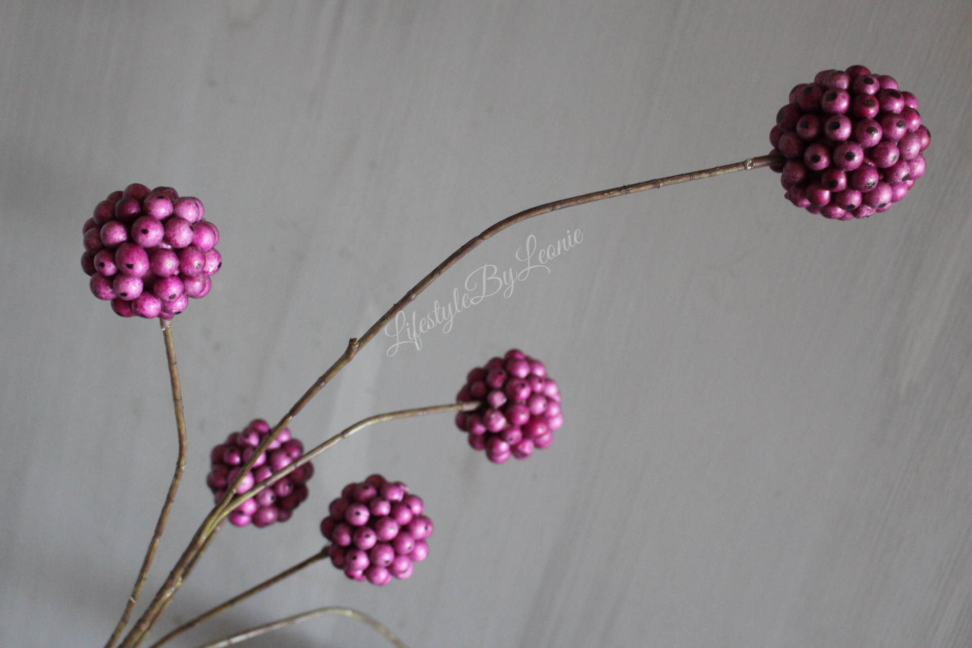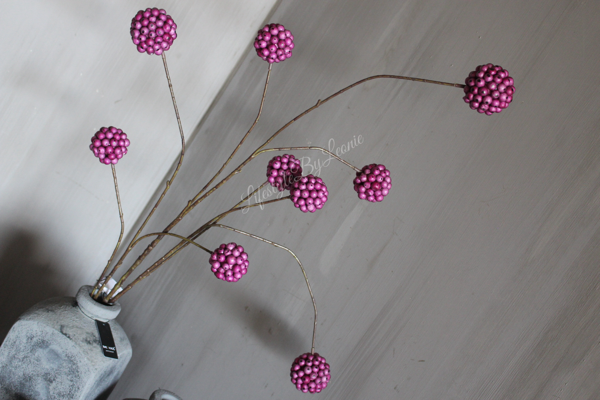 Mooie grote berry ball kunsttak van Brynxz. Een berry ball is een bol met besjes. De besjes hebben een paarse kleur. De tak is 126 cm groot.