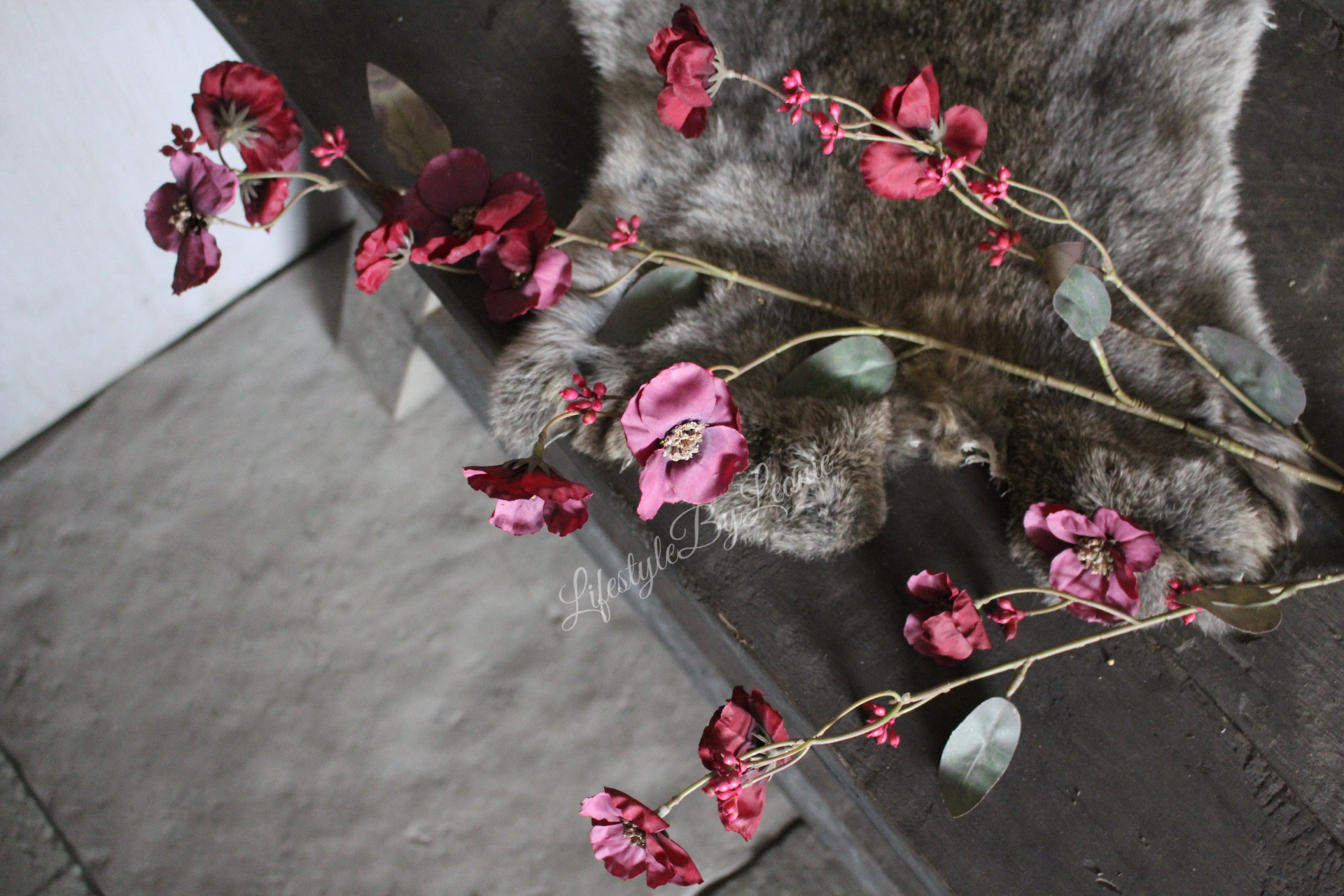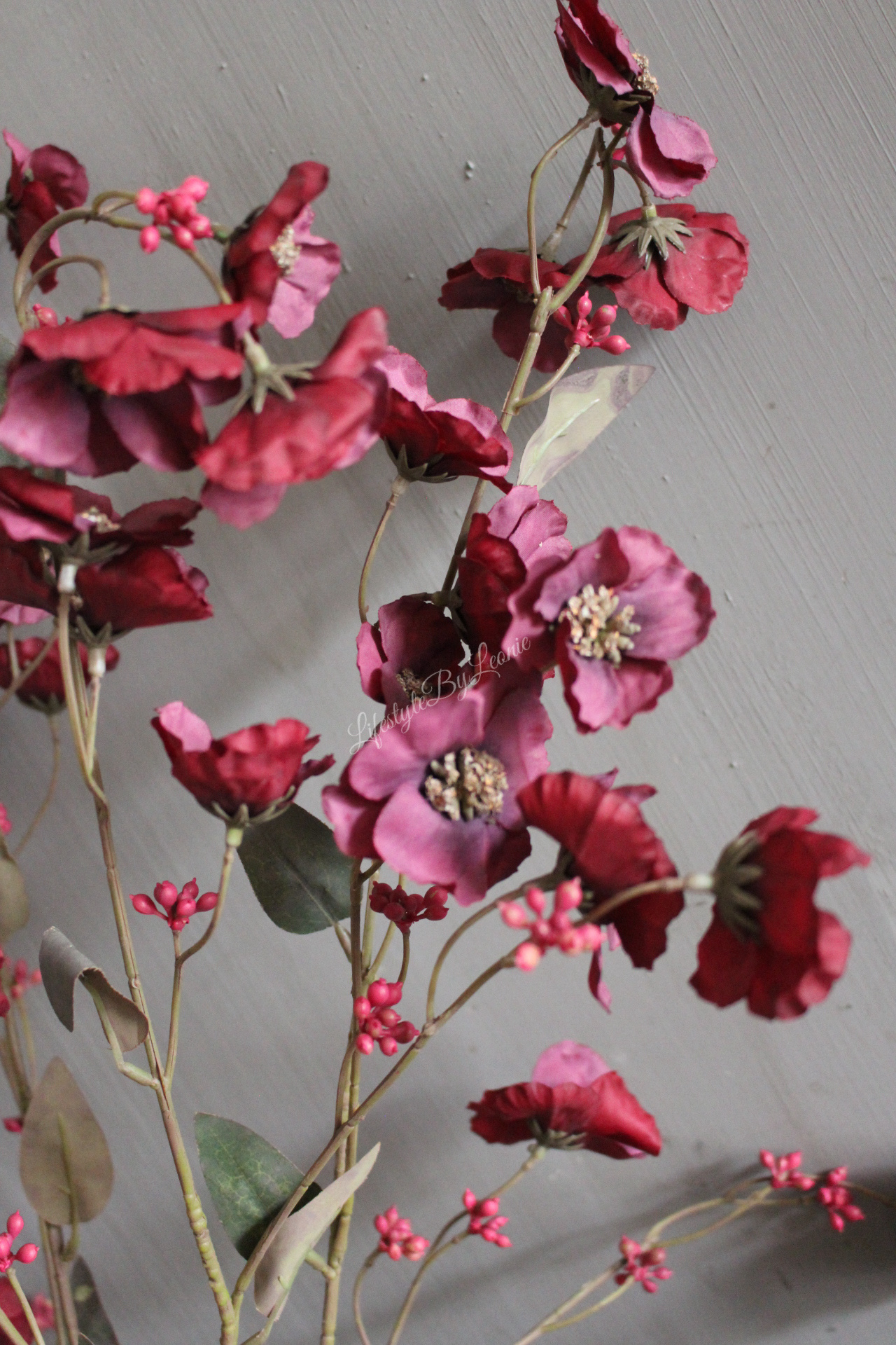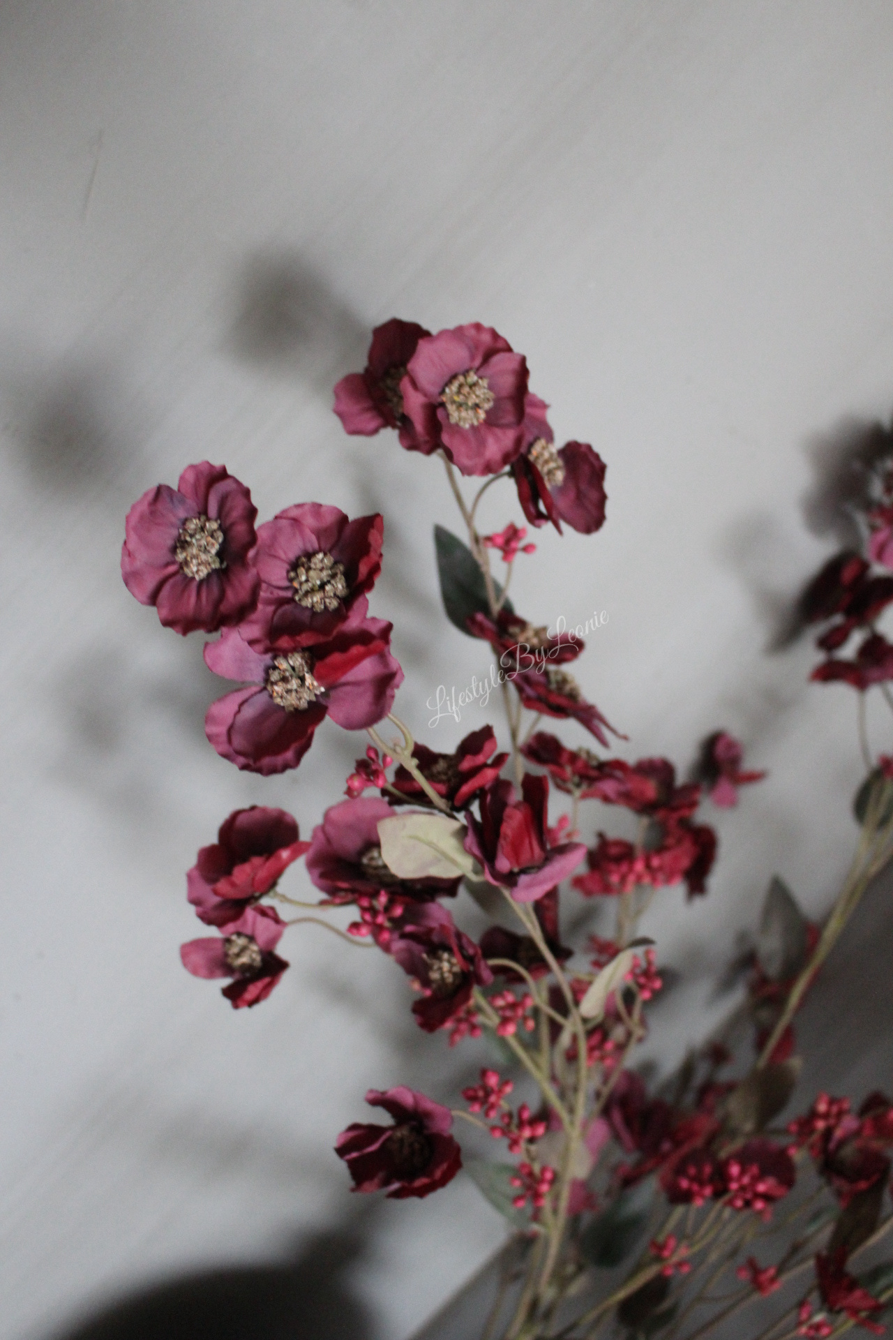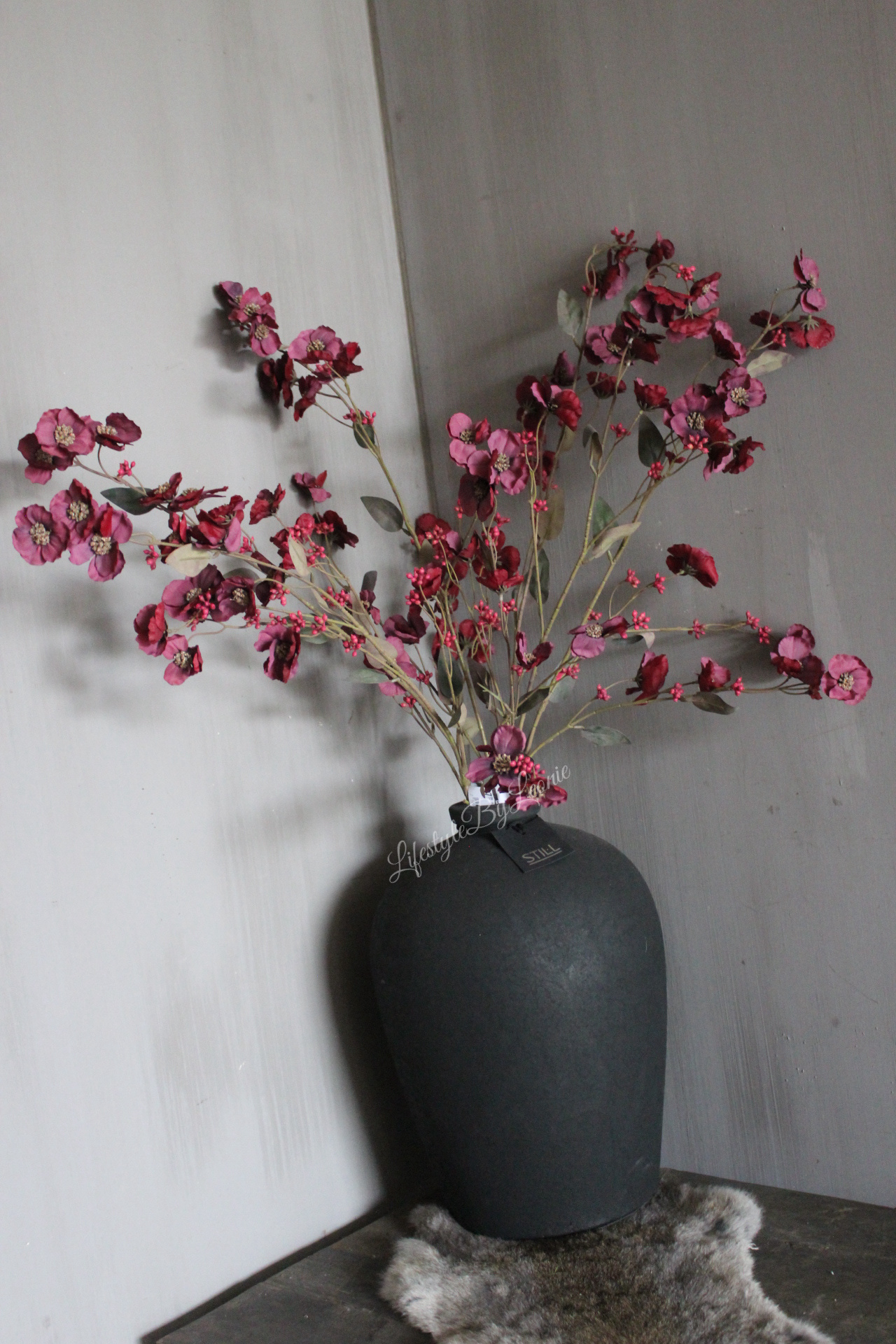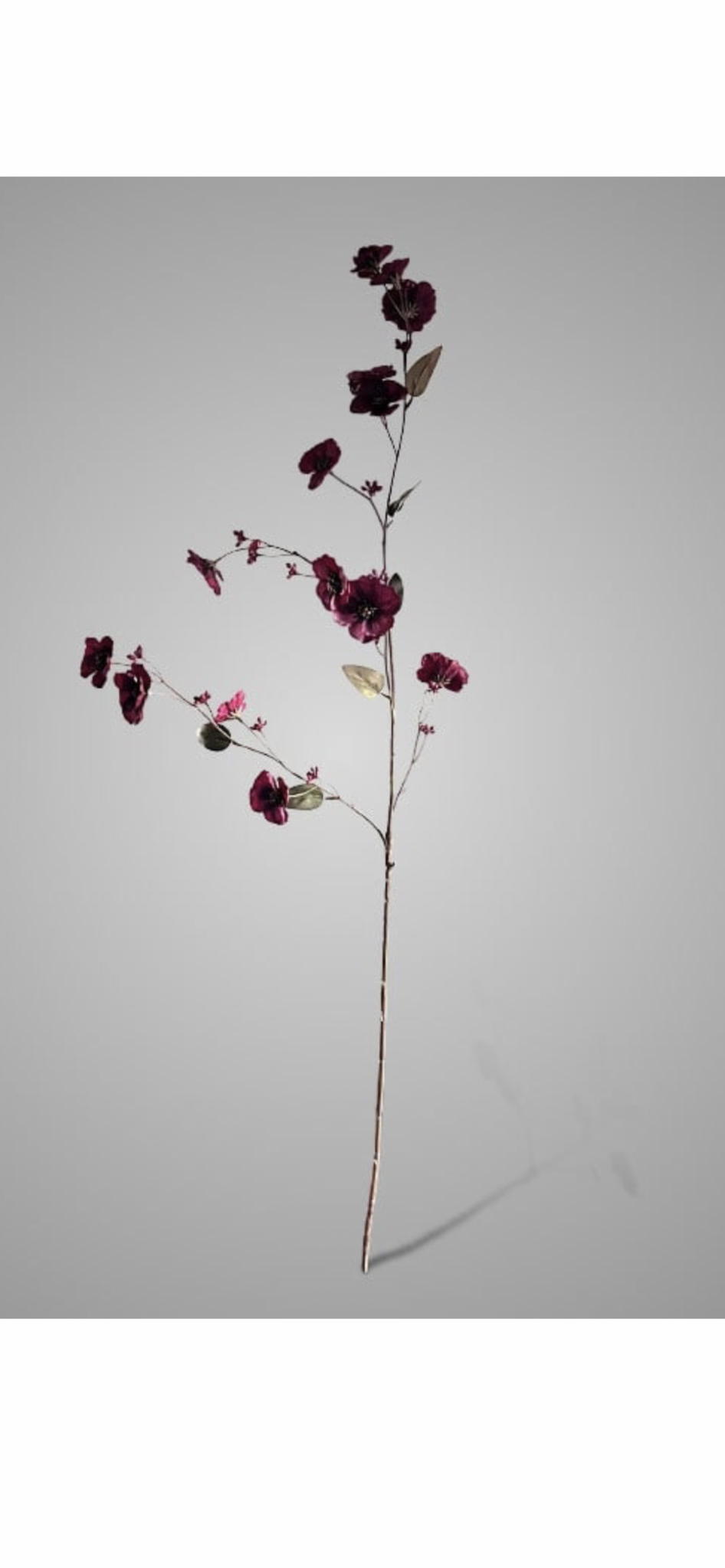 Een hele mooie lange zijden Hibiscus kunsttak met bloemen in een hippe aubergine kleur. De tak is 100 cm lang.