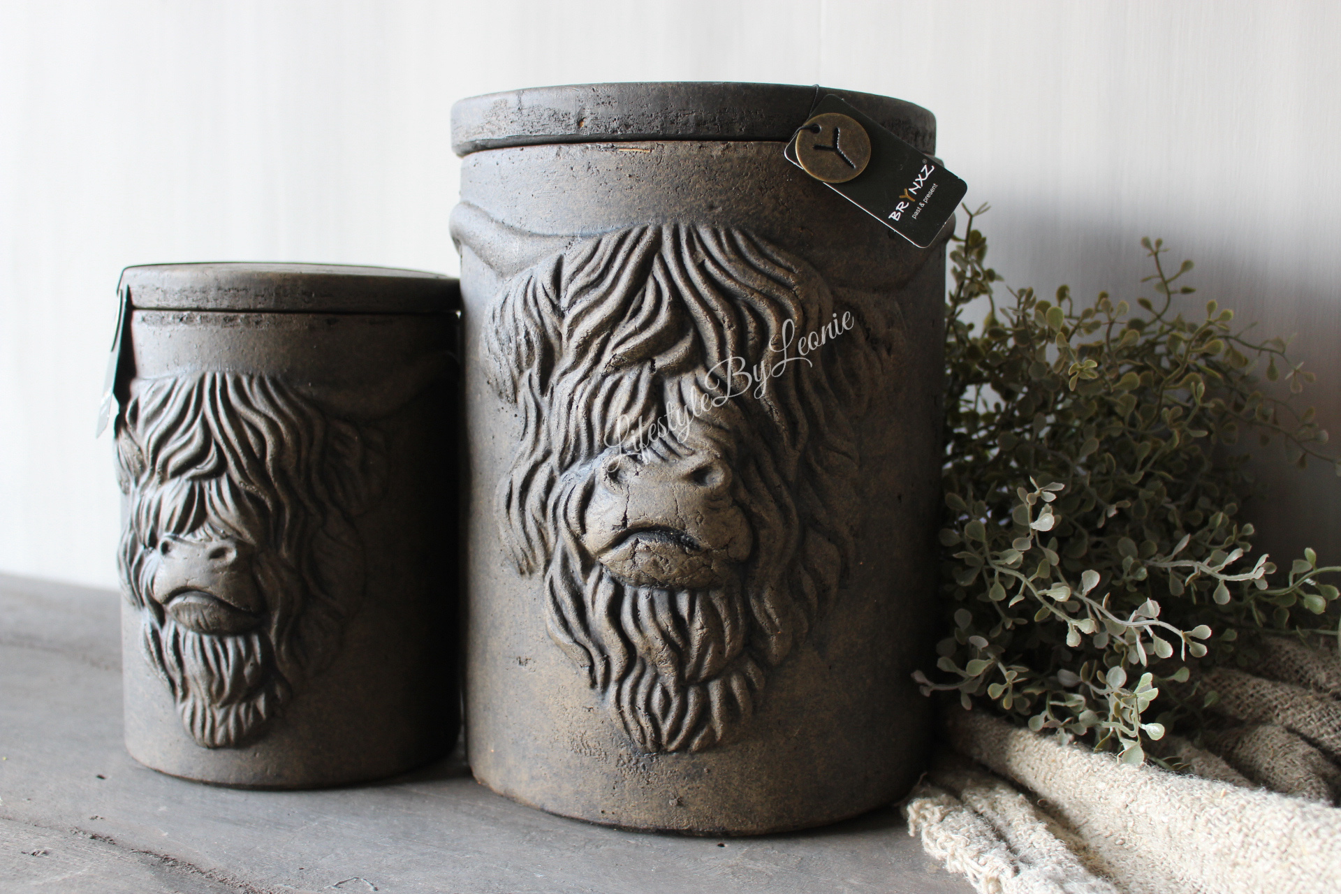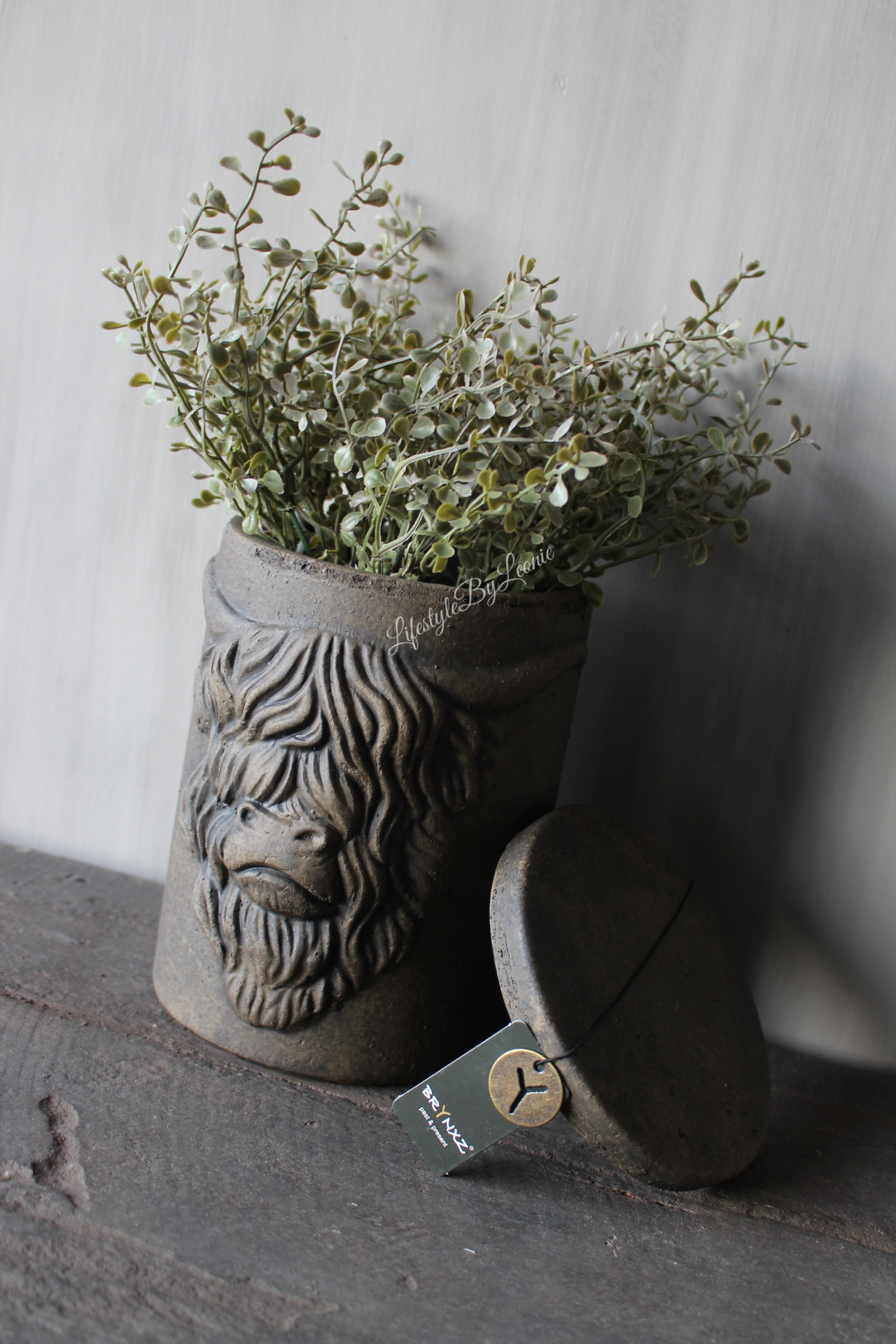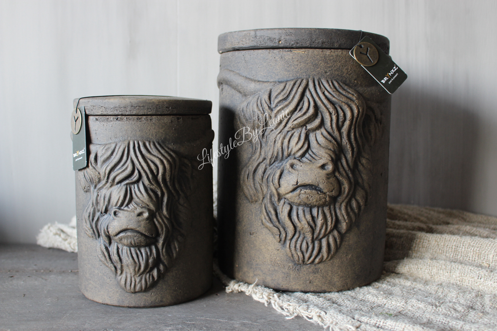 Stenen opbergpot met deksel van Brynxz in een bruine kleur. De pot is voorzien van het reliëf van een stoere Hooglander en is 19 cm hoog.