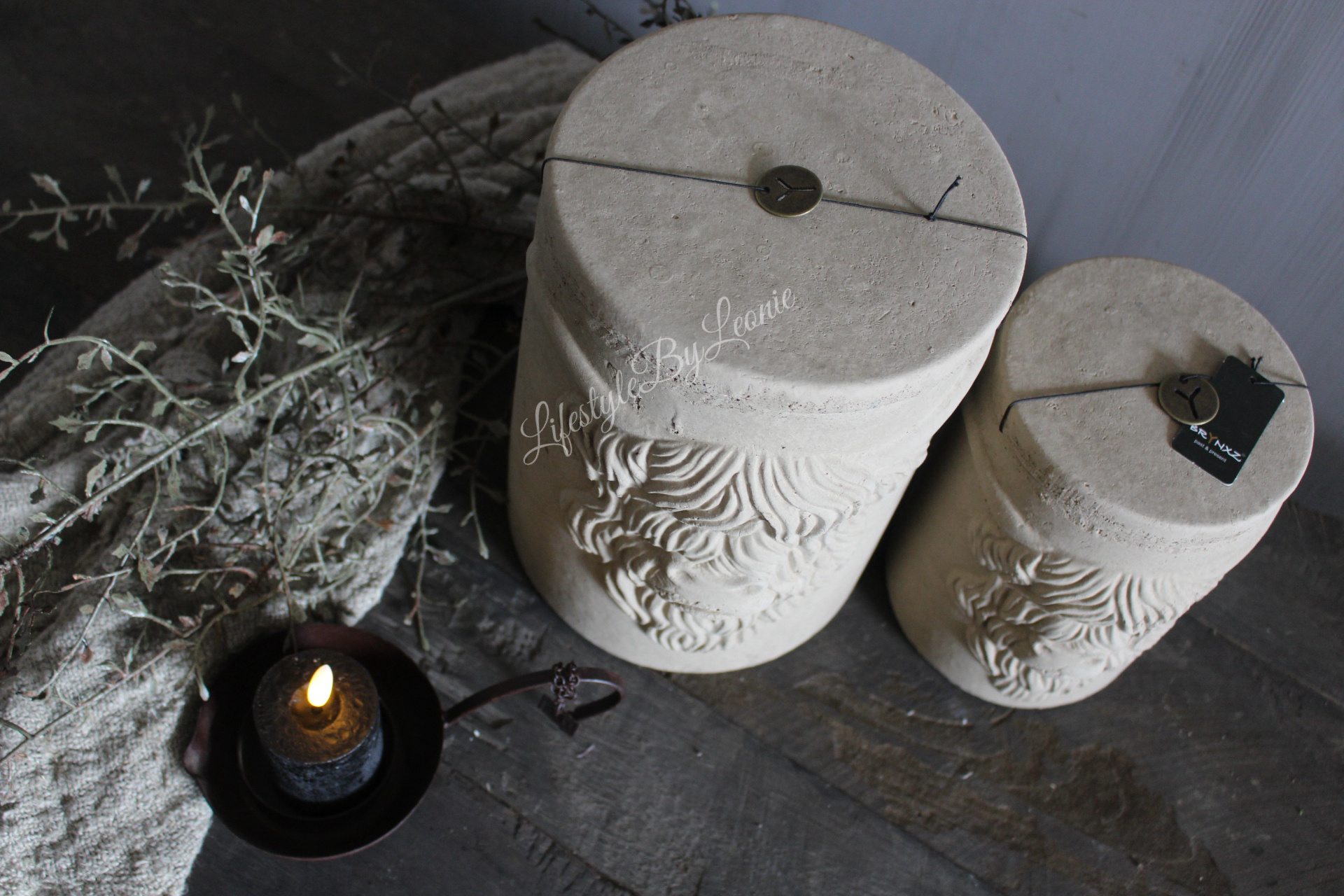 Stenen opbergpot met deksel in de nieuwste taupe kleur van Brynxz. De pot is voorzien van het reliëf van een stoere Hooglander en is 19 cm hoog.