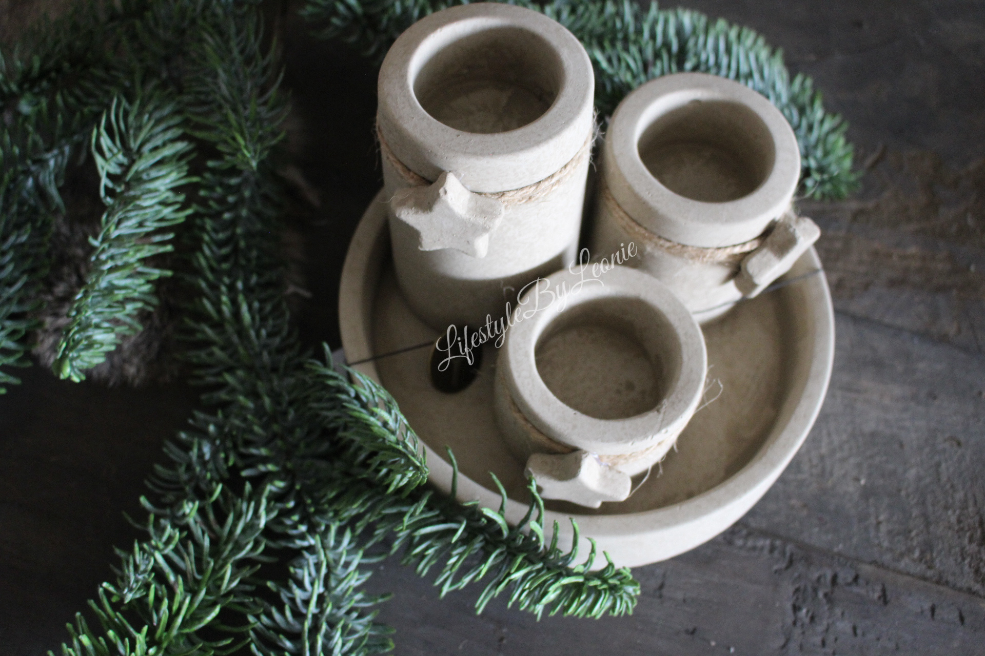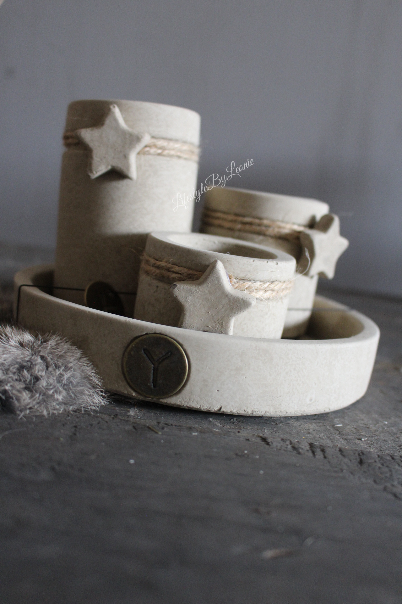 Mooie stenen plateau met drie waxinelichthouders met ster in de kleur Taupe van Brynxz.