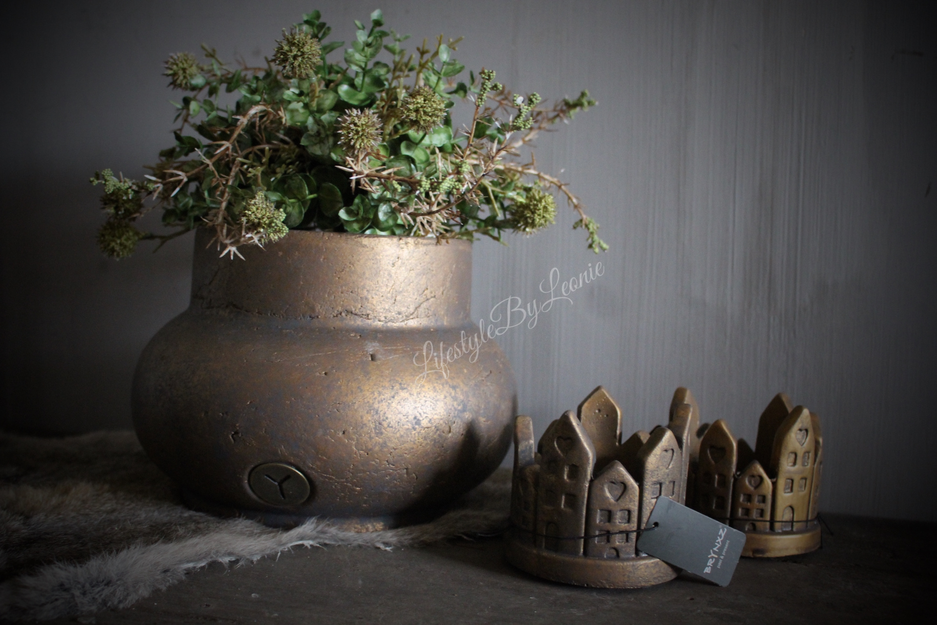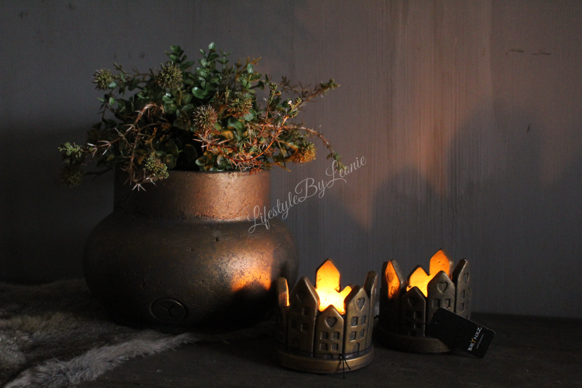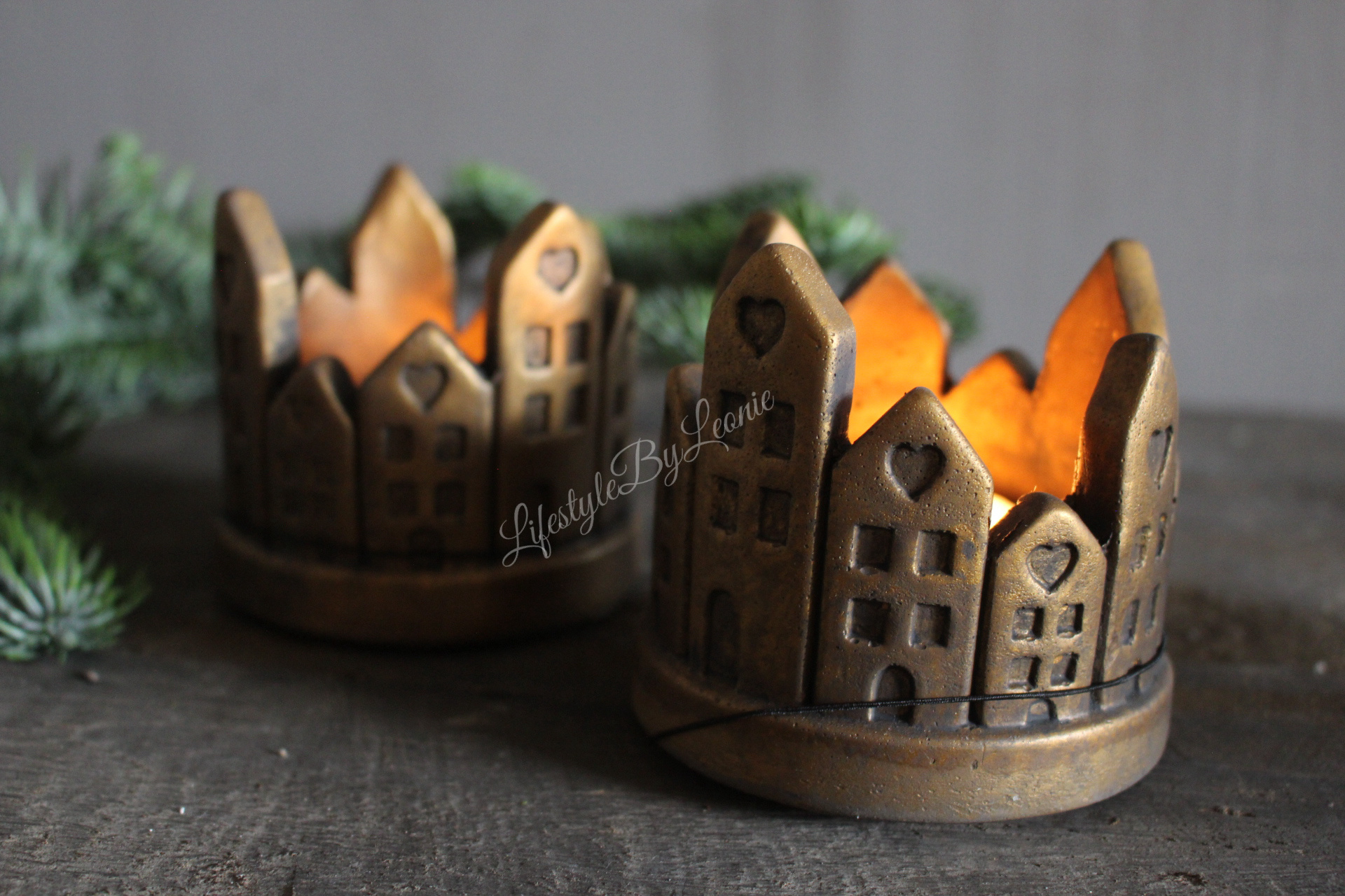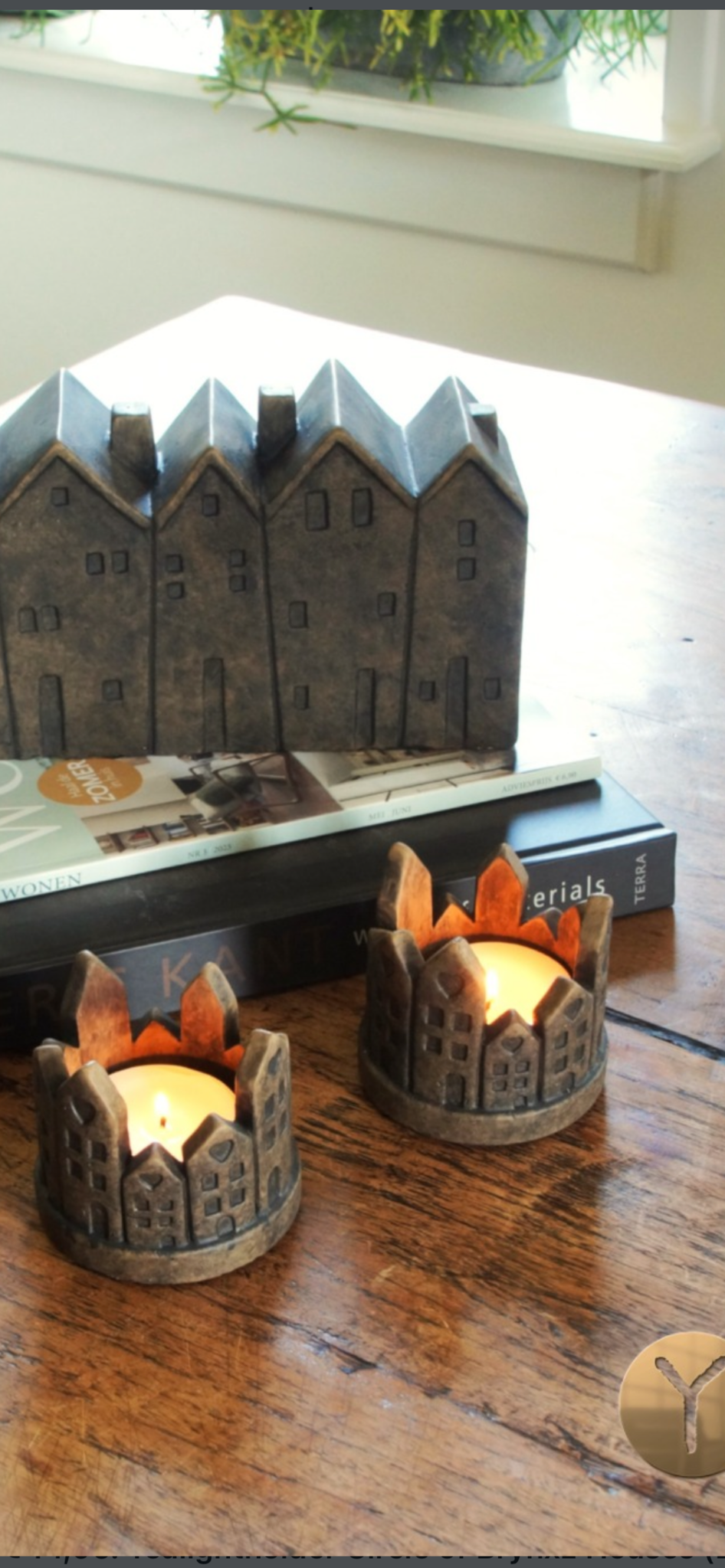 Stenen rond bakje met huisjes langs de rand. Superleuk en sfeervol met een waxinelichtje erin.