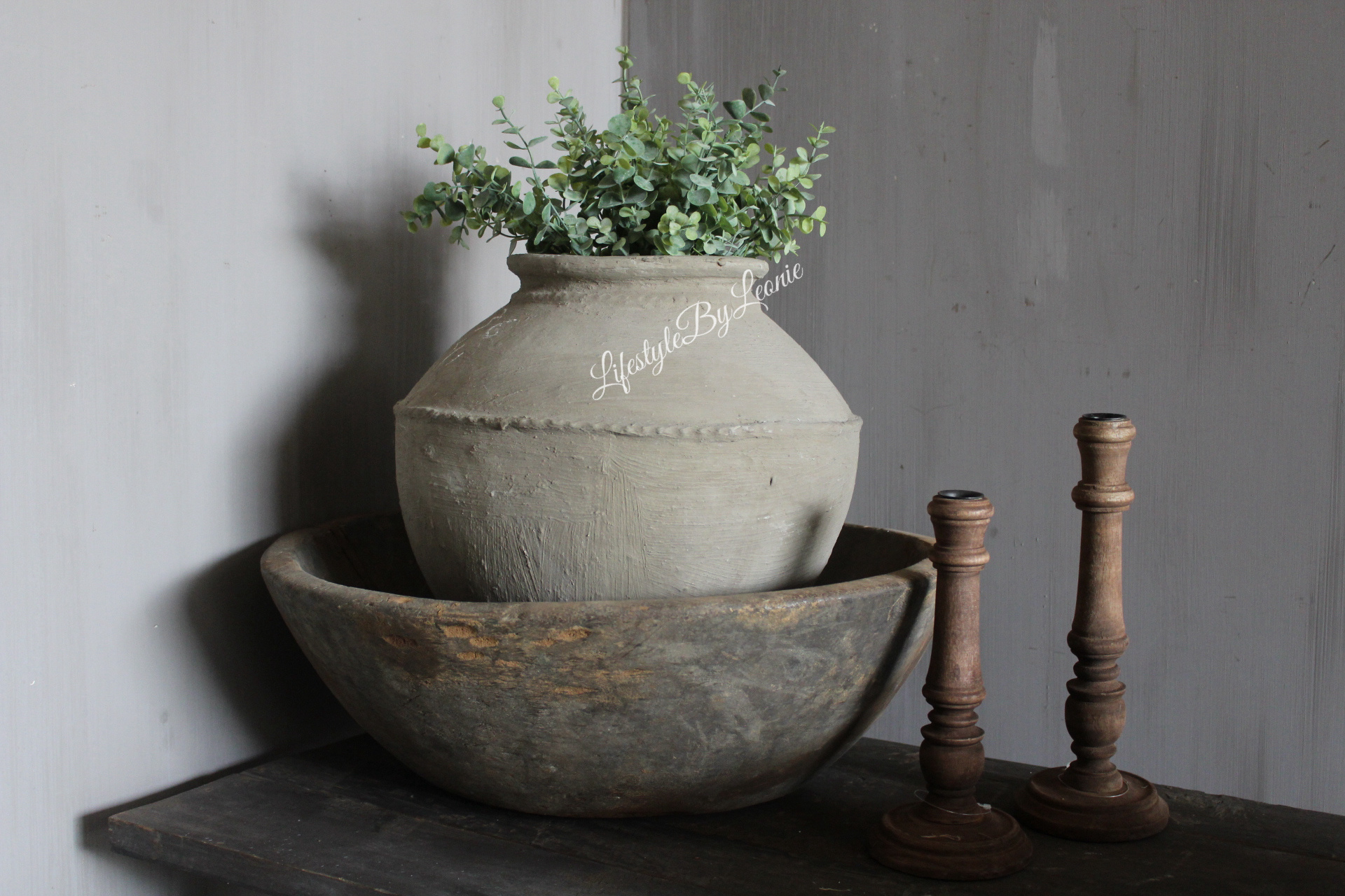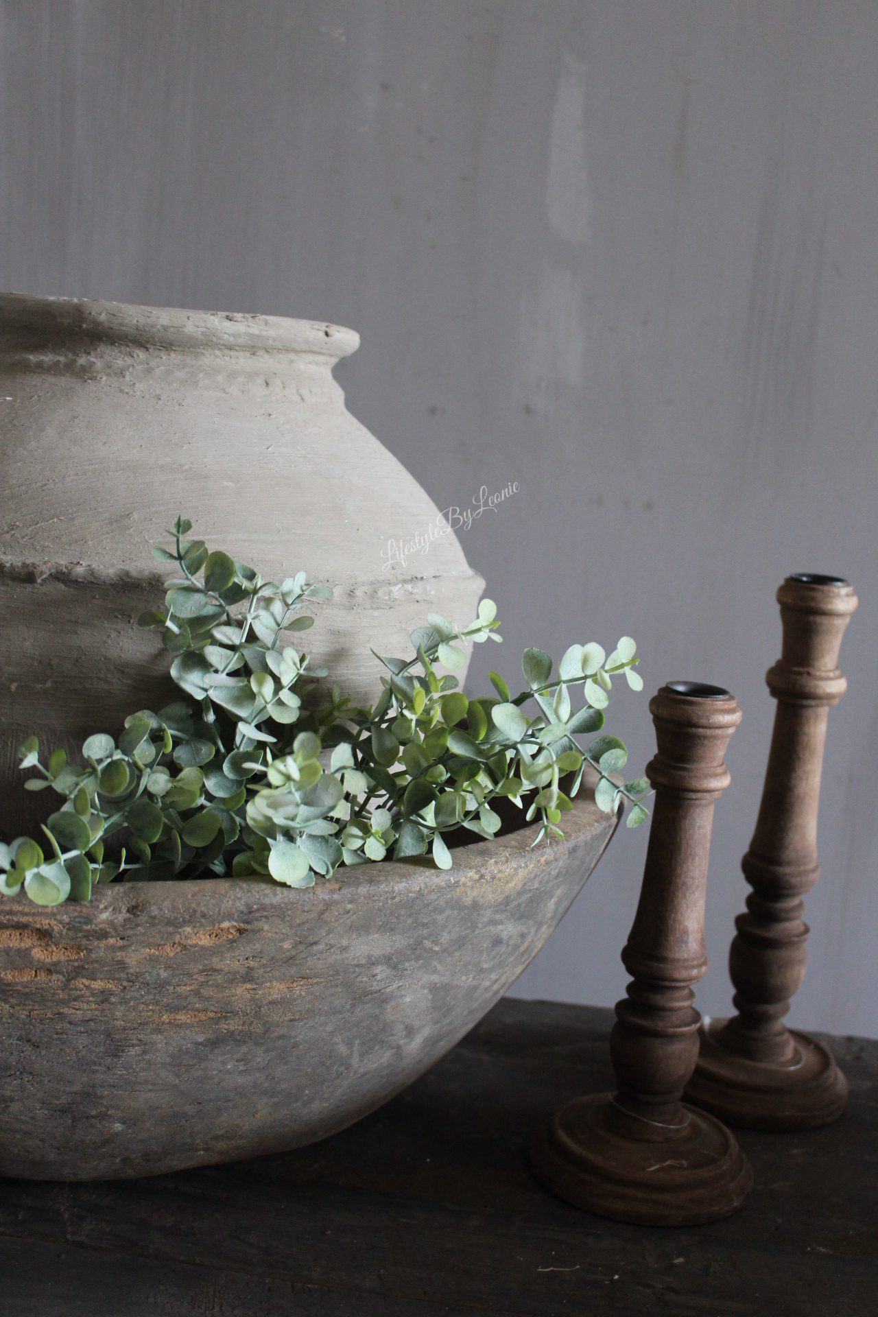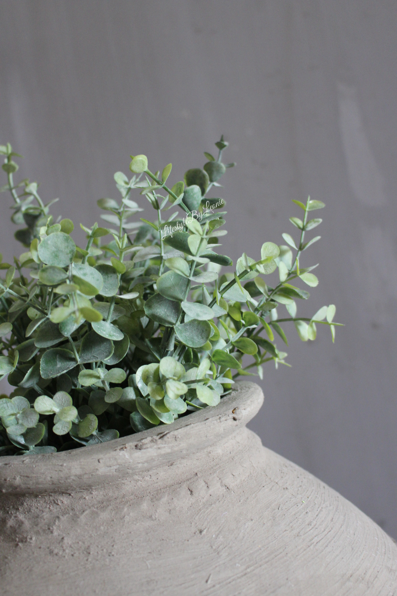 Prachtige bosje kunst Eucalyptus. De Eucalyptus is 33 cm lang en staat erg leuk in een oude kruik.