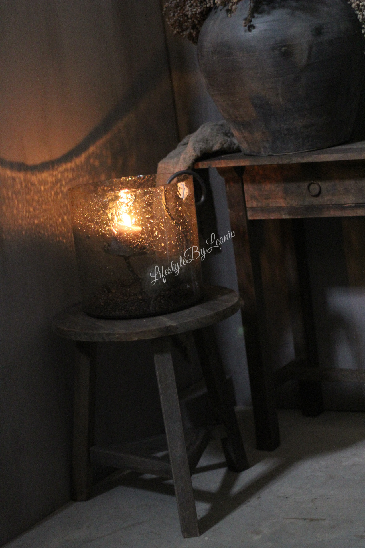 Groot zwaar windlicht met metal chips/bubbels in het glas. Dit geeft een erg leuk effect als er een waxinelichtje in brandt. Een ware eyecatcher in uw interieur.