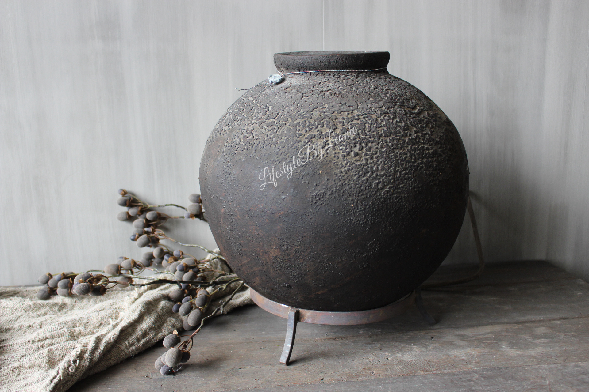 is toegevoegd aan uw winkelwagenPrachtige stenen ronde kruik van Hoffz Interior, staande op een metalen voet. Erg decoratief in een landelijk of sober interieur.