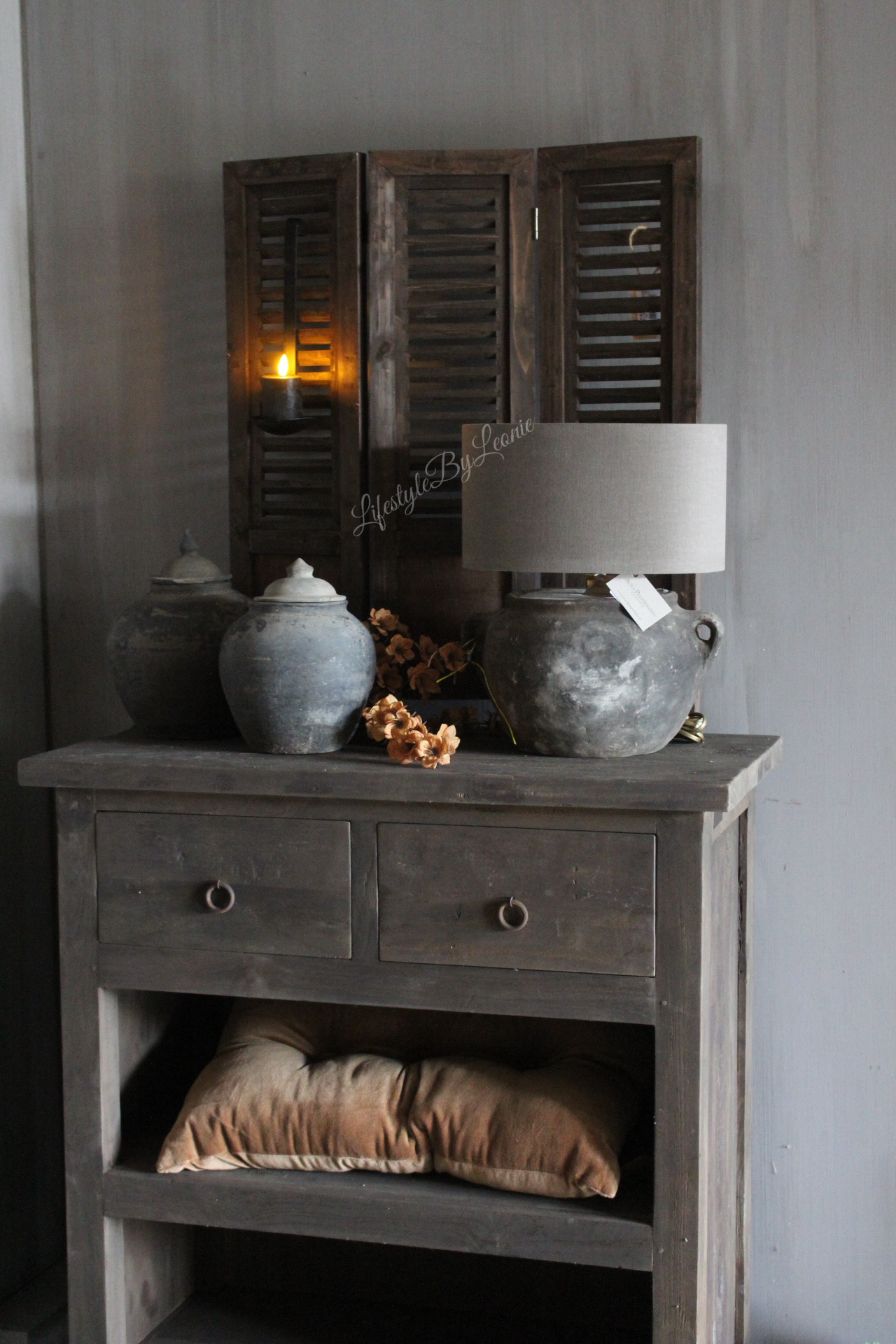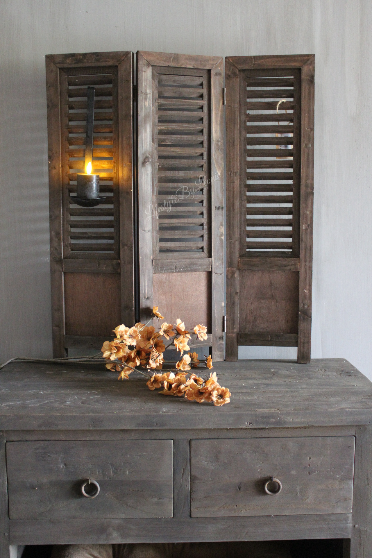 Drieluik shutter in een warme brown wash kleur. De shutters zijn 70 cm hoog. Ideaal in de vensterbank of op een side table.