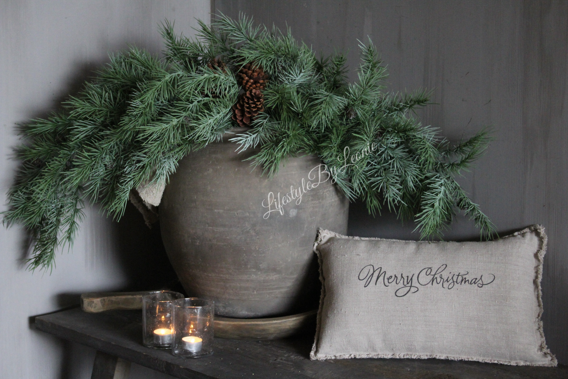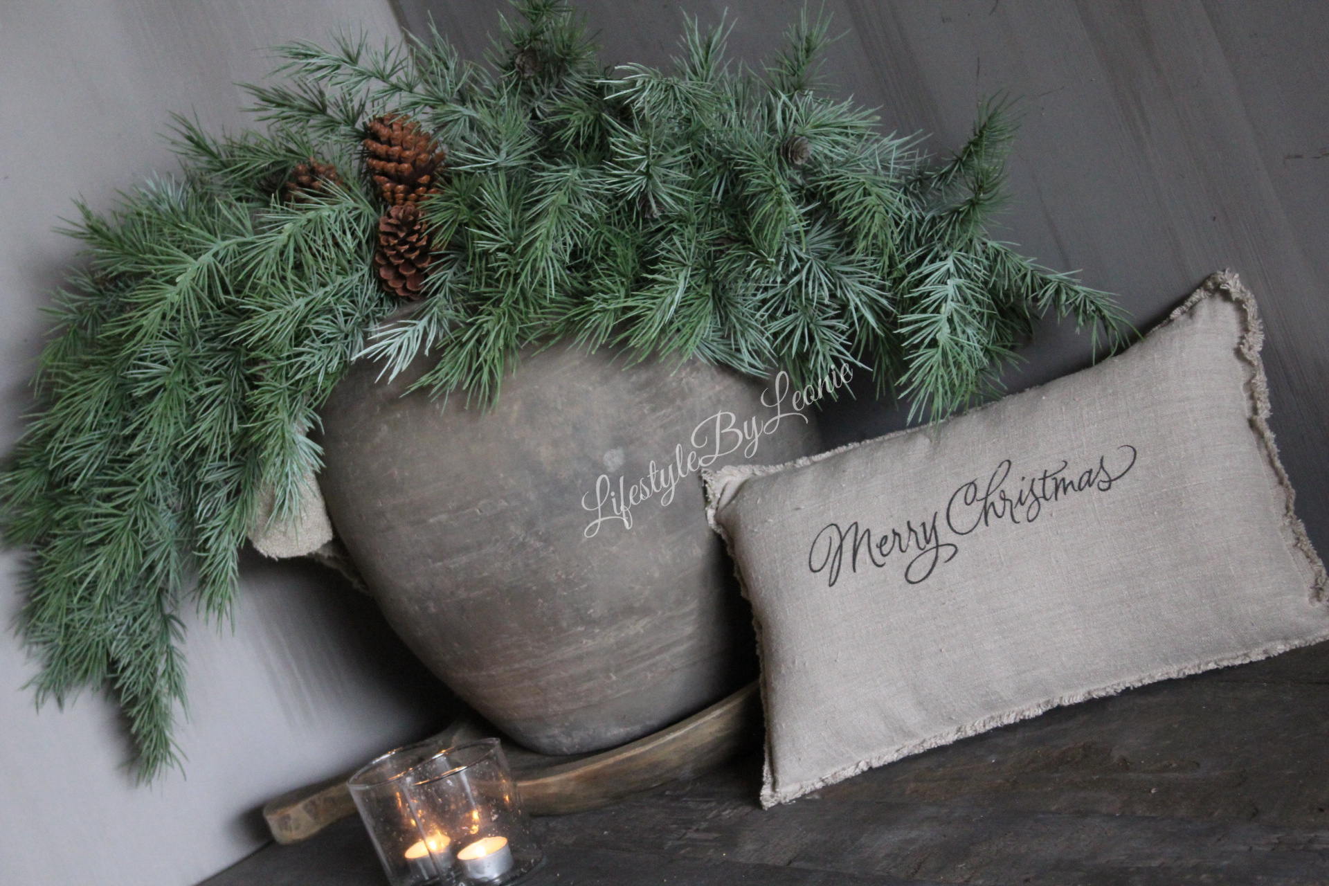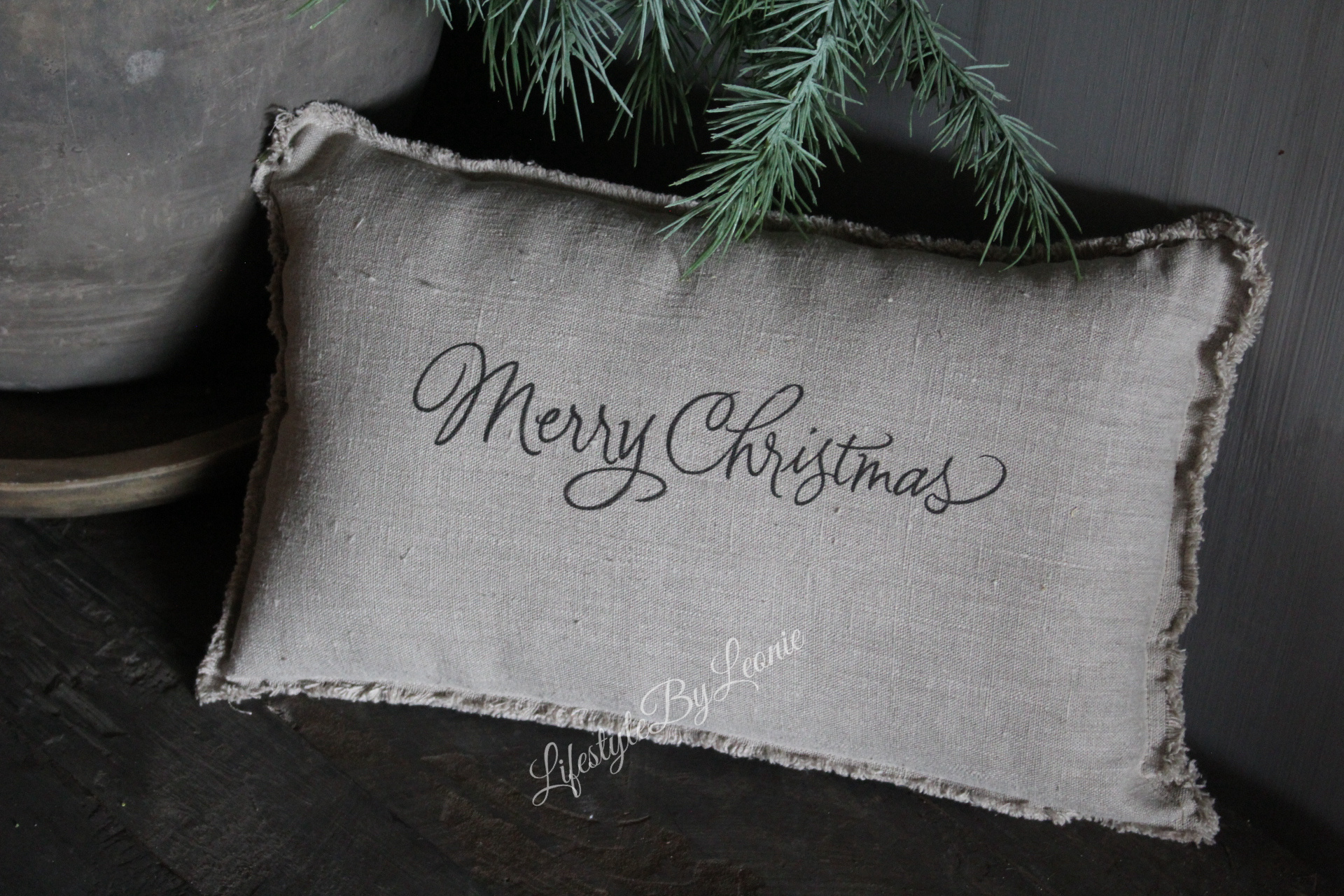 Mooi shabby linnen sierkussen met de tekst Merry Christmas in sierlijke letters. Het kussen is 45 x 25 cm groot.