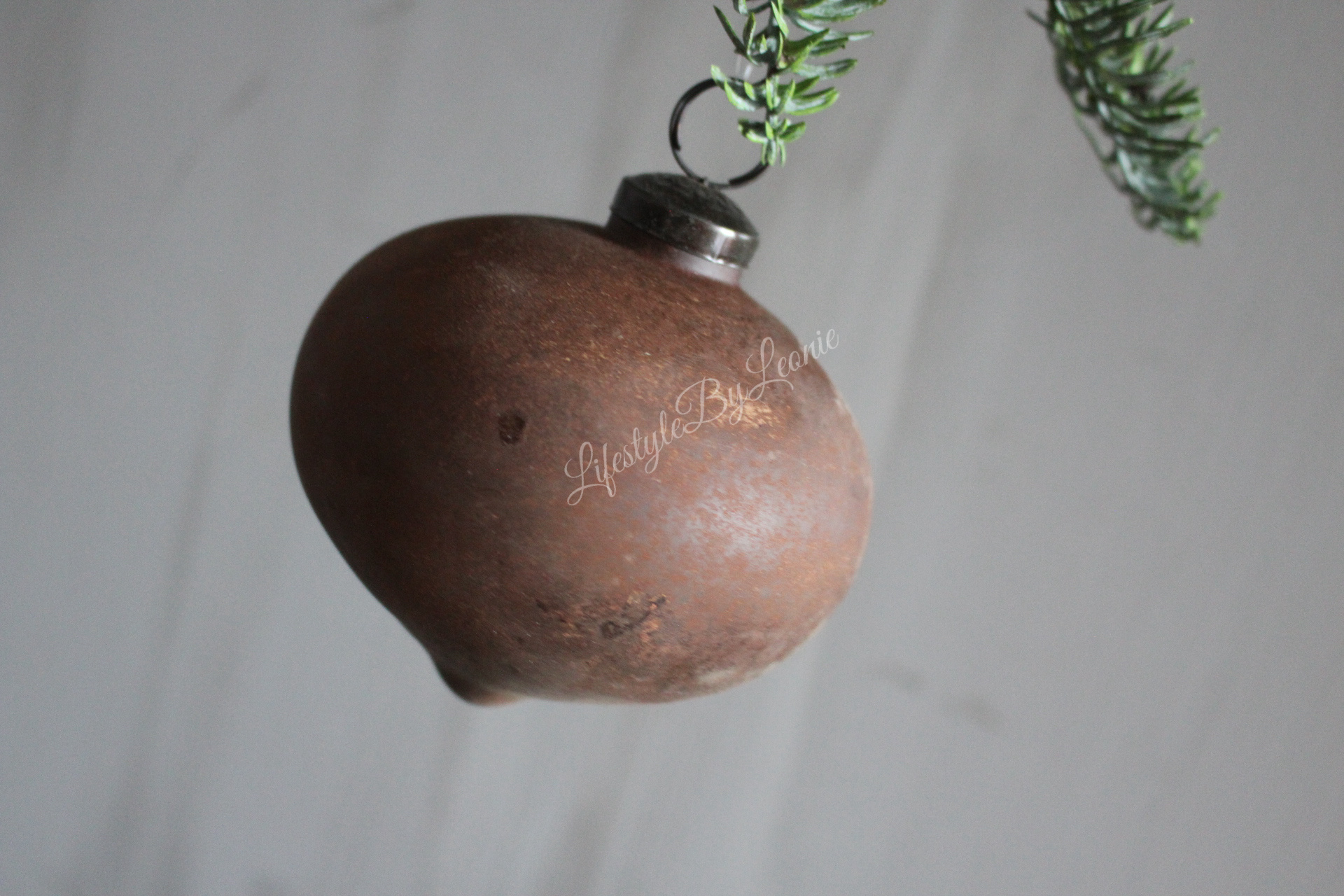 Sobere glazen kerstbal in roestkleur. Leuk om te verwerken in een kerstdecoratie. De bal is 10 cm groot.