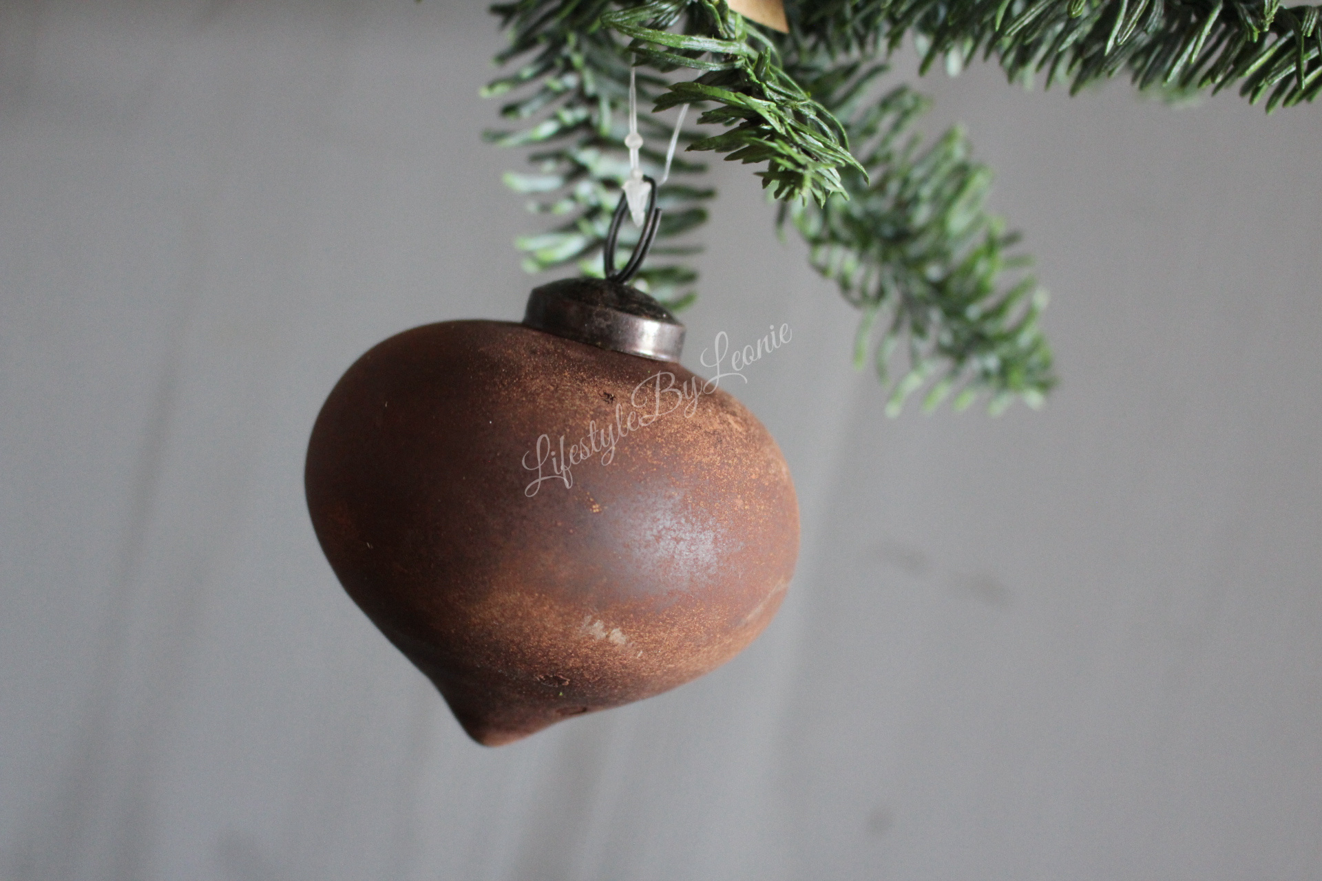 Sobere glazen kerstbal in roestkleur. Leuk om te verwerken in een kerstdecoratie. De bal is 8 cm groot.