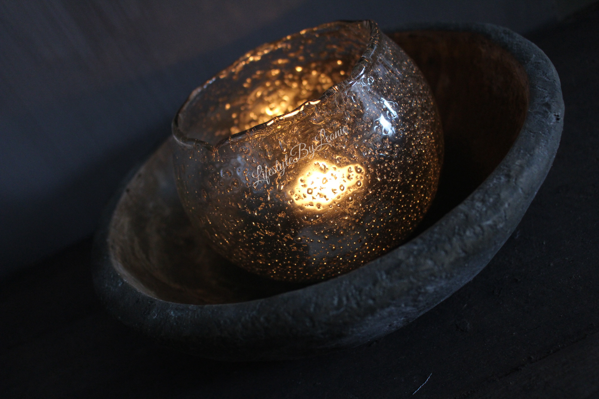 Rond glazen windlicht met metal chips in het glas. Dit geeft een mooi effect met een brandend waxinelichtje er in.