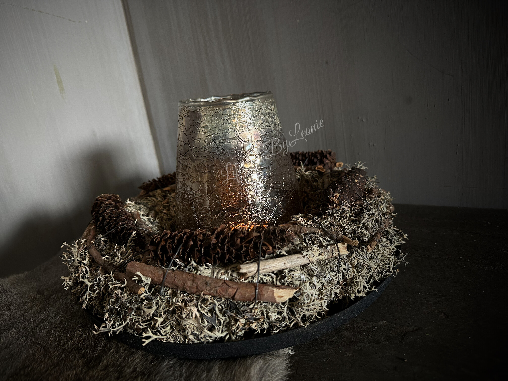 Mooie grijze moskrans met dennenappels en houten stokjes. Leuk in het najaar of de winter voor aan de muur of op een schaal.