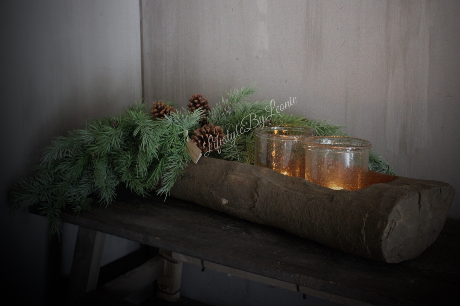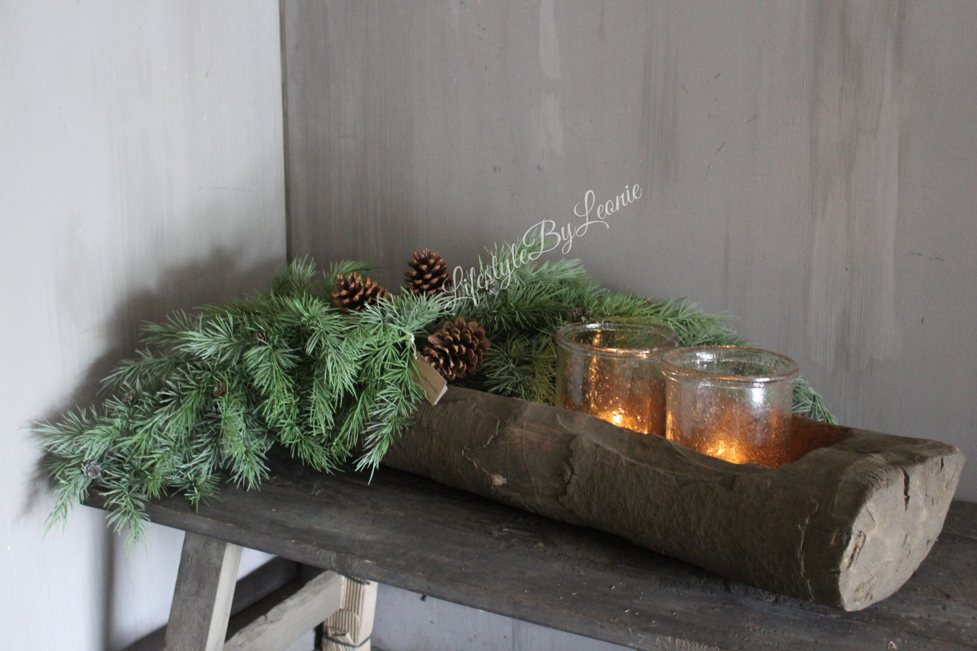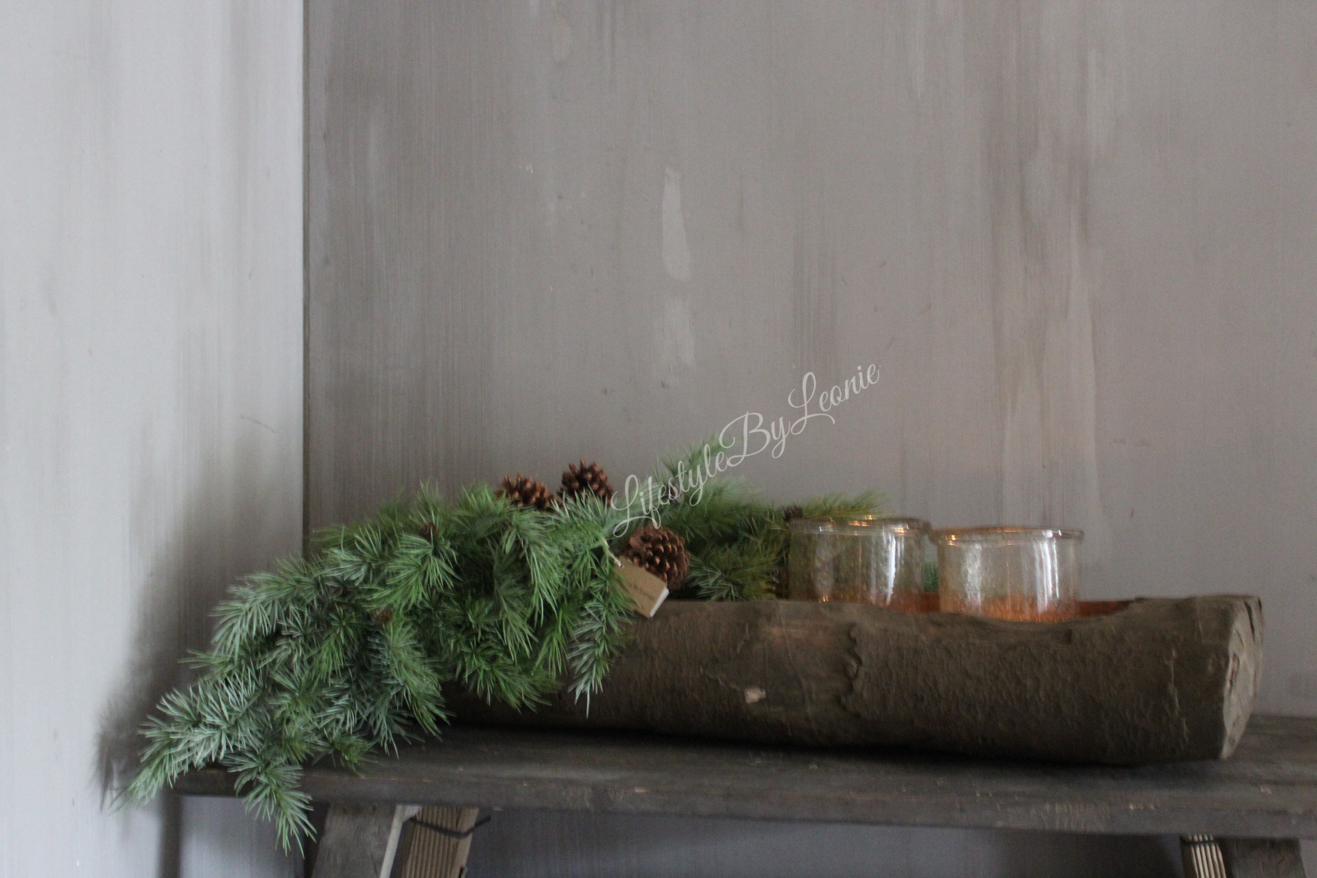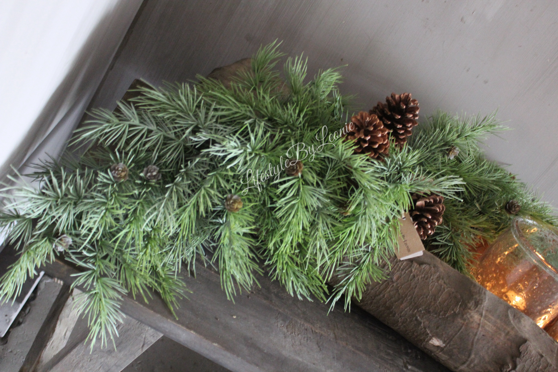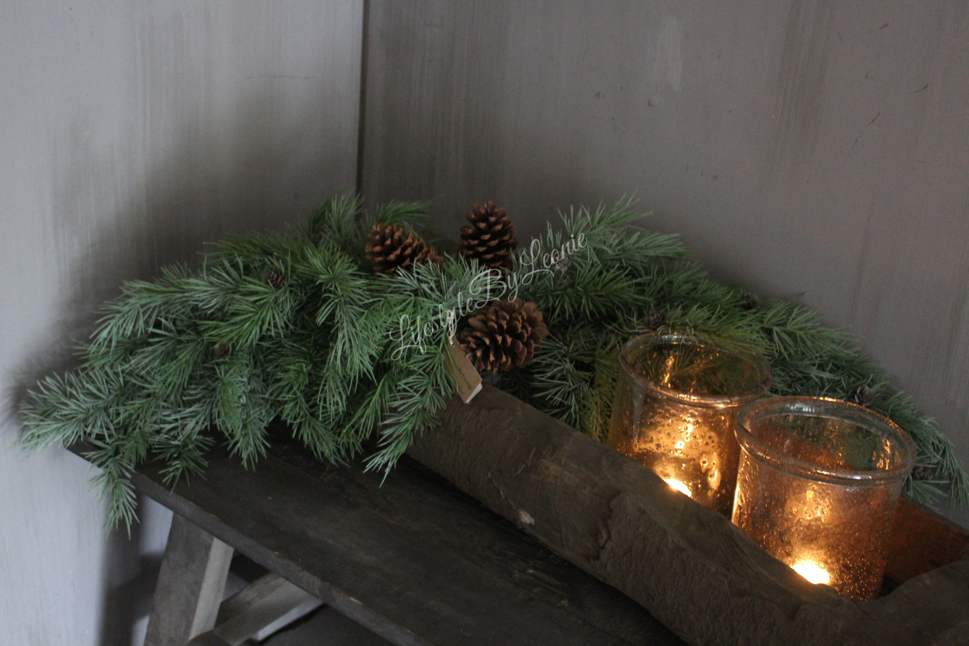 Mooie lange en brede groene kunst kersttoef met dennenappels. Erg leuk op de schouw of boven een deur.