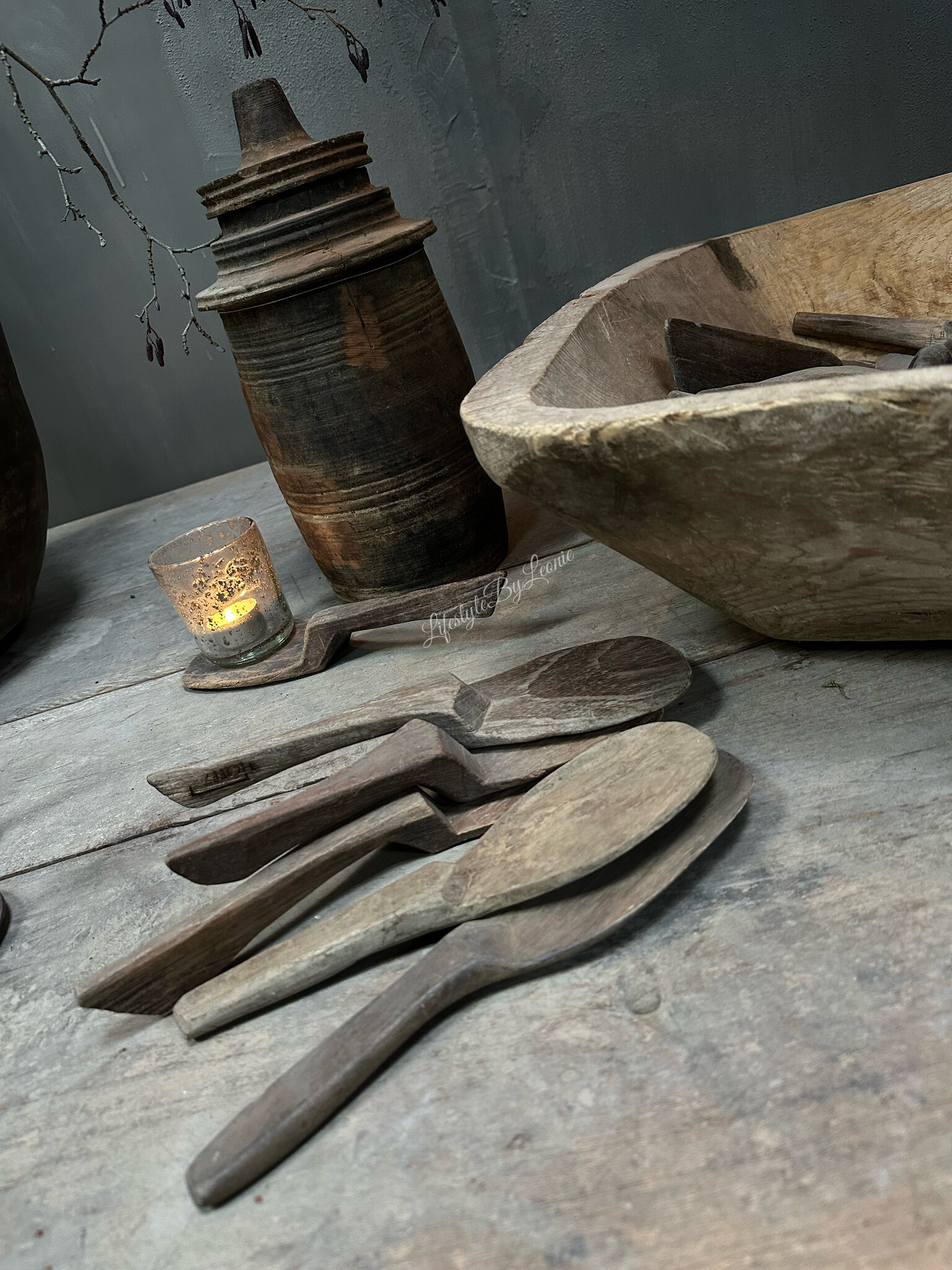 Authentieke liggende houten lepel van Hoffz Interior. Leuk als decoratie op een tafeltje of kastje, bijvoorbeeld met een waxinelichtje er op.