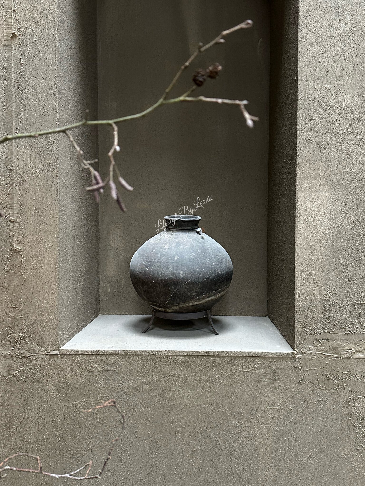 Stenen ronde bol kruik op metalen voet