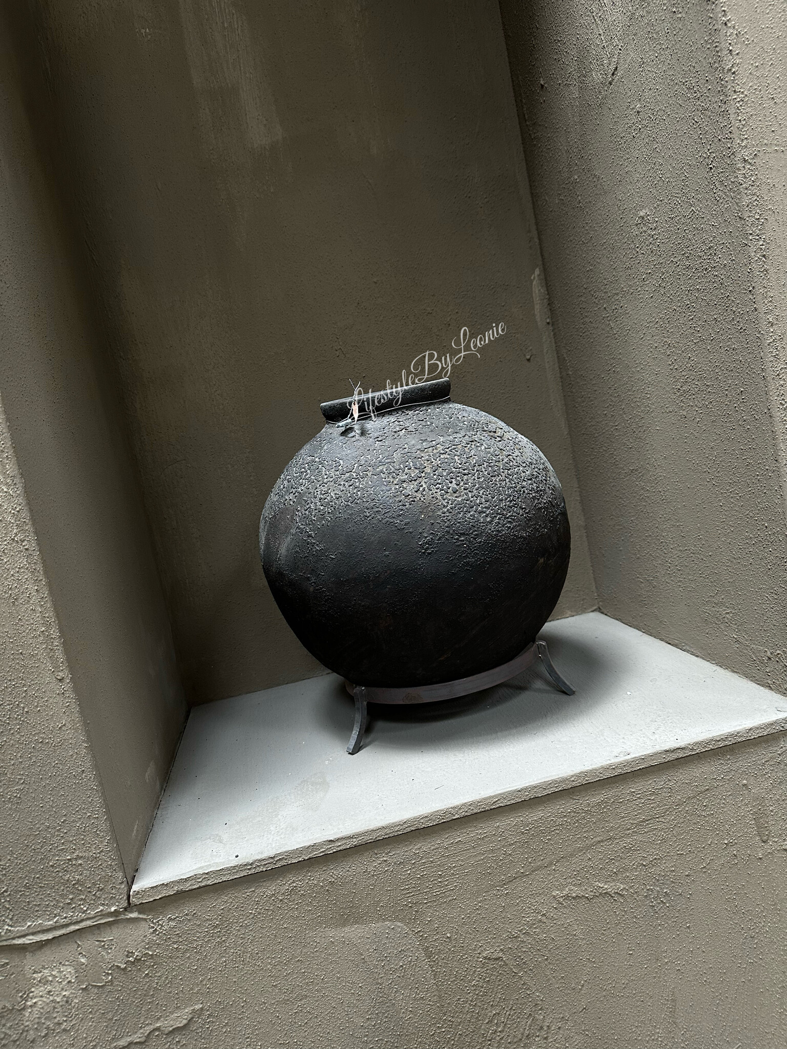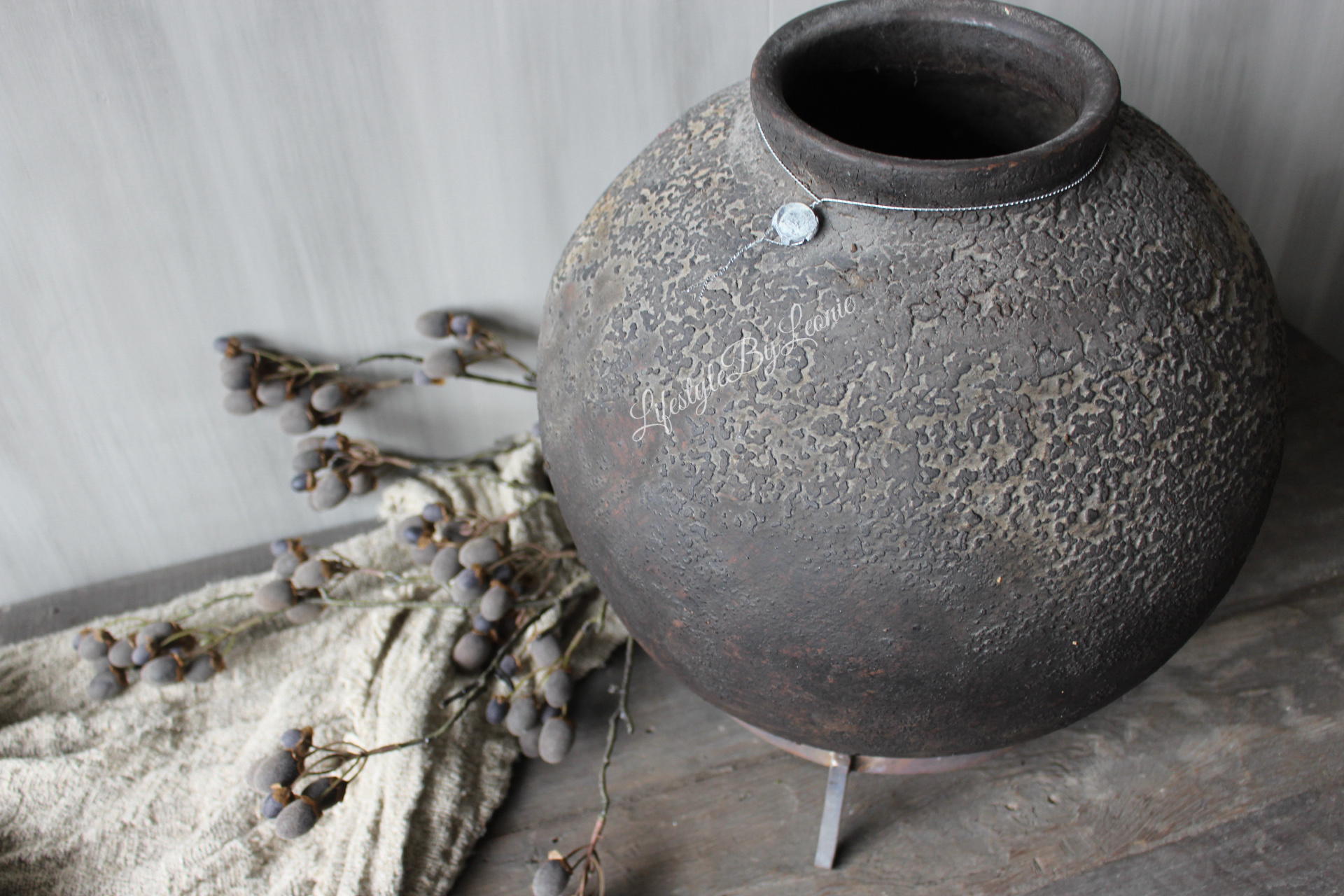 Prachtige stenen ronde kruik van Hoffz Interior, staande op een metalen voet. Erg decoratief in een landelijk of sober interieur.