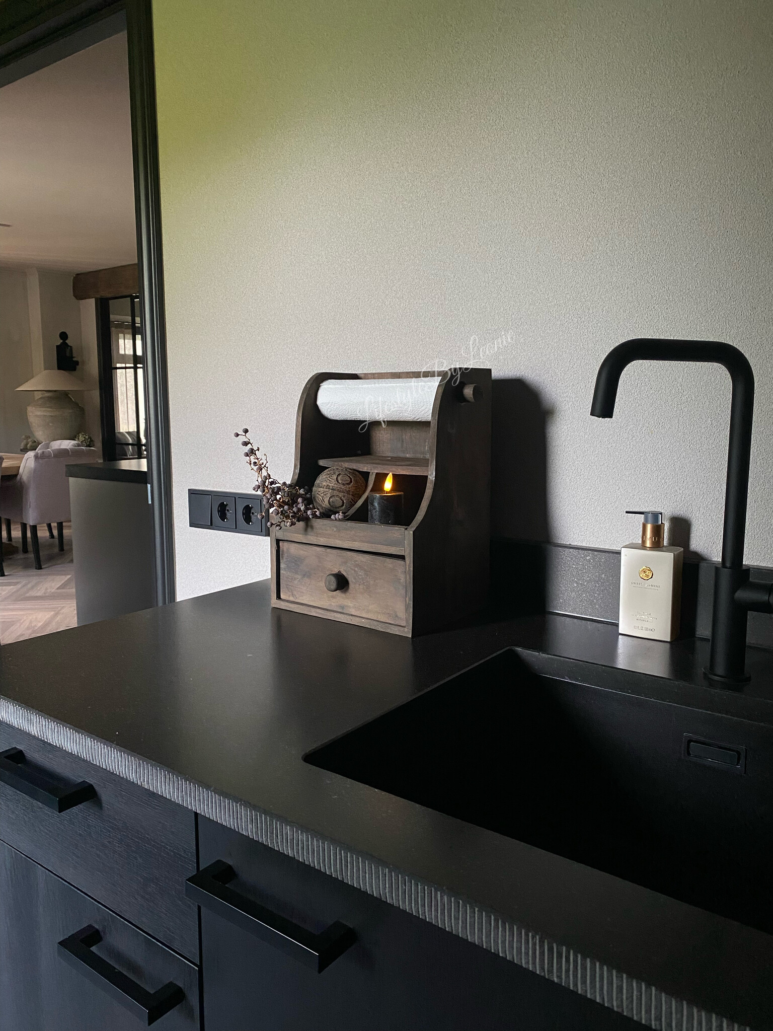 Mooi gruttersbakje en keukenrolhouder in één. Leuk in de keuken. De bak is 35 x 26 cm groot.