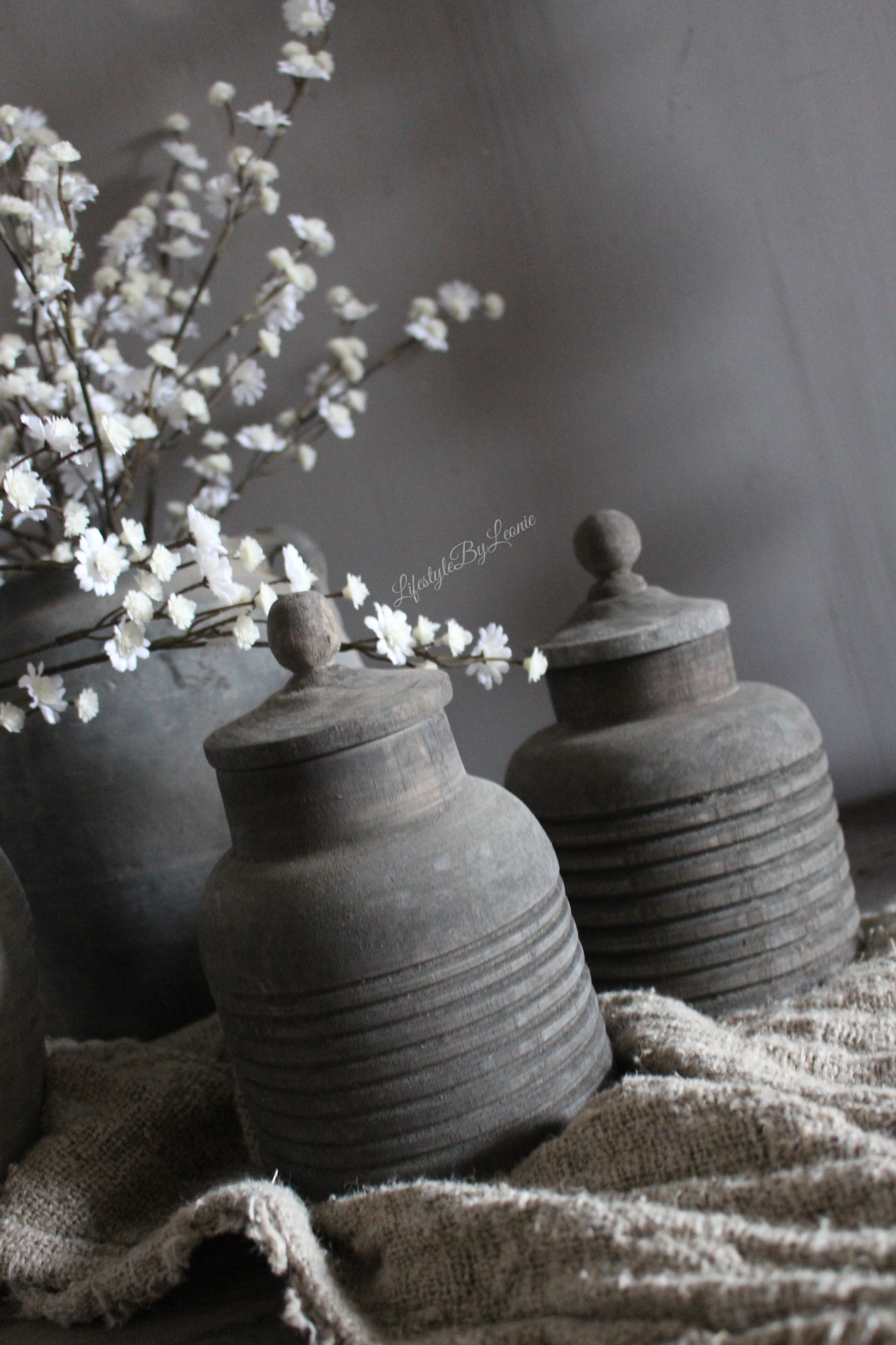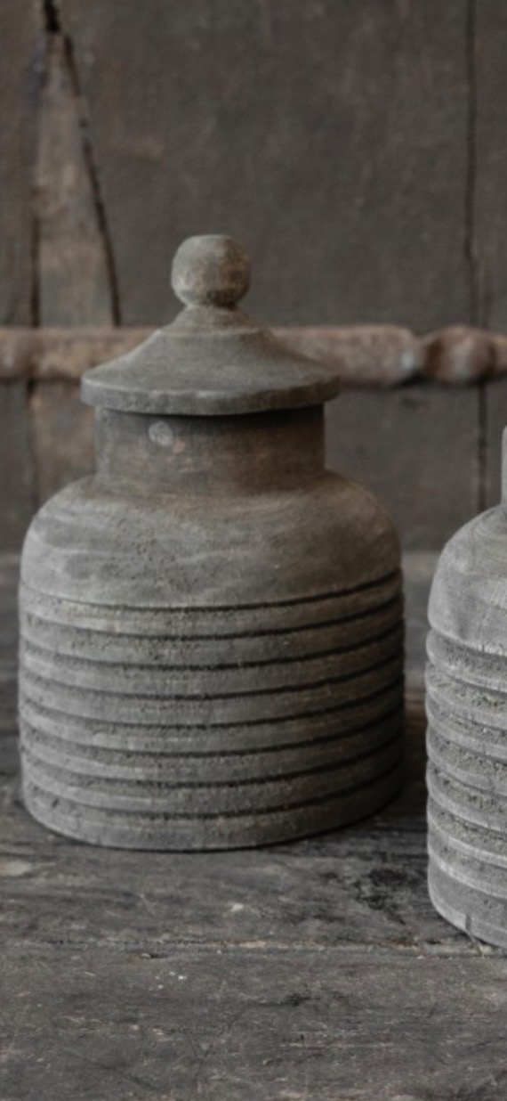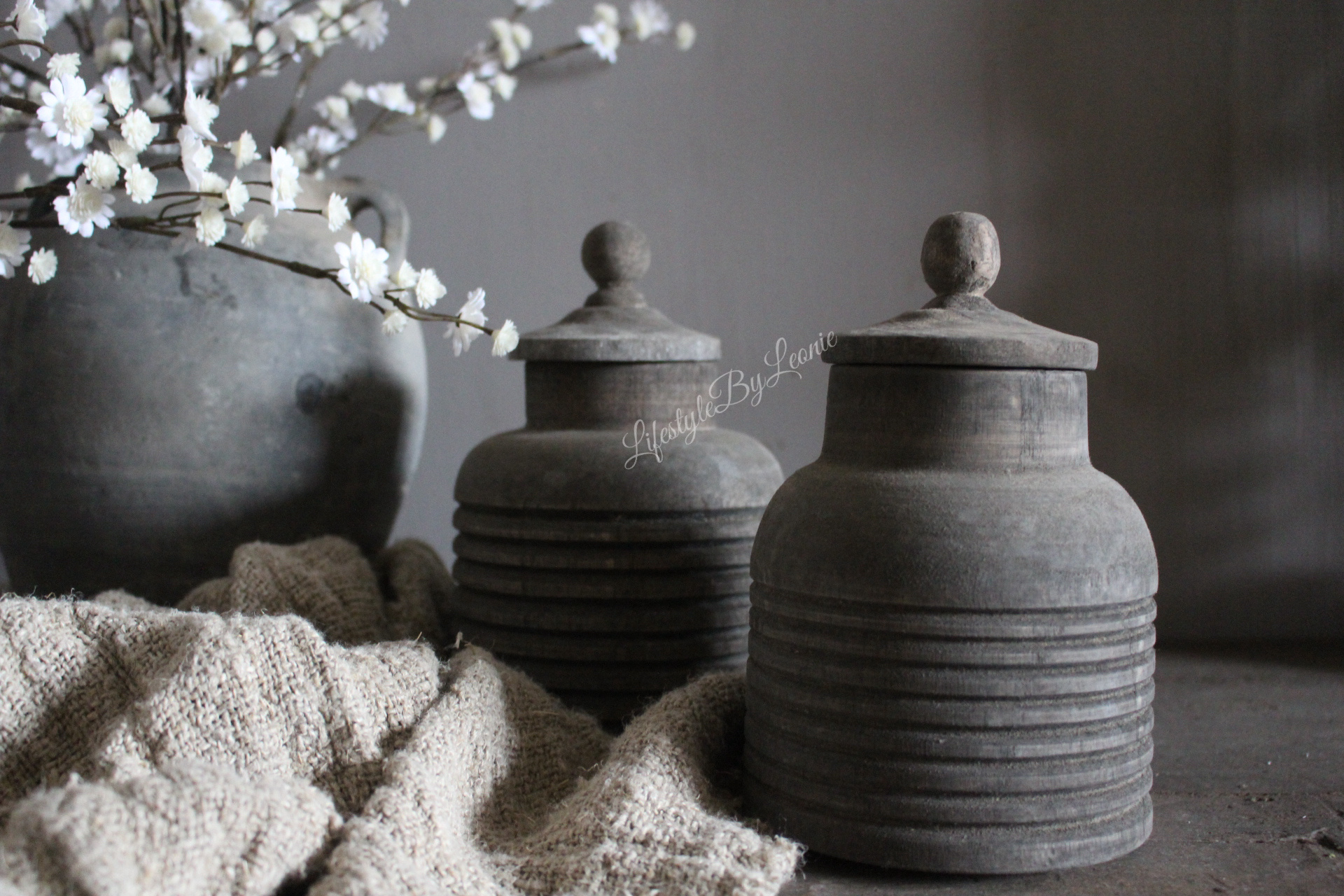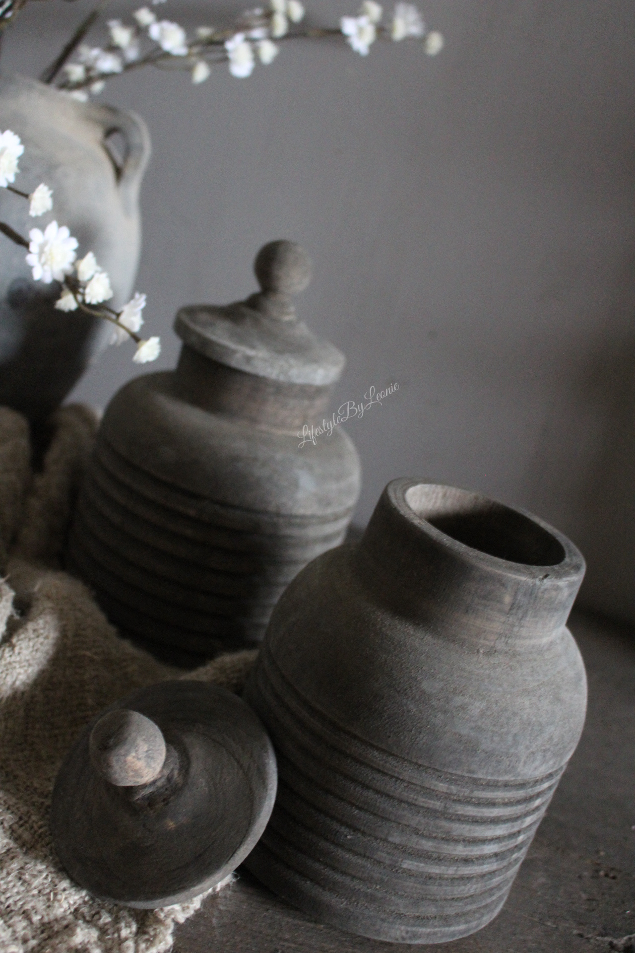 Mooi houten kruikje met deksel. Het kruikje is gemaakt van vergrijsd hout en is 18 cm hoog.