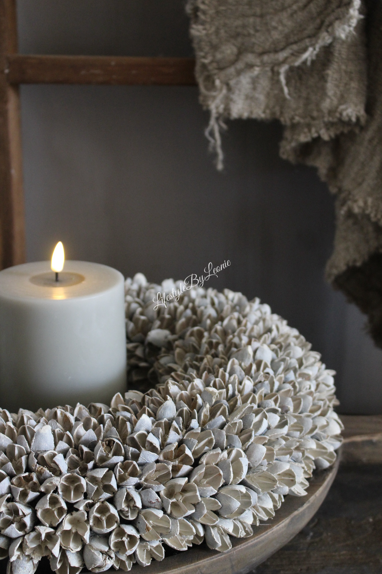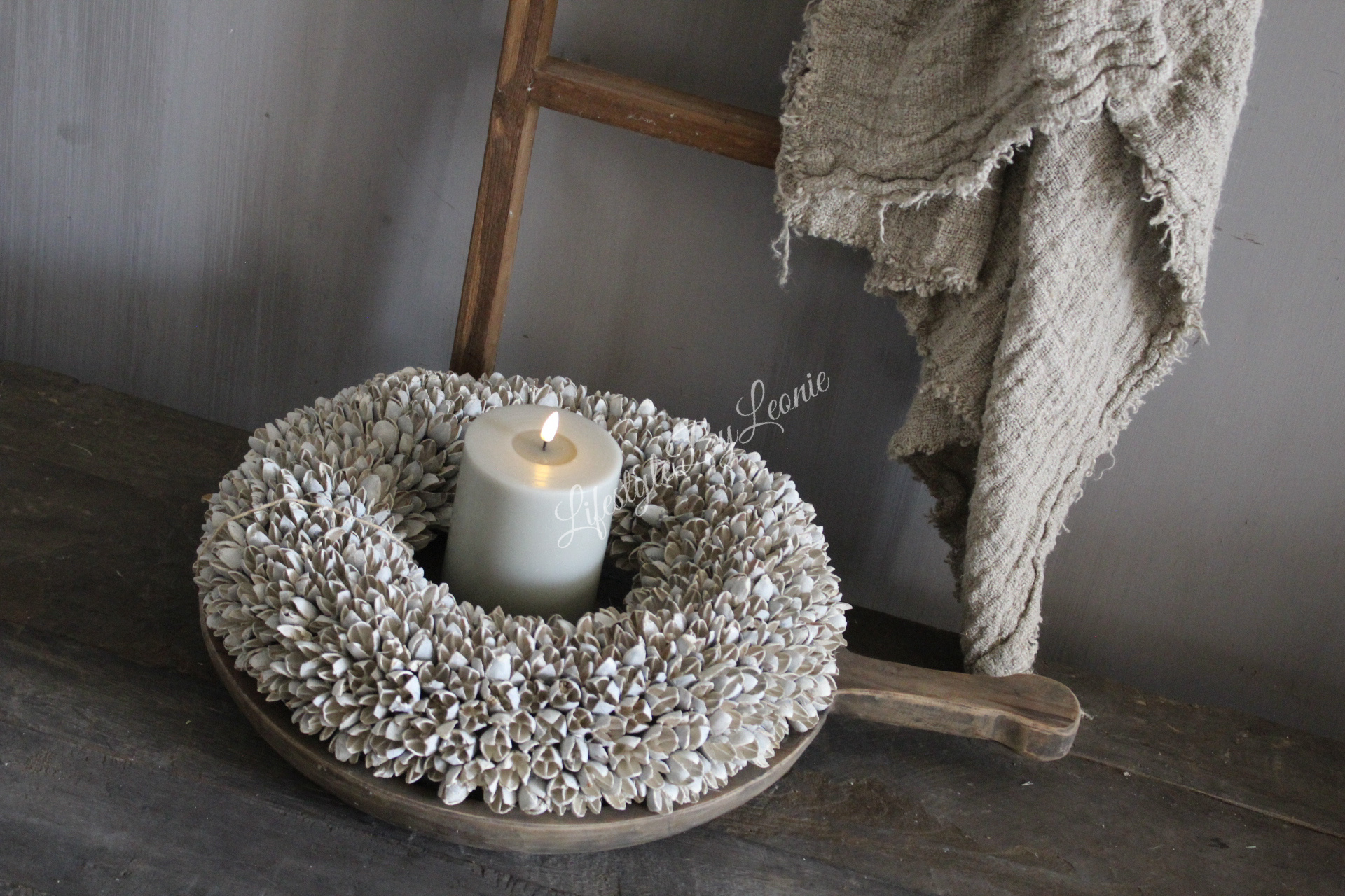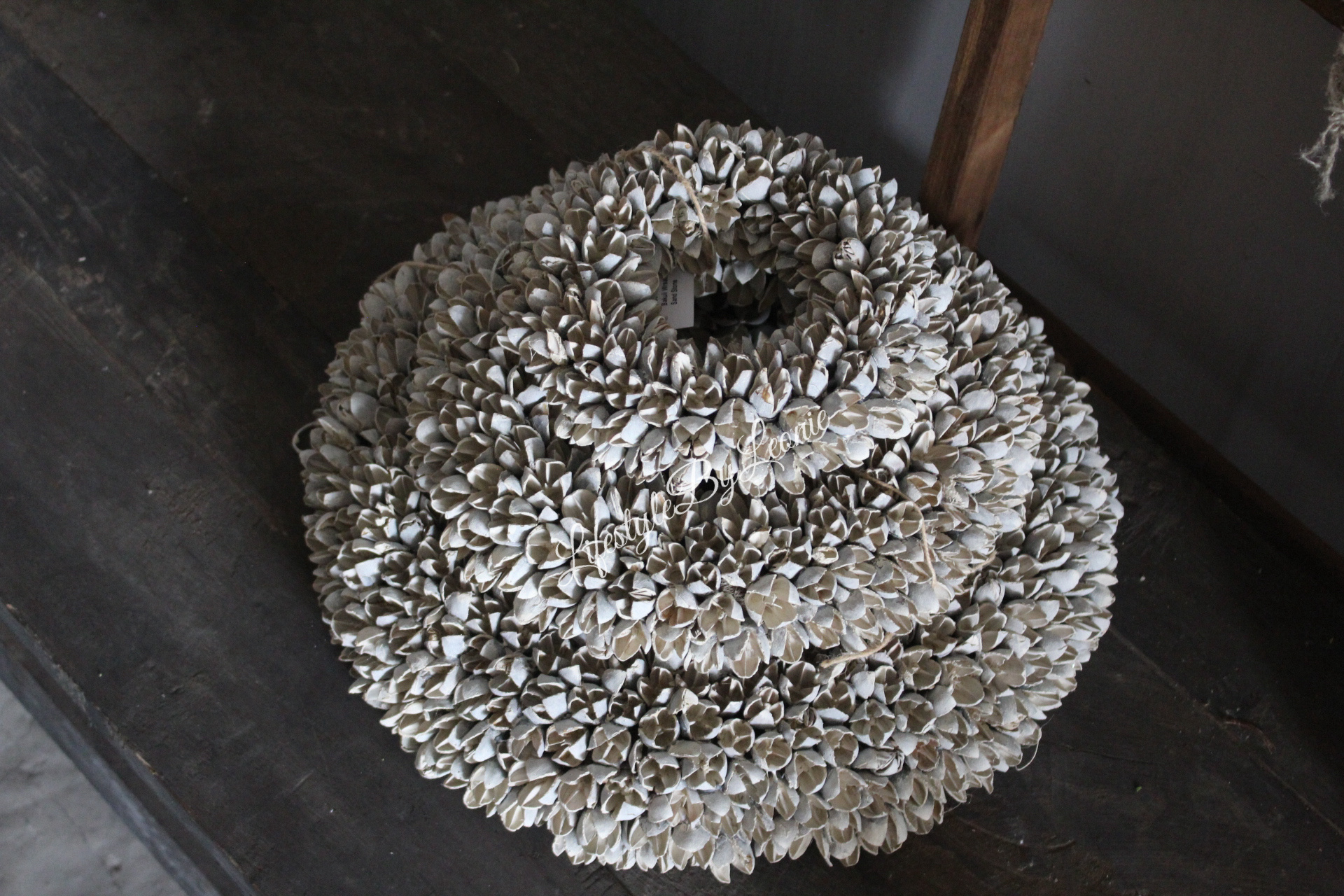 De altijd populaire Bakuli krans in een mooie lichte sand stone kleur. De krans heeft een doorsnede van 40 cm.