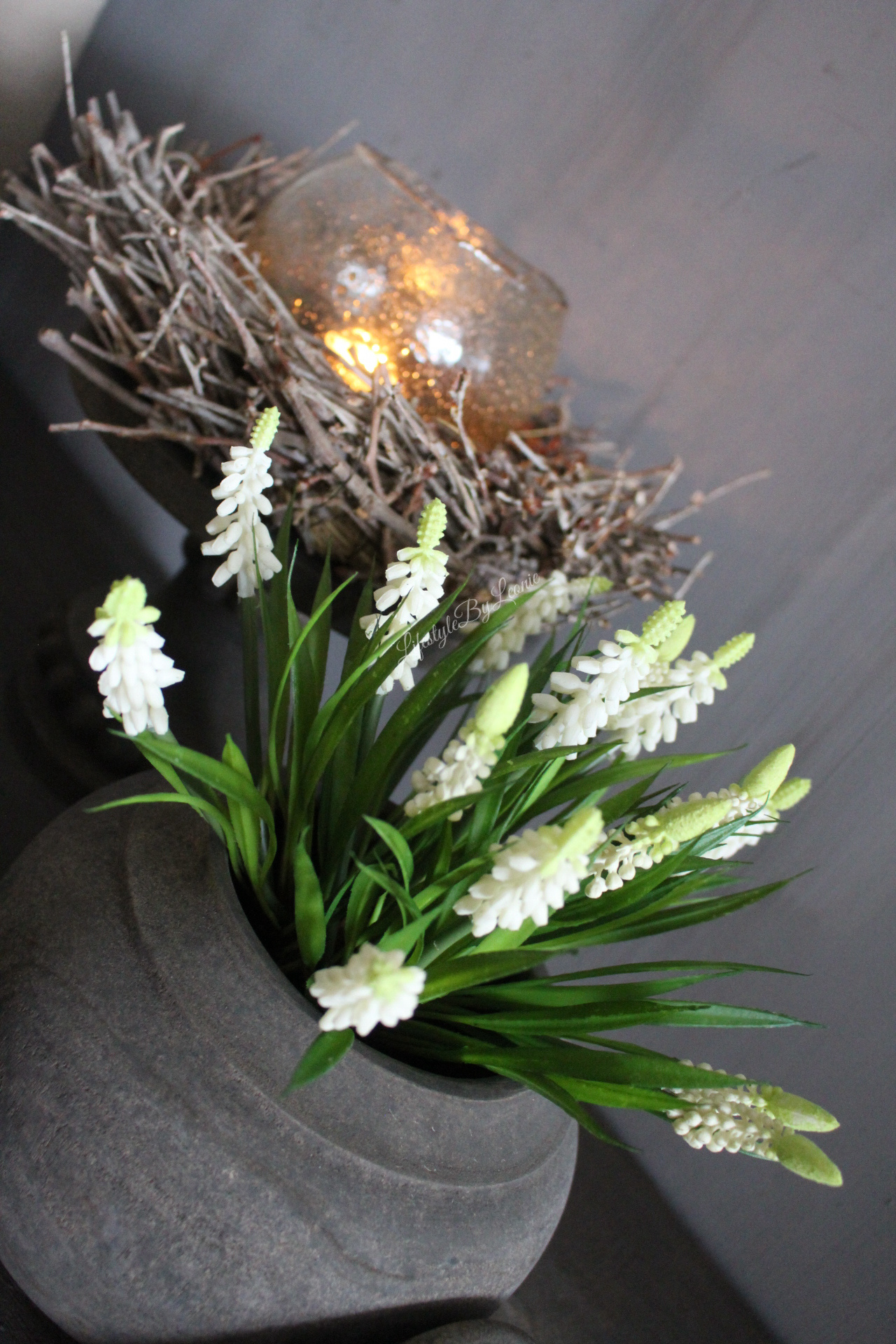 Mooi boeketje met kunst Druifjes met frisse groen witte bloemetjes. De Druifjes zijn 26 cm groot.