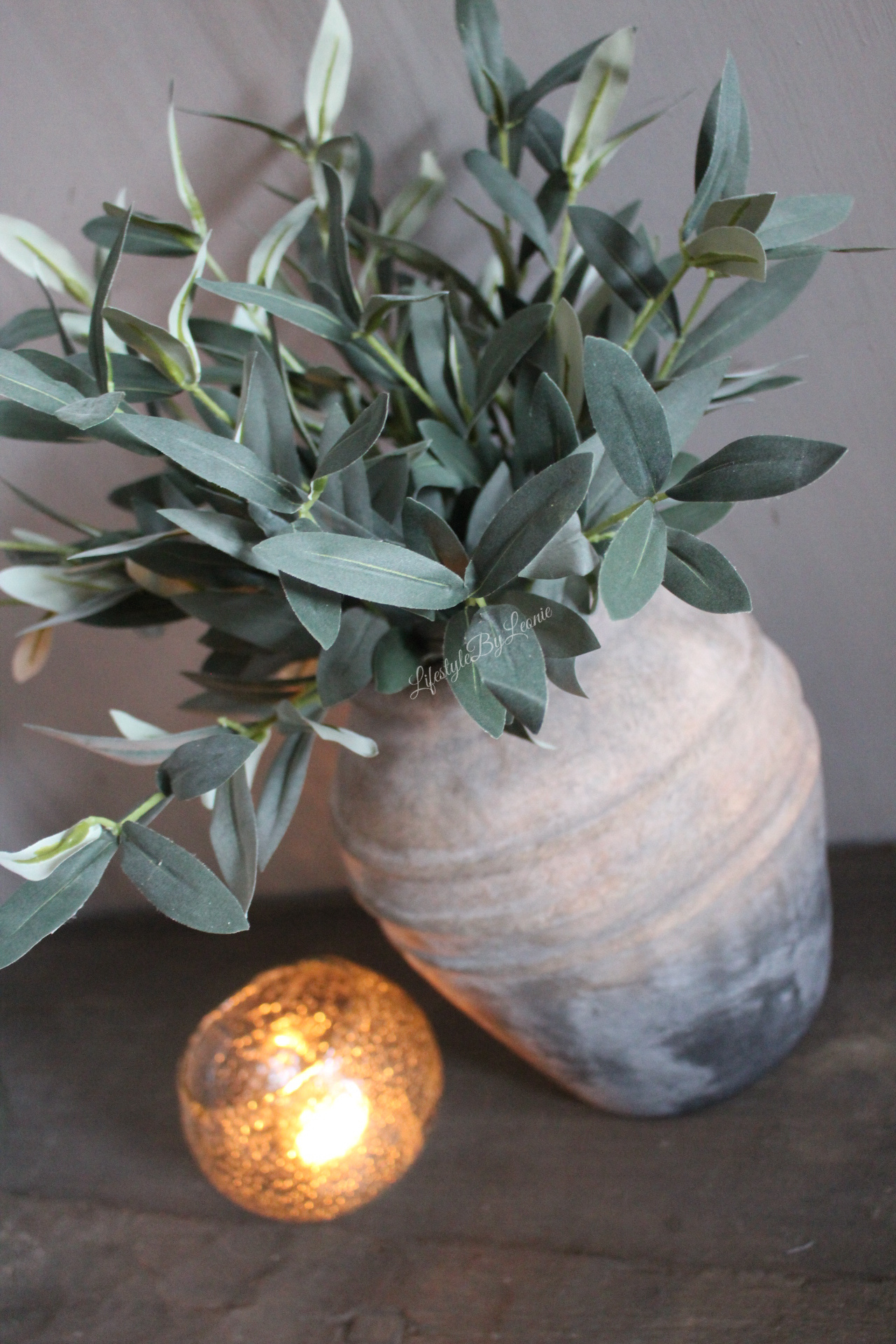 Prachtig boeket met kunst Olijftakken. Mooi in een oude kruik en ook leuk in een shabby doek als toef. De takken zijn 34 cm lang.