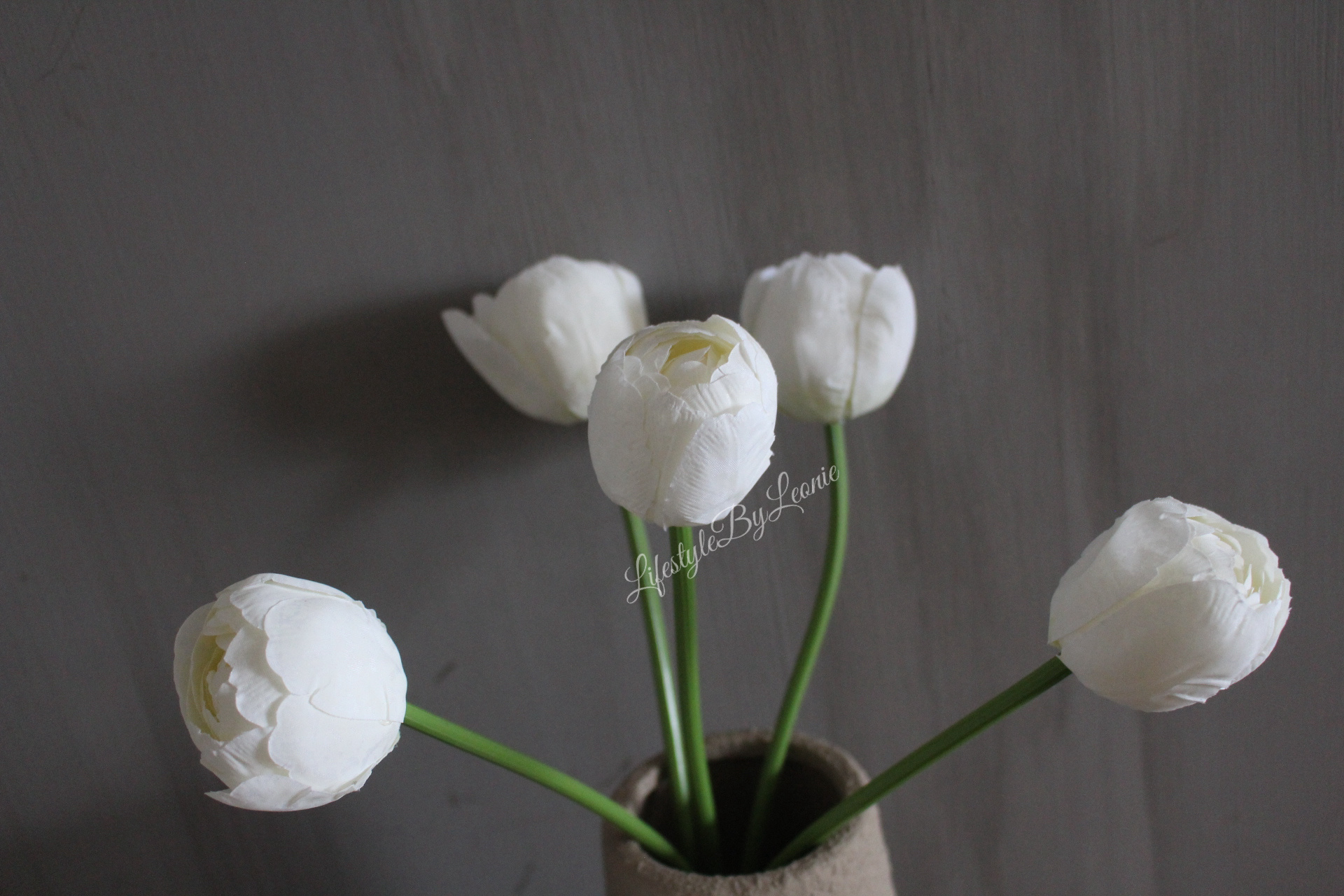 Mooi boeketje met witte kunst Tulpen. Prachtig in een kruik of vaas. De Tulpen zijn 50 cm lang.