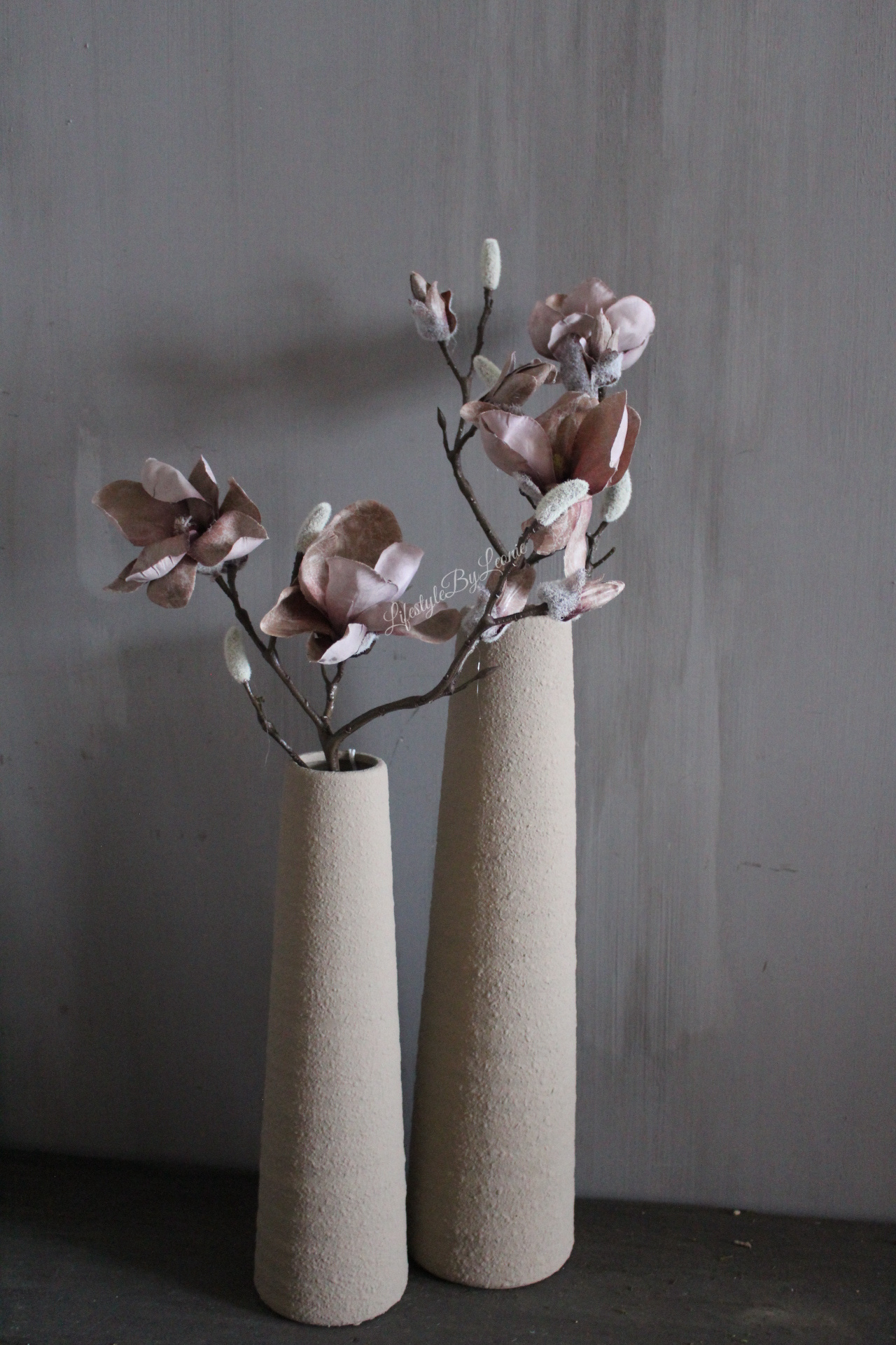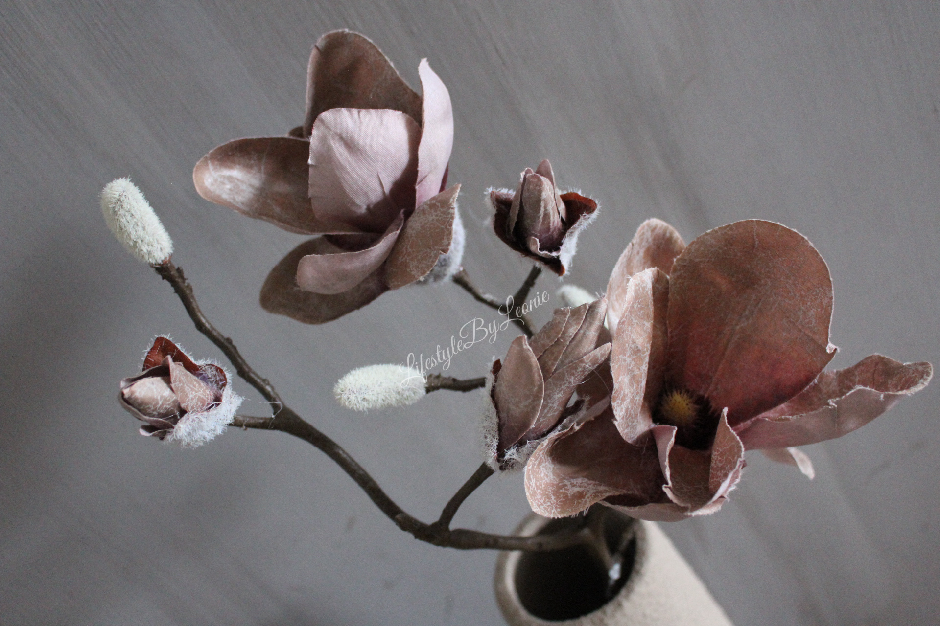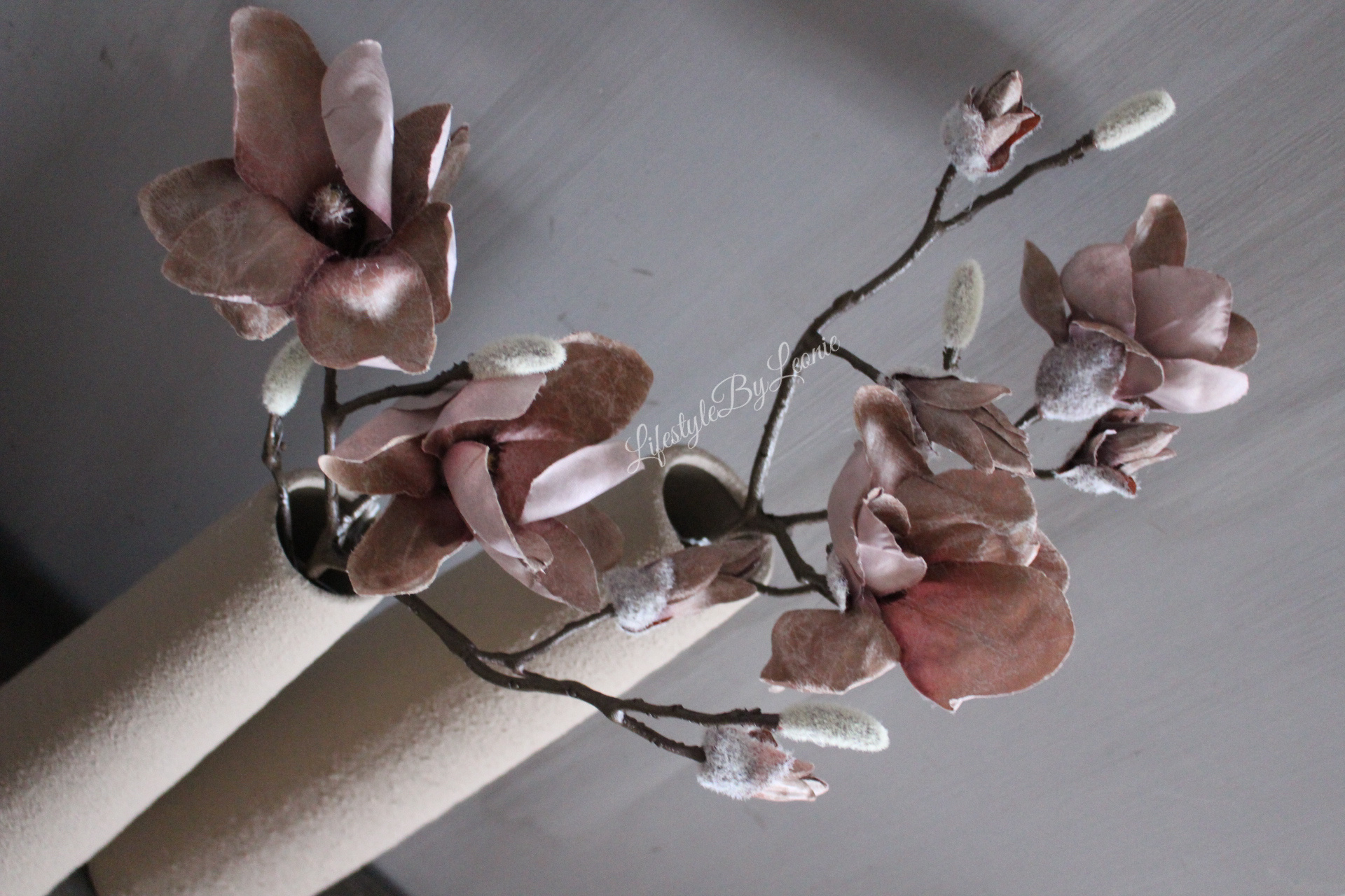 Sobere Magnolia kunsttak met zachtroze powder pink bloemen. Deze kunsttak past perfect in een landelijke of sobere inrichting. De tak is 72 cm lang.