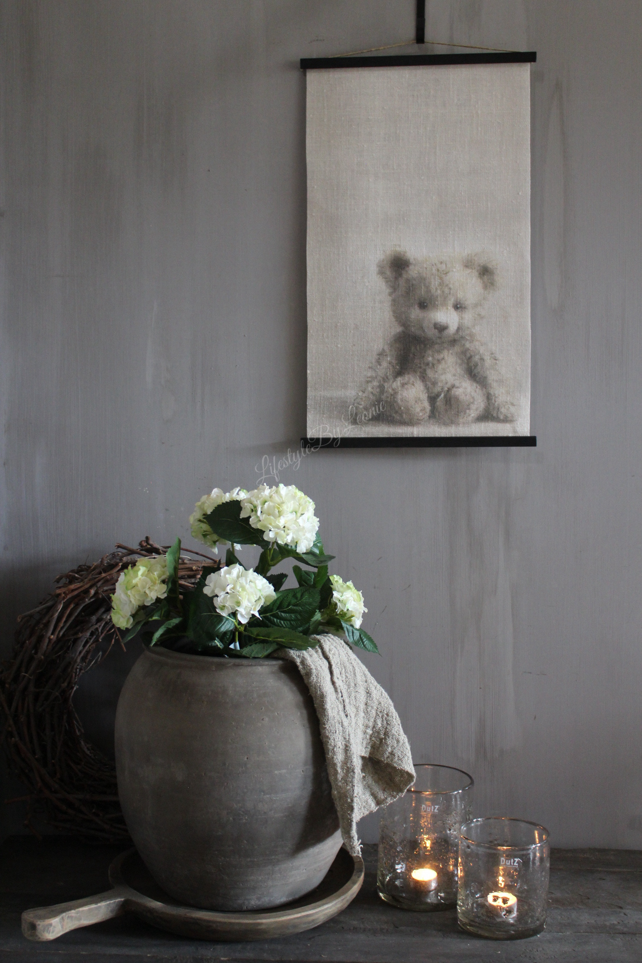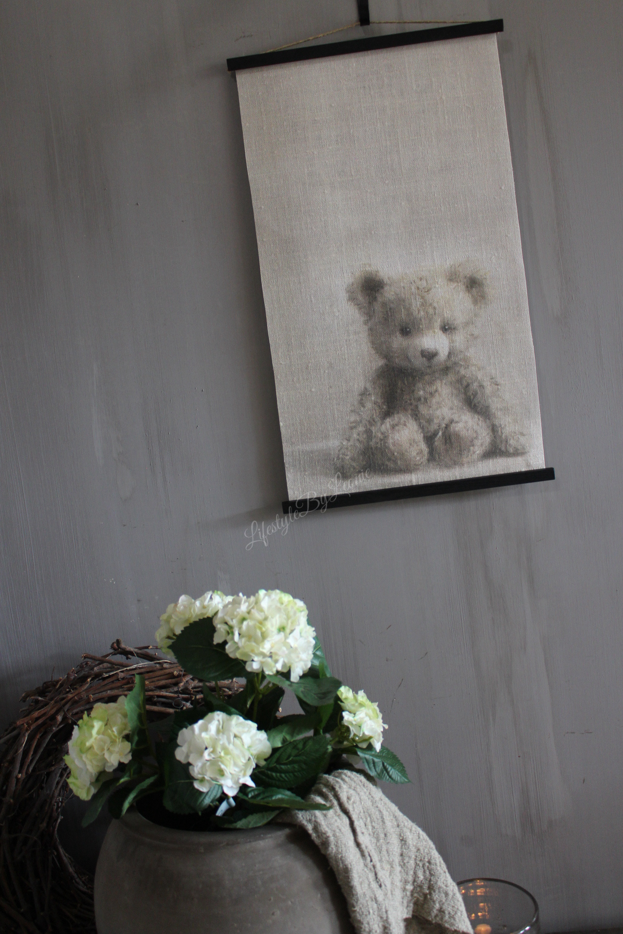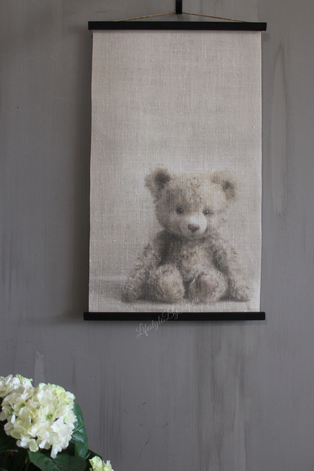 Mooi sober linnen wanddoek met een afbeelding van een lief beertje. Het doek is 60 x 40 cm groot. Leuk voor bijvoorbeeld een kinderkamer.