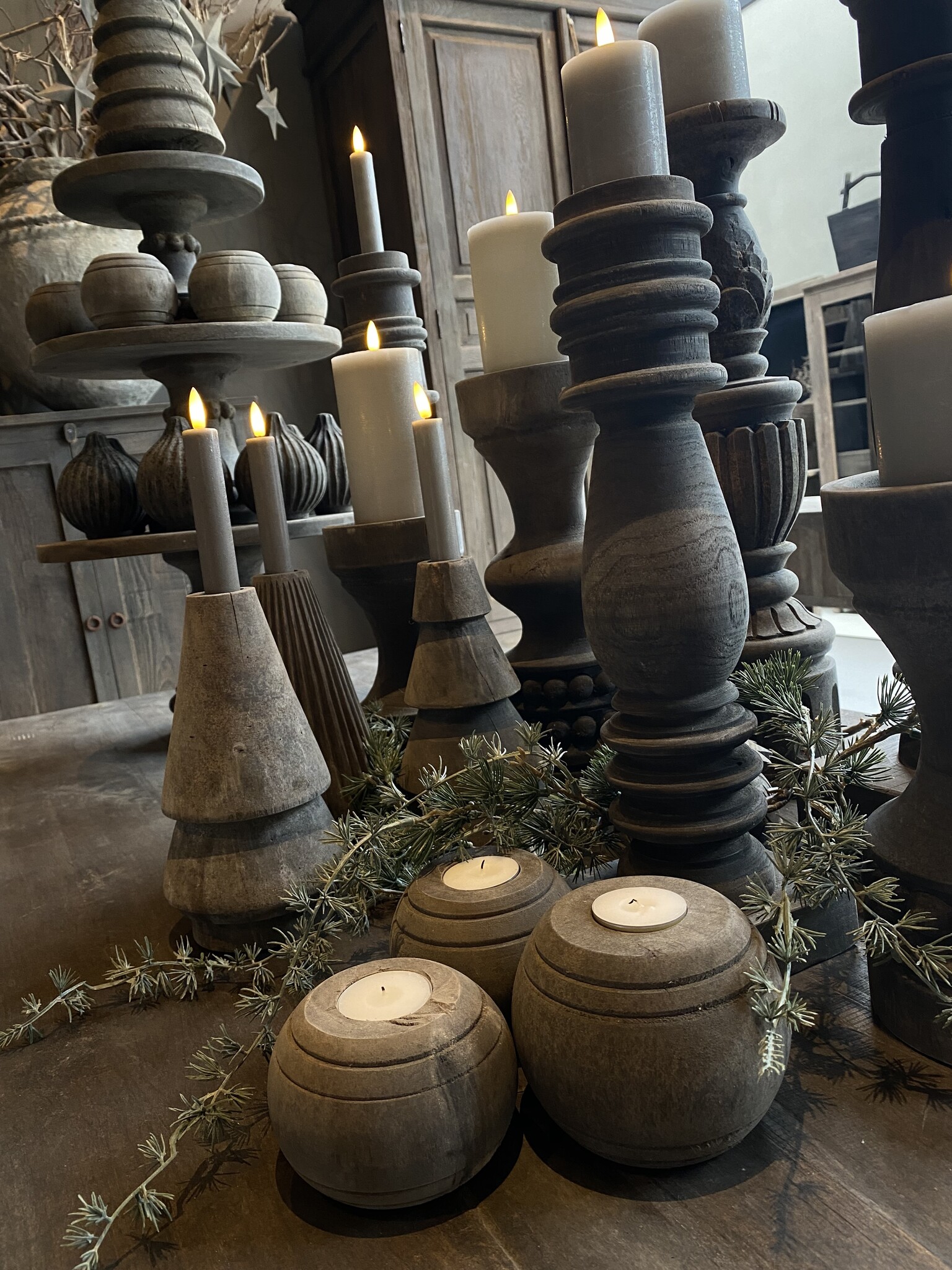 Sobere houten bolvormige waxinelichthouder van LUKSA. De waxinelichthouder is 10 cm groot.