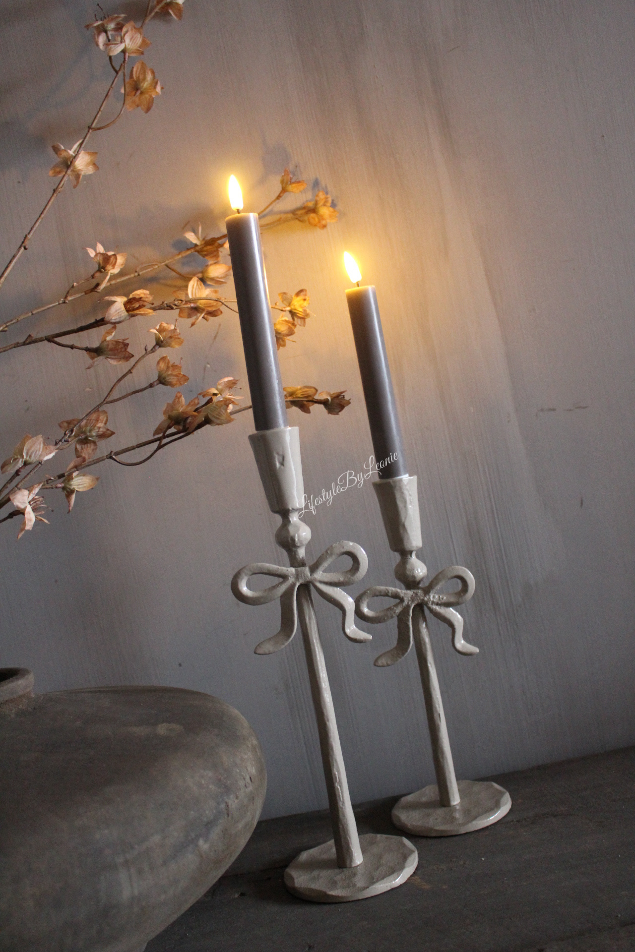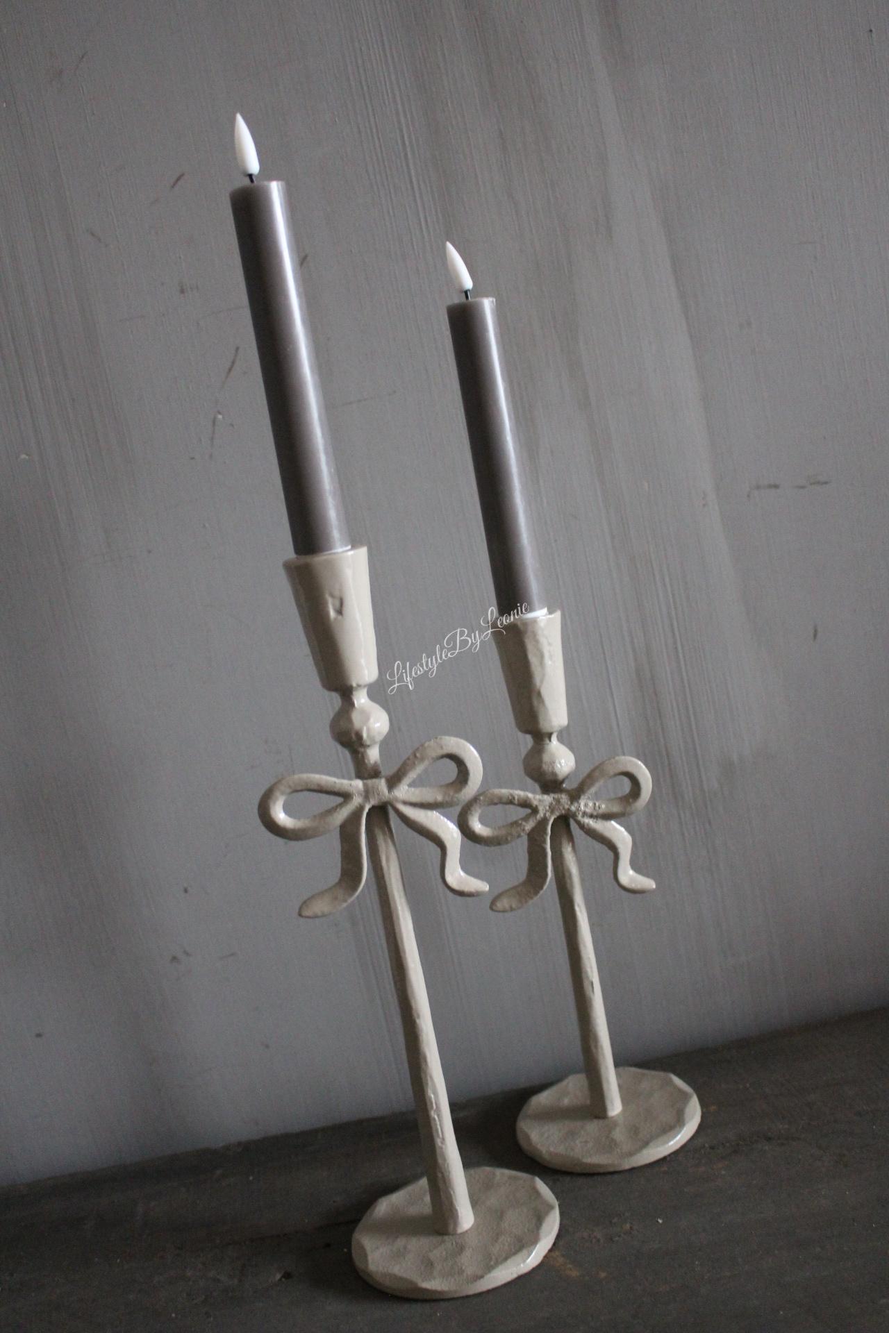 Mooie metalen beige kandelaar met een grappig strikje. De kandelaar is geschikt voor een dinerkaars en is 30 cm hoog.