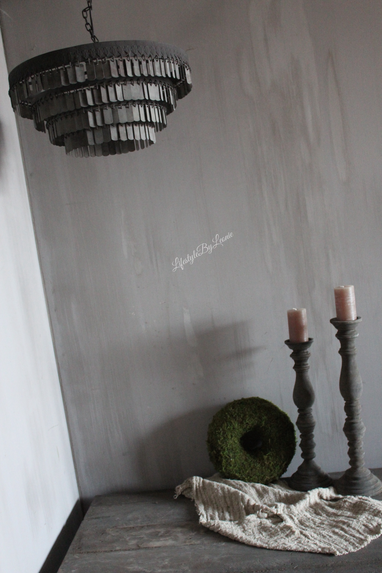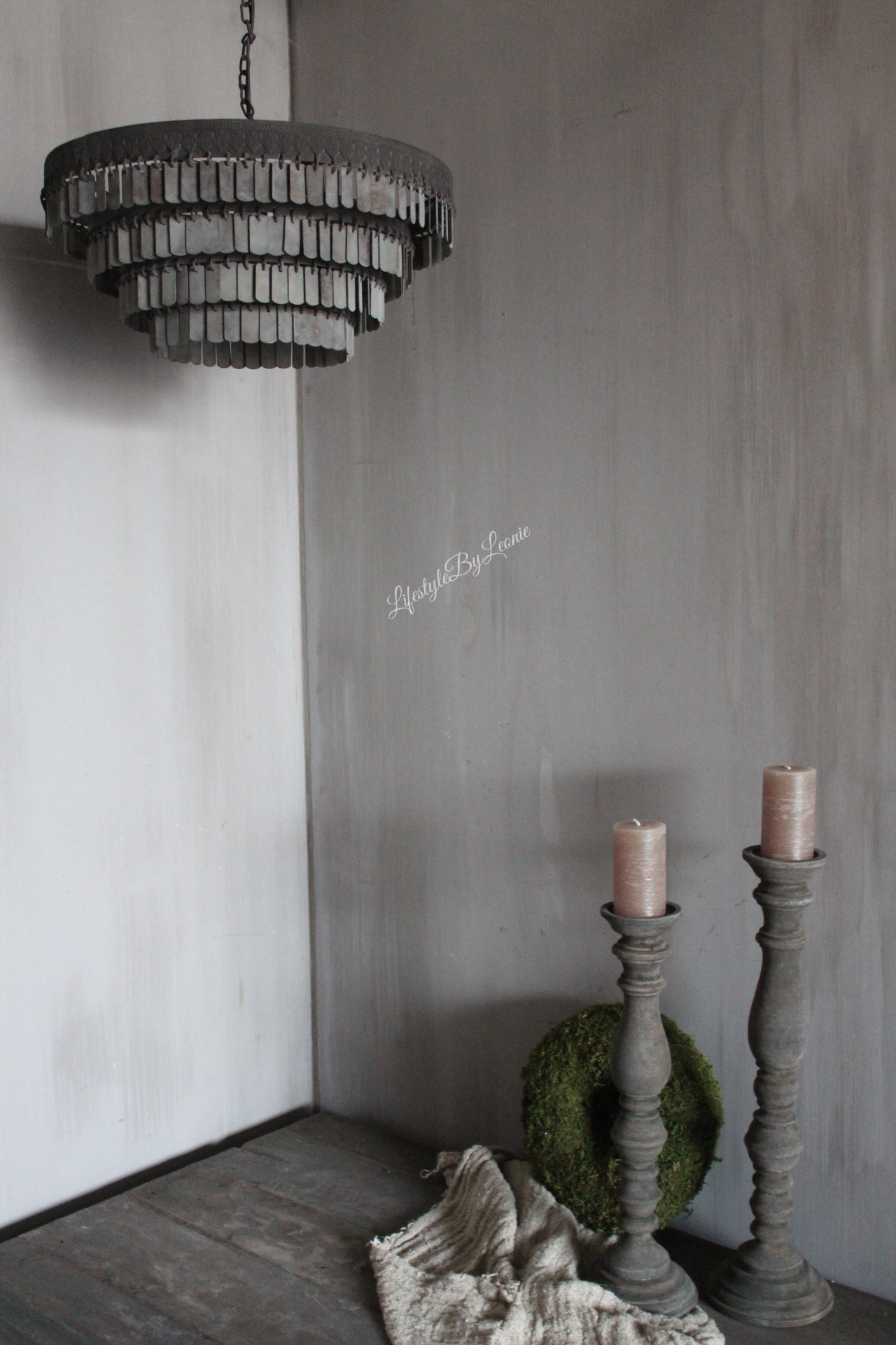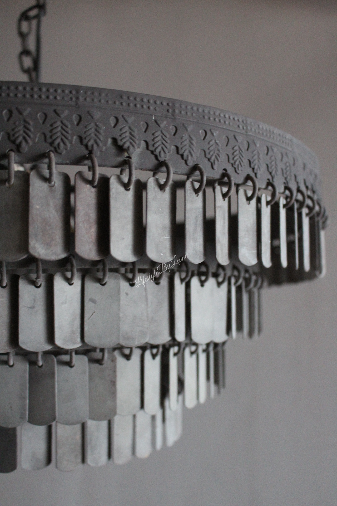 Hanglamp Dhari is een prachtige zware sobere hanglamp in mooie grijze leem kleur. De lamp is gemaakt van metalen plaatjes en is 46 cm groot.