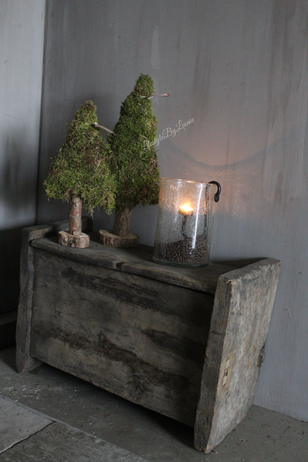 Mooie groene mos boom op voet. Het boompje is 40 cm hoog. Leuk in de vensterbank. Ook mooi met wat LED lichtjes of een streng roestige belletjes.