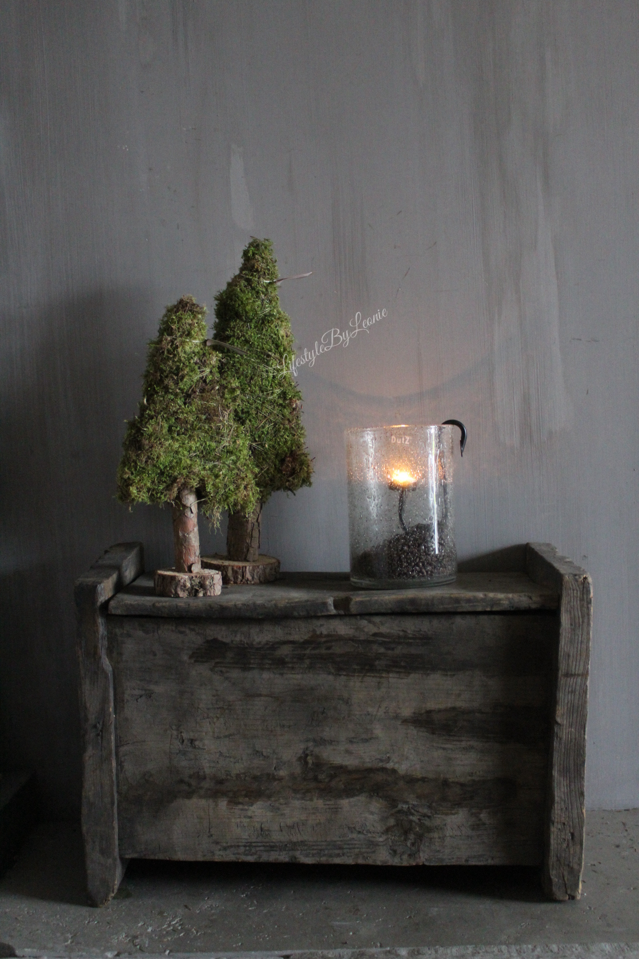 Mooie groene mos boom op voet. Het boompje is 50 cm hoog. Leuk in de vensterbank. Ook mooi met wat LED lichtjes of een streng roestige belletjes.