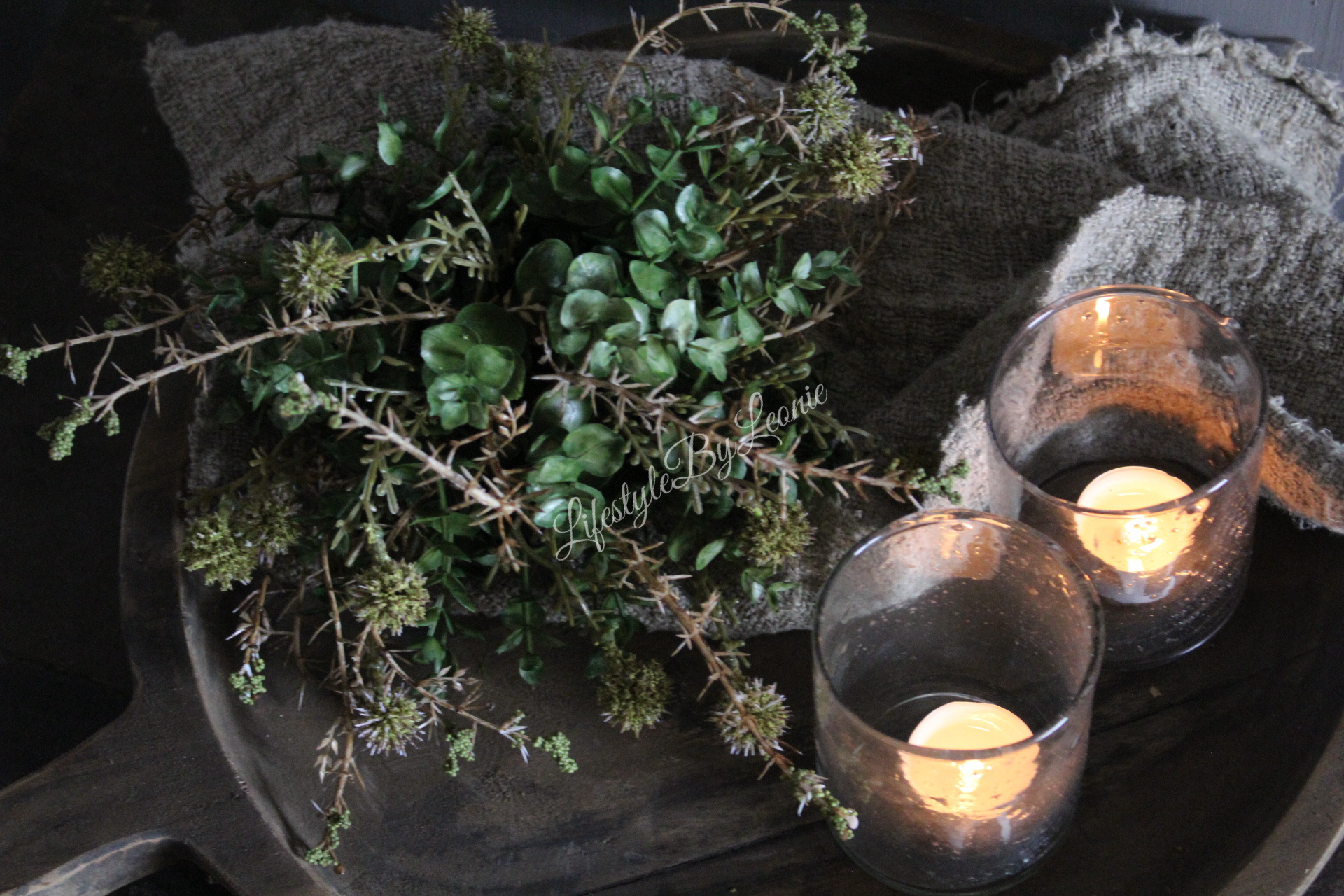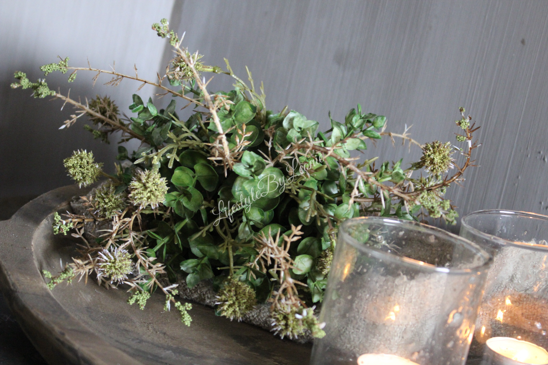 Mooie ronde bol met diverse soorten kunst groen, zoals Eucalyptus en Asparagus. Leuk op een pot of schaal.
