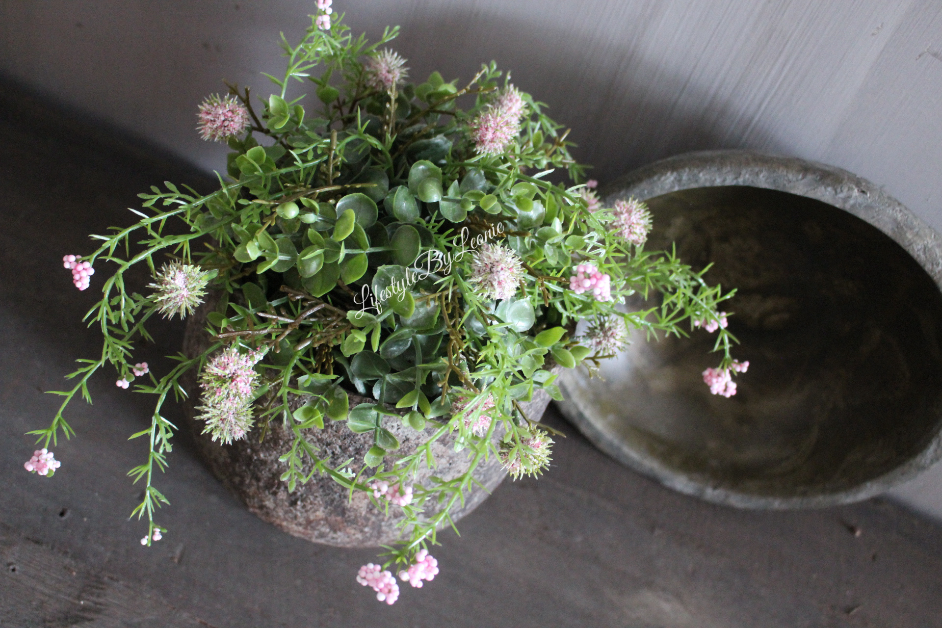 Mooie kunst Eucalyptus bol met kleine roze bloemetjes en Asparagus. Leuk om in een stenen potje te zetten.