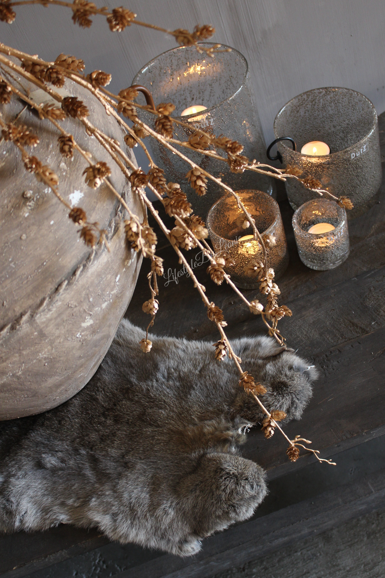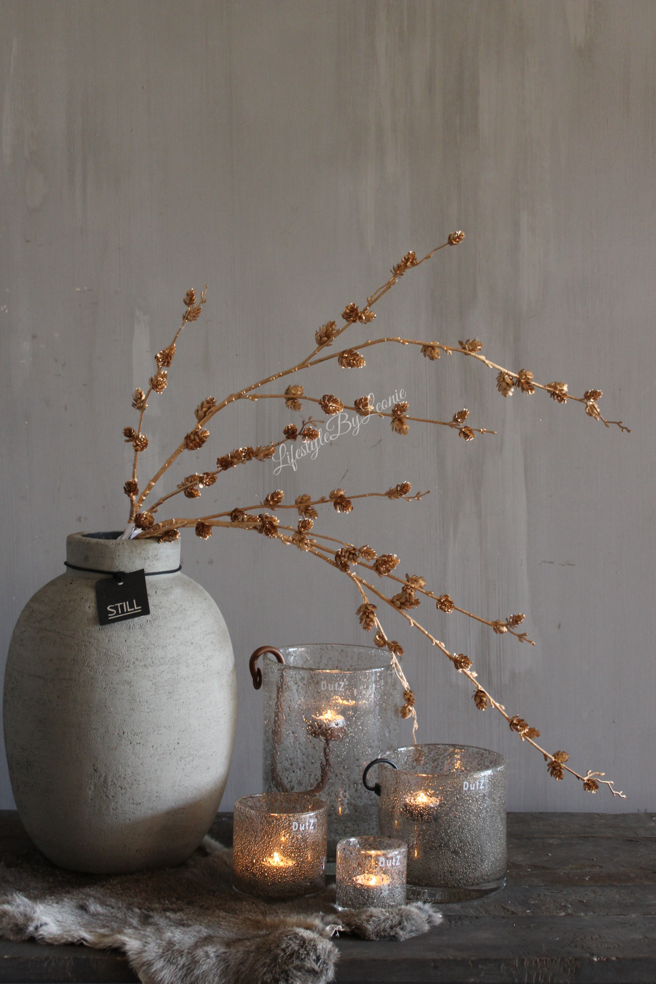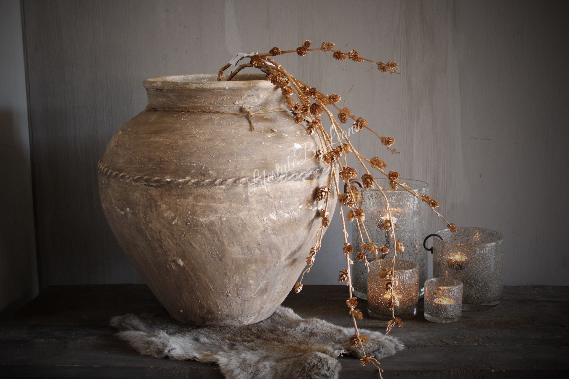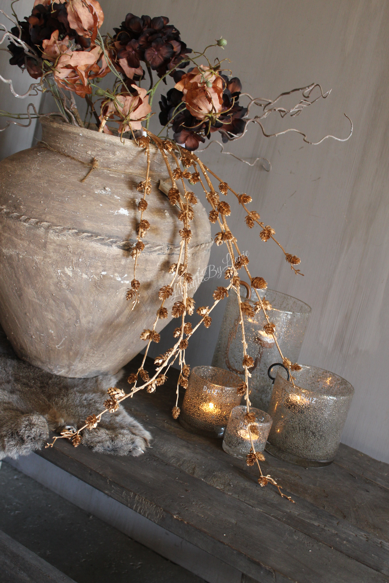 Lange kunsttak met dennenappeltjes in een warme brons kleur. Leuk in een boeket of bijvoorbeeld liggend op een kruik of op de schouw. De tak is 117 cm lang.