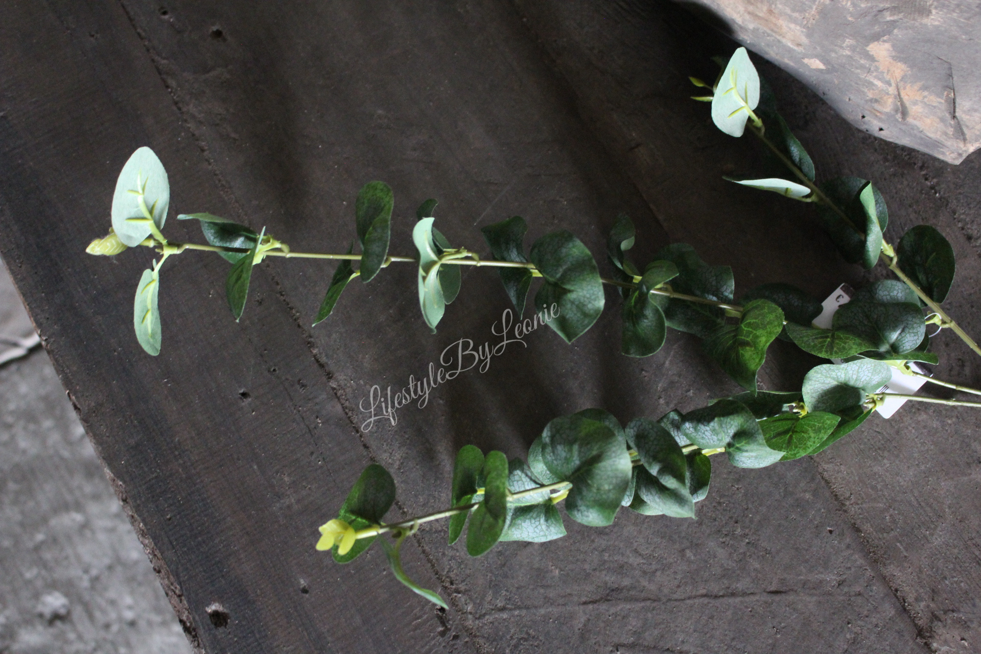 Lange Eucalyptus kunsttak in een donkergroene kleur. De tak is 75 cm groot.