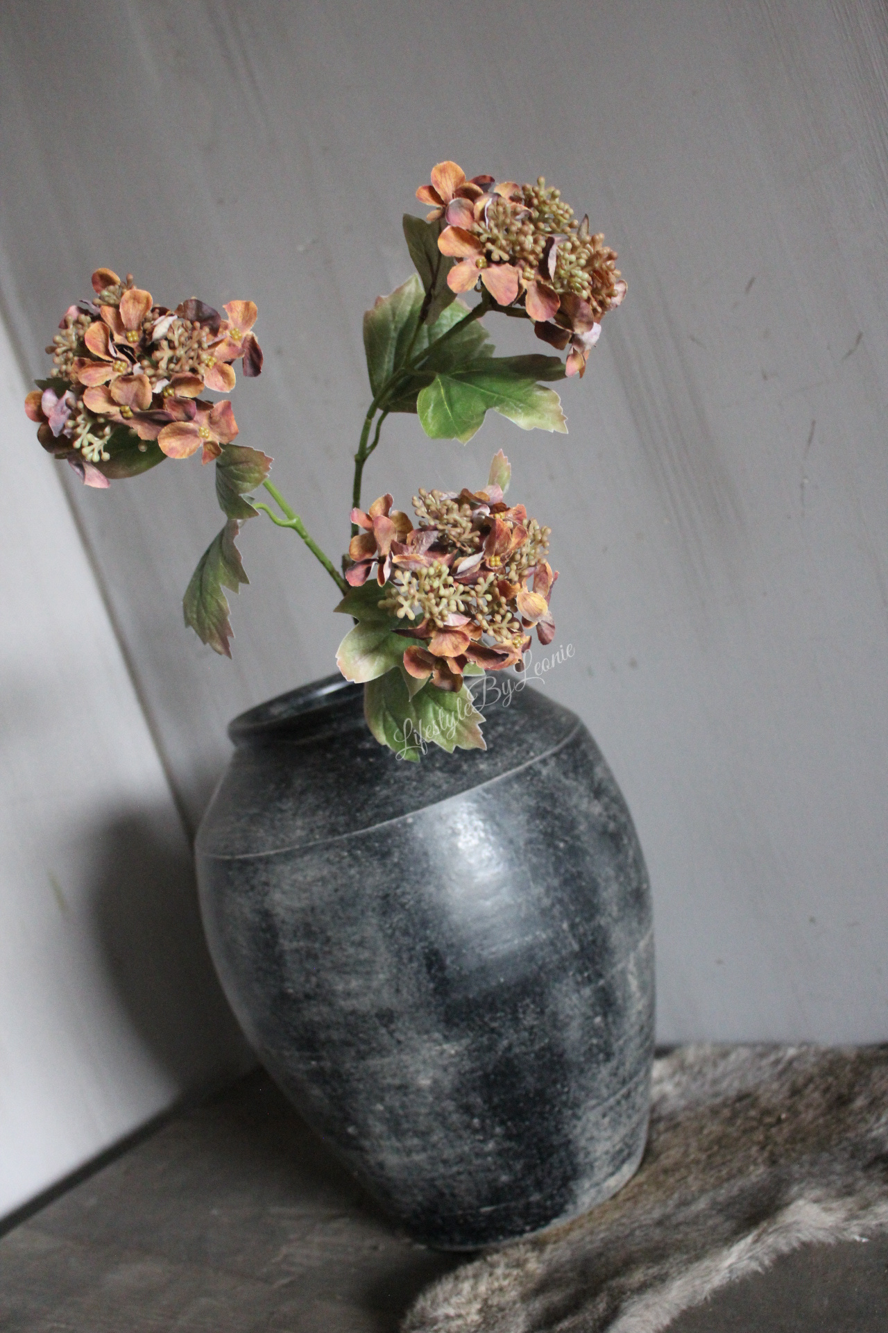 Mooie Hortensia kunsttak met drie bloemen in een bruine caramelkleur. De tak is 82 cm lang.