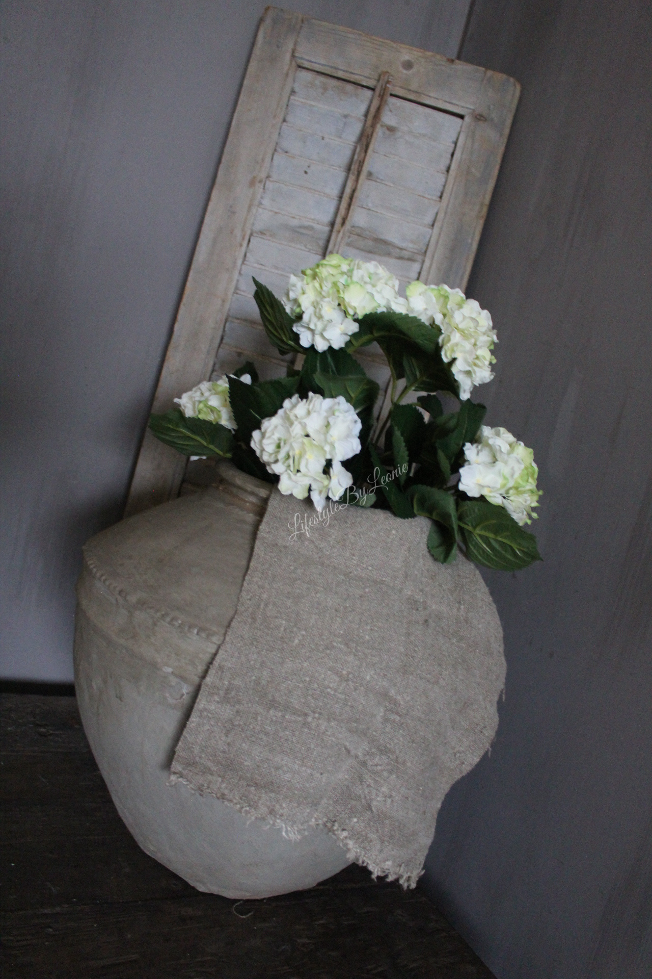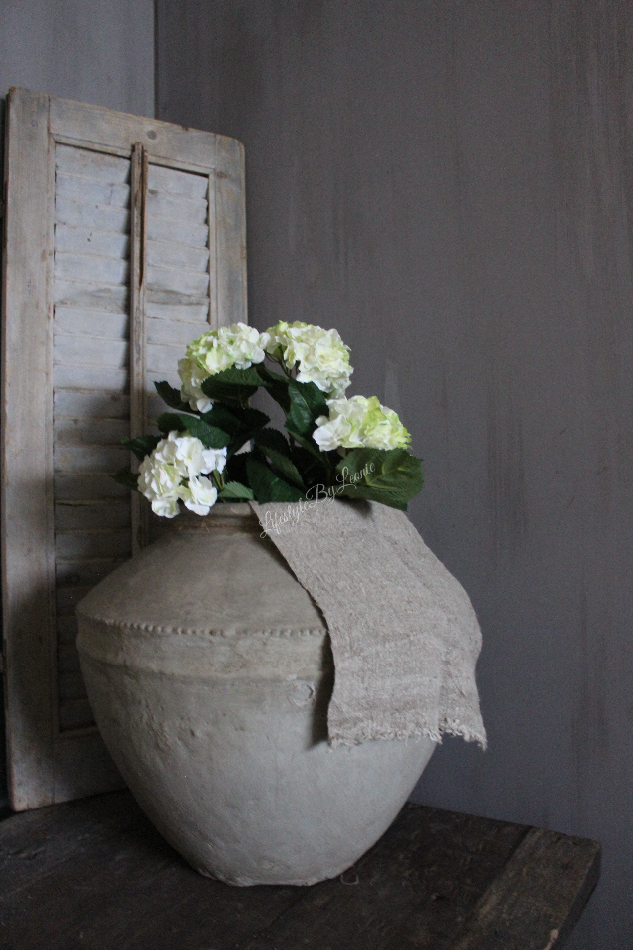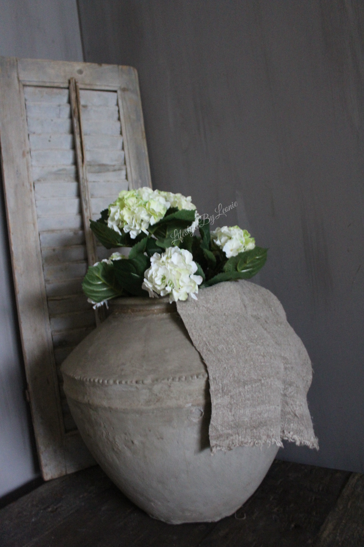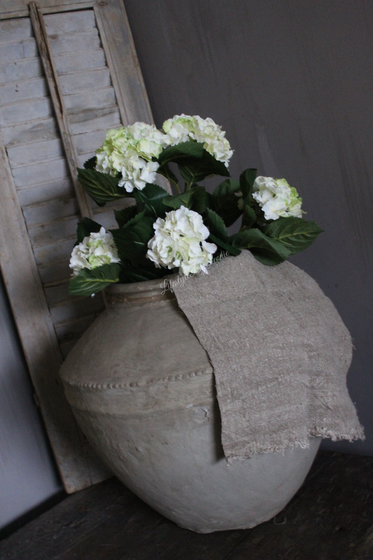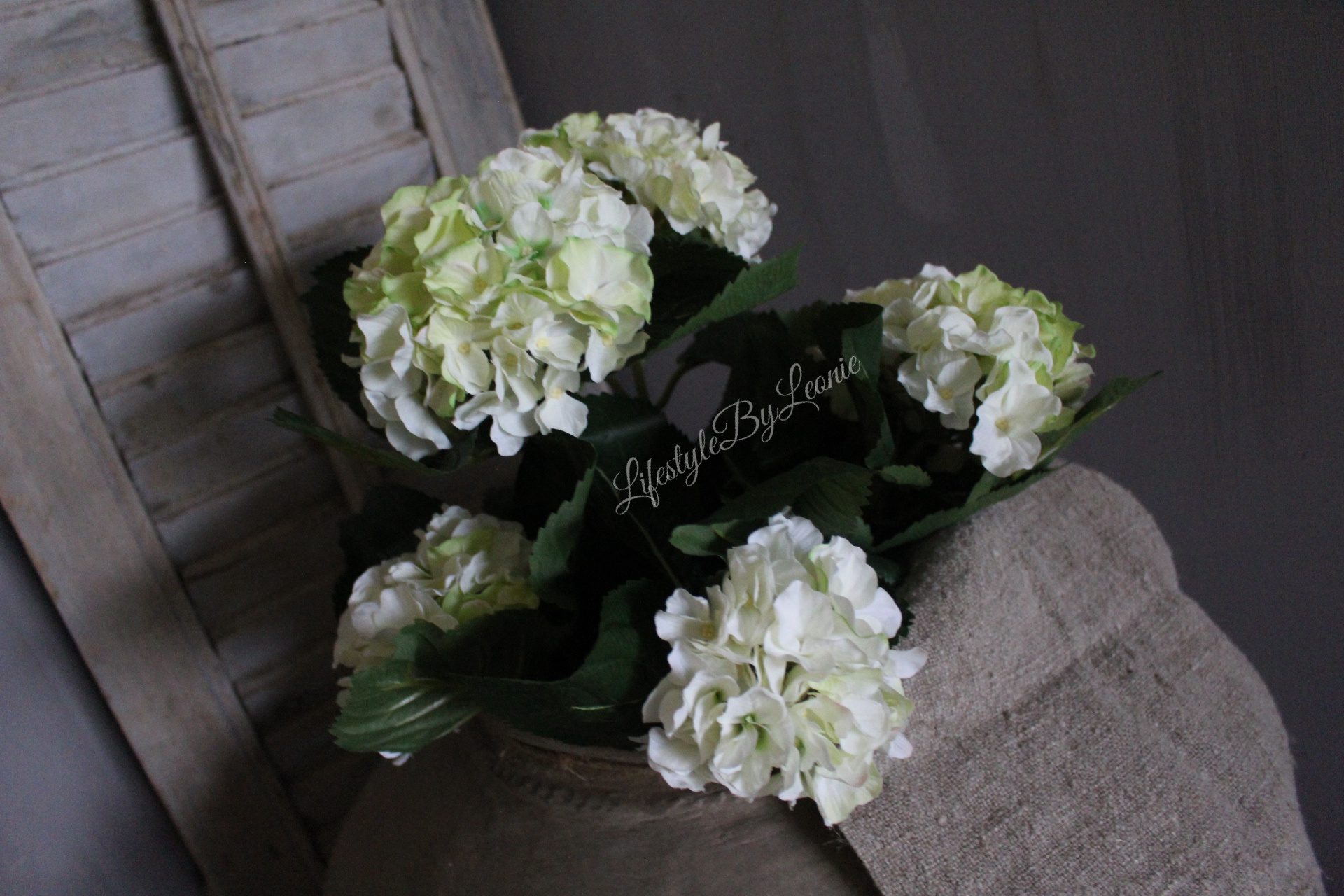 Mooie namaak witte groene kunst Hortensia in een zwart plastic pot. De Hortensia is 36 cm hoog.