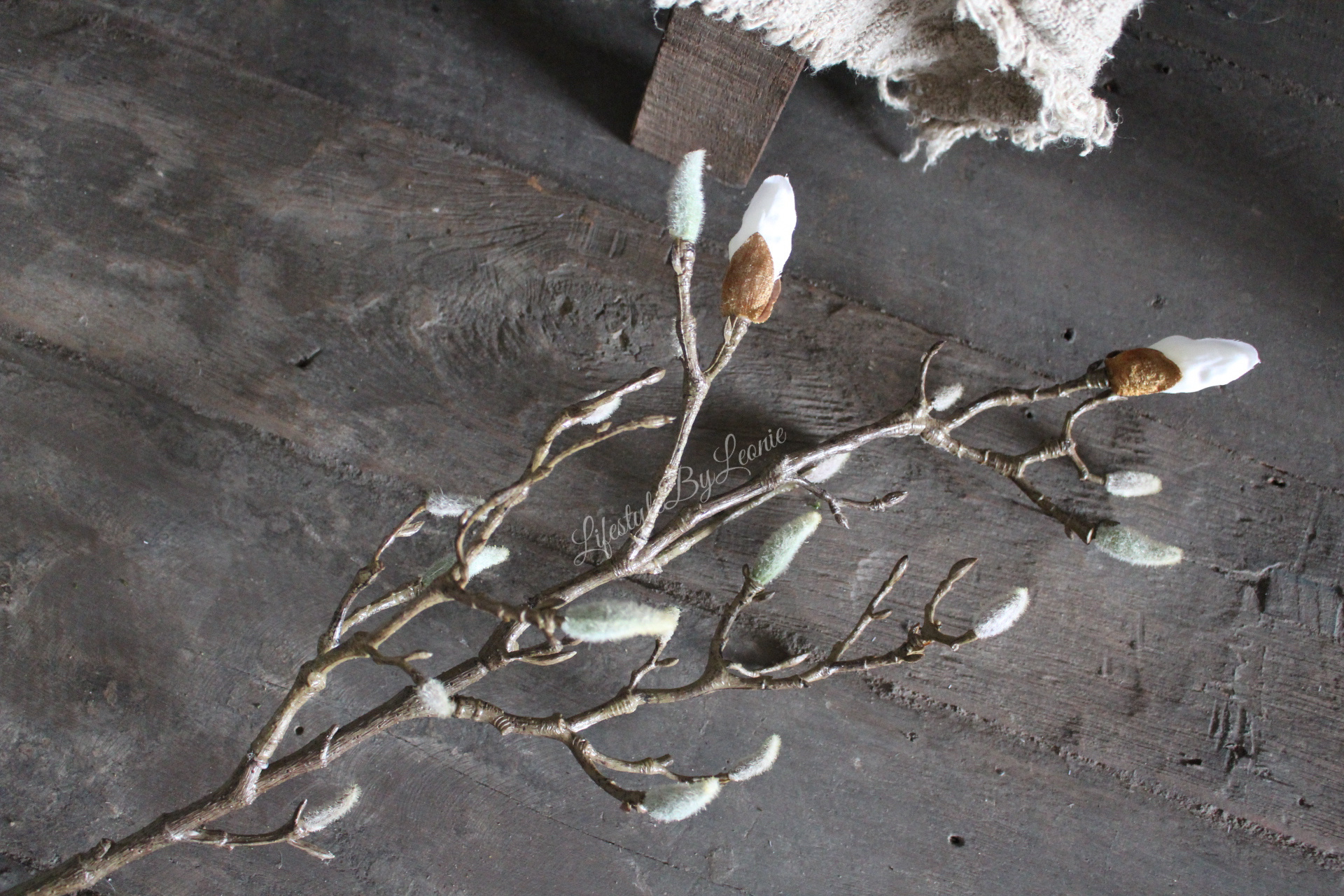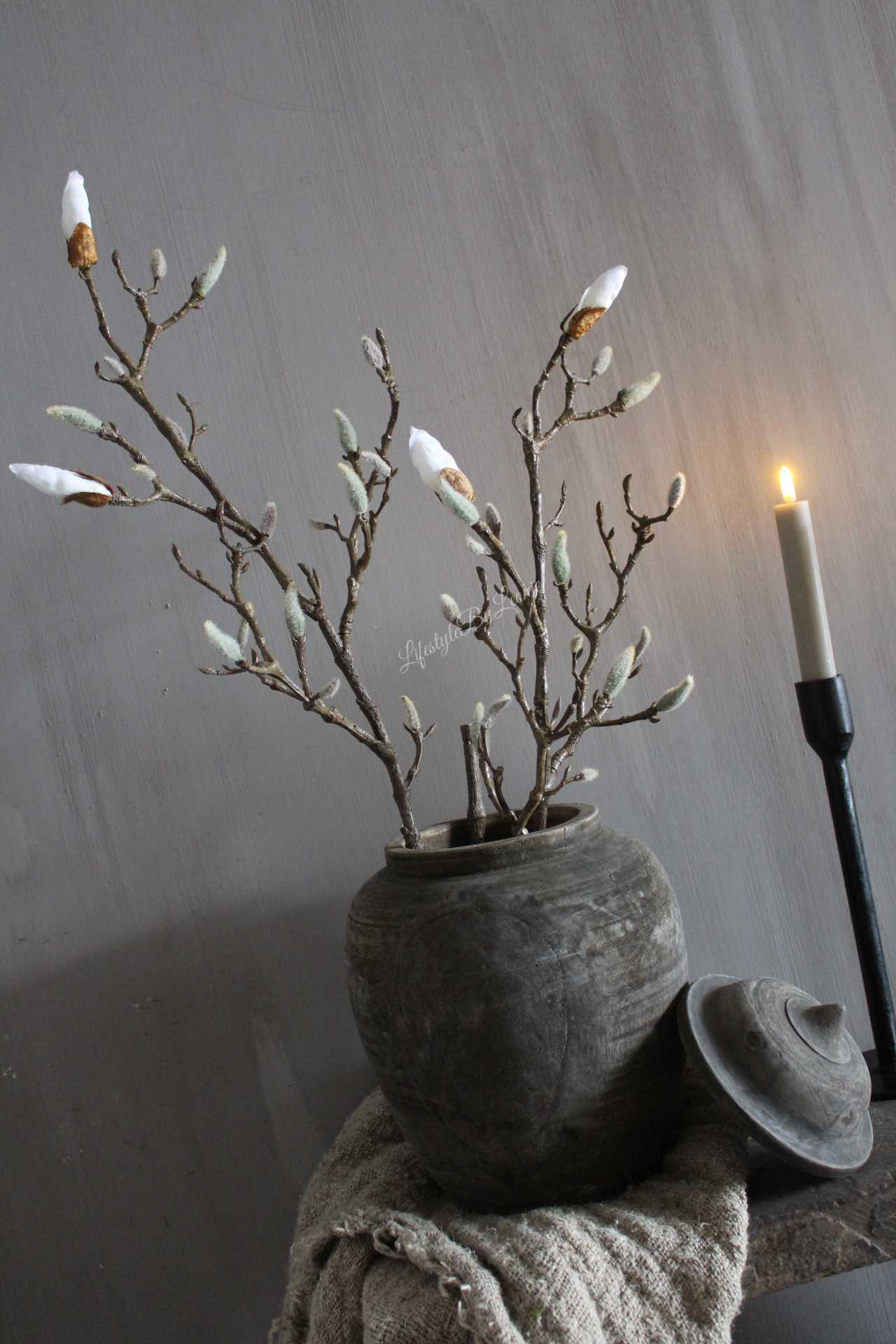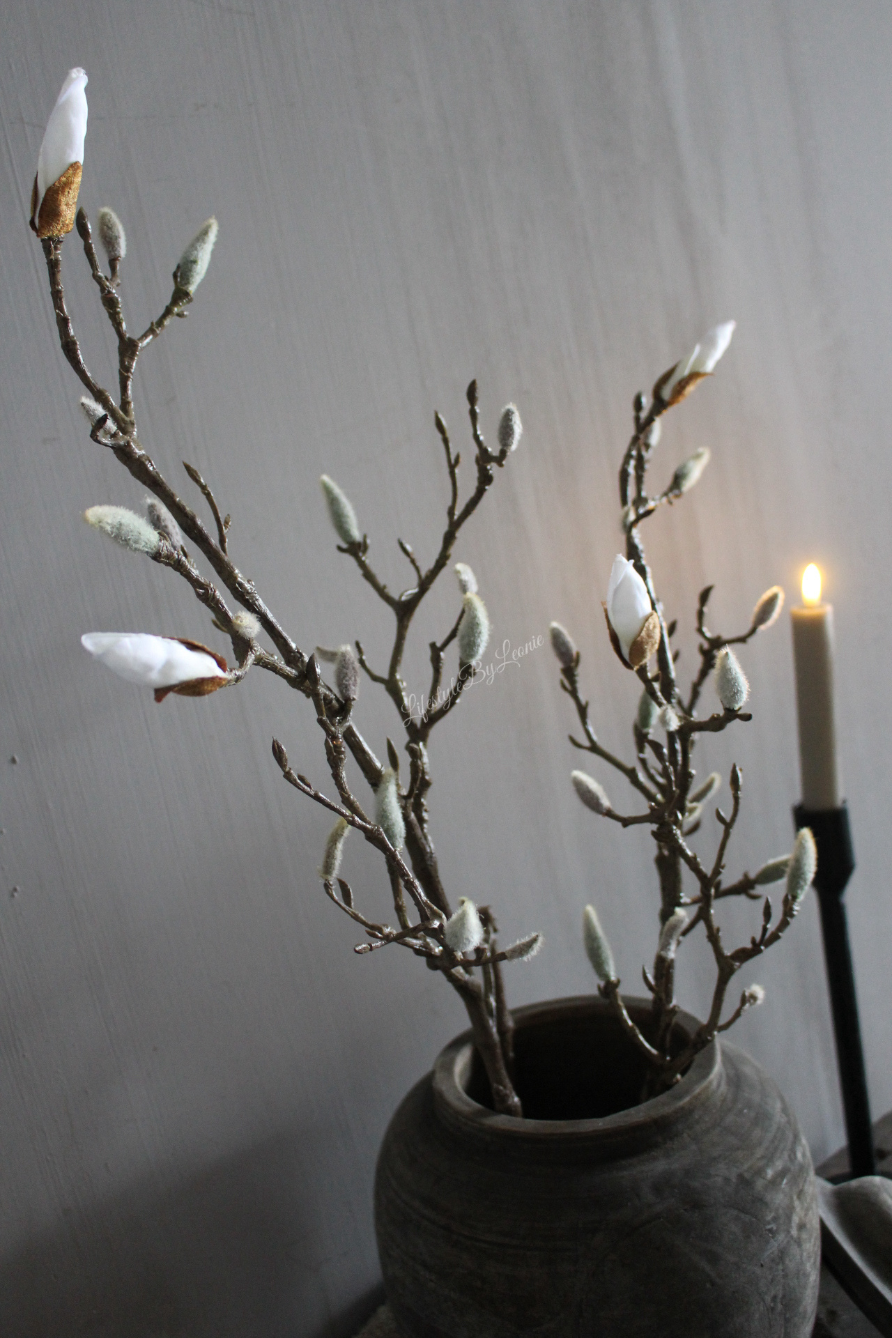 Prachtige Magnolia kunsttak met bloesem in de knop. Niet van echt te onderscheiden. De tak is 70 cm lang. Leuk als voorjaarsdecoratie.