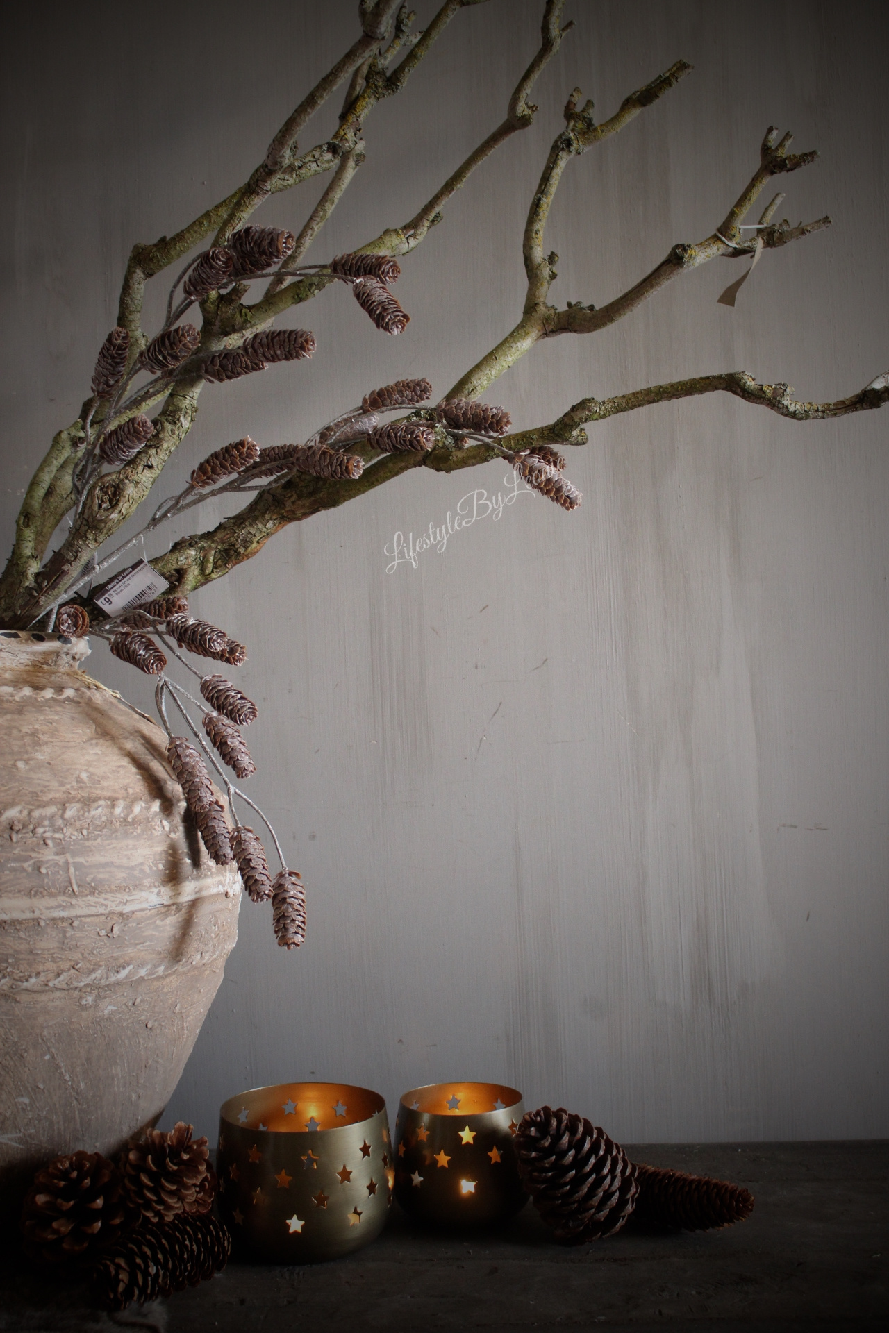 Mooie kunsttak vol met dennenappels. Deze kunsttak heeft een bruine kleur en is 73 cm lang.